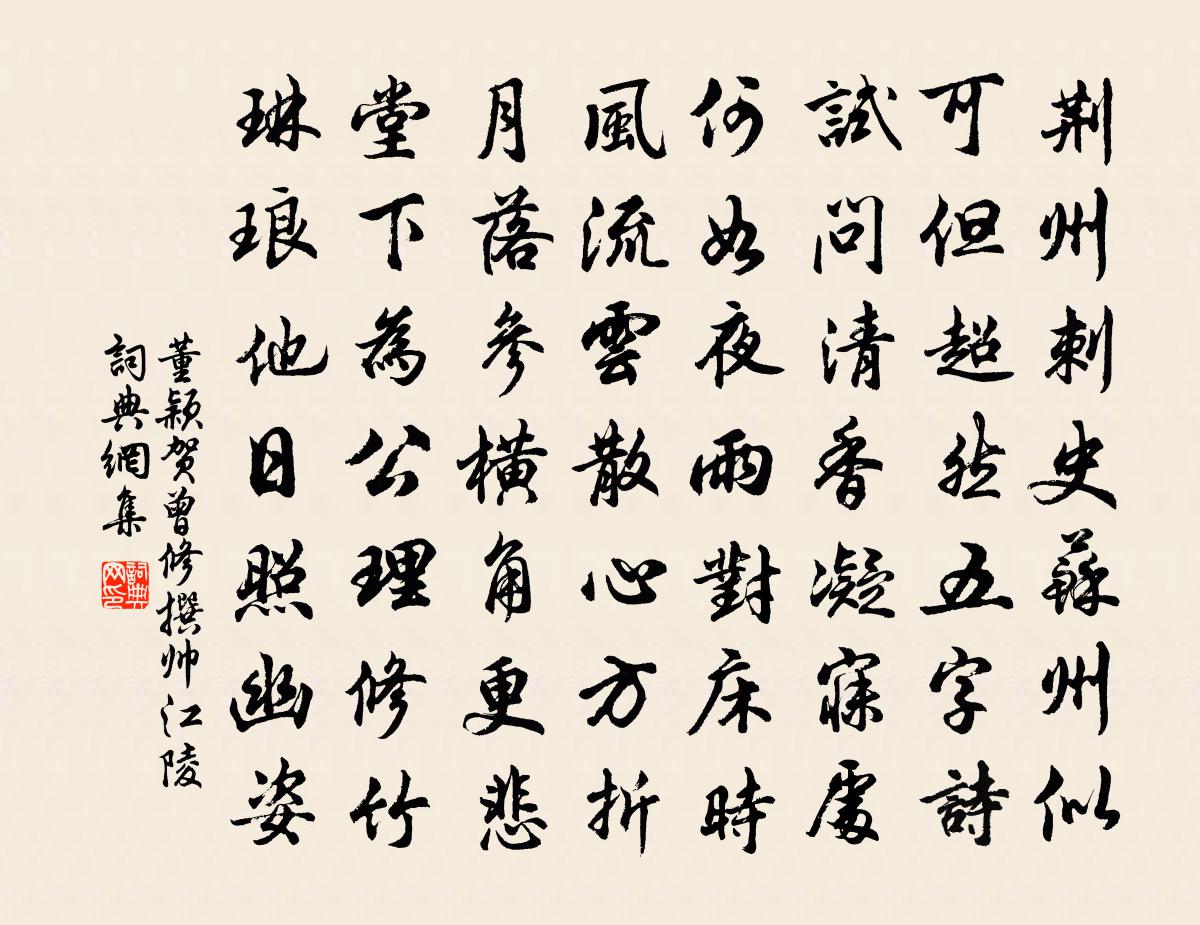 詩詞名句歷史字典書法欣賞書法字典國語詞典說文解字康熙字典古漢語字典標 題 作 者 詩 句 賀曾修撰帥江陵作者:董穎 朝代:宋代賀曾修撰帥江陵原文荊州刺史蘇州似,可但超然五字詩。試問清香凝寐處,何如夜雨對床時。風流雲散心方折,月落參橫角更悲。堂下為公理修竹,琳琅他日照幽姿。詩詞問答問:賀曾修撰帥江陵的作者是誰?答:董穎問:賀曾修撰帥江陵寫於哪個朝代?答:宋代董穎賀曾修撰帥江陵書法欣賞賀曾修撰帥江陵書法作品詩詞推薦太尉王公以九錫命大將軍讓公將還京邑祖餞贈陸雲〔魏晉〕烈文辟公。時惟哲王。闡縱絕期。平顯幽光。內實慎徽。緝熙有臧。出糾方慝。間督不揚。高山峻極。天造芒芒。客意五首陳舜俞〔宋代〕況復淹旅泊,情多秋亦悲。寒雲欲垂野,疏葉不藏梨。斷梗逐流水,歸禽投好枝,徘徊古原上,應有夕陽知。神君歌十首劉克莊〔宋代〕村樂殊音節,蠻謳欠雅馴。老儒無酌獻,歌此送迎神。月宮詞楊巨源〔唐代〕宮中月明何所似,如積如流滿田地。迥過前殿曾學眉,回照長門慣催淚。昭陽昨夜秋風來。綺閣金鋪情影開。藻井道州夏日早訪荀參軍林園敬酬見贈呂溫〔唐代〕高眠日出始開門,竹徑旁通到後園。陶亮橫琴空有意,任棠置水竟無言。松窗宿翠含風薄,槿援朝花帶露繁。山郡醉時歌(贈廣文館博士鄭虔)杜甫〔唐代〕諸公袞袞登台省,廣文先生官獨冷。甲第紛紛厭粱肉,廣文先生飯不足。先生有道出羲皇,先生有才過屈宋。德尊題瘦牛嶺黃公度〔宋代〕自笑年來為食謀,扶攜百指過南州。時平四野皆青草,此地何曾解瘦牛。題曾氏山園十一詠尚絅堂張栻〔宋代〕昔人為己學,深旨妙隱微。三復尚絅章,服膺原無違。新喻縣偶寄彭仁正字李中〔唐代〕經年離象魏,孤宦在南荒。酒醒公齋冷,雨多歸夢長。志難酬國澤,術欠致民康。吾子應相笑,區區道未光。句晃逈〔宋代〕浮生七十今逾九,已是超群越世人。觀華夷圖曹松〔唐代〕落筆勝縮地,展圖當晏寧。中華屬貴分,遠裔占何星。分寸辨諸岳,斗升觀四溟。長疑未到處,一一似曾經。更漏子毛文錫〔唐代〕春葉闌,春恨切,花外子規啼月。人不見,夢難憑,紅紗一點燈。偏怨別,是芳節,庭下丁香千結。宵霧散,曉霞次韻張守勸耕二首陳造〔宋代〕吾徒一笑似關天,離合胡寧付偶然。夢境萍蓬渺雲水,舊遊花柳更風煙。交情繾綣今猶昔,妙句傳抄喜欲顛。廷尉已亥雜詩 119龔自珍〔清代〕作賦曾聞紙貴夸,誰令此紙遍京華。不行官鈔行私鈔,名目何人餉史家。驀山溪李處全〔宋代〕梨花過雨,已是春強半。花惱欲顛狂,興渾在、鞦韆架畔。搔頭無語,斜日上簾櫳,飛上下,語呢喃,又見雙雙燕題齊雲山石室壁唐寅〔明代〕齊雲山與壁雲齊,四顧青山座座低。隔繼往來南北雁,只容日月過東西。論深青色賈似道〔宋代〕顏色深沉似污泥,紫頭青項盡相宜。齒長腹肚兼華白,鬭到秋深花帶歸。交代趙從之善石見和次韻奉答曹彥約〔宋代〕詩來格律辭皆老,卻恨有磚拋不早。只因清興與花同,千詠昔聞今健倒。君家裝額要冰肌,我圃耐寒夸合抱。秀色山茶郭印〔宋代〕嚴冬能獨秀,渾不藉春風。葉自經霜碧,花應斗日紅。望中幾眩眼,高處欲燔空。安得栽培手,移根向邑中。寄張徵古沈如筠〔唐代〕寂歷遠山意,微冥半空碧。綠蘿無冬春,彩雲竟朝夕。張子海內奇,久為岩中客。聖君當夢想,安得老松石。名句推薦同居長乾里,兩小無嫌猜。李白《長干行二首》 三千丈清愁鬢髮,五十年春夢繁華。喬吉《折桂令·客窗清明》 驚鳥去無際,寒蛩鳴我傍。馬戴《楚江懷古三首》 悲歡離合總無情。一任階前、點滴到天明。蔣捷《虞美人·聽雨》 秋在水清山暮蟬,洛陽樹色鳴皋煙。王昌齡《送狄宗亨》 此夜曲中聞折柳,何人不起故園情。李白《春夜洛城聞笛 / 春夜洛陽城聞笛》 賞當其勞,無功者自退;罰當其罪,為惡者戒懼。吳兢《貞觀政要·卷三·論擇官》 害人之心不可有,防人之心不可無!佚名《增廣賢文·下集》 莫道不銷魂,簾卷西風,人比黃花瘦。李清照《醉花陰·薄霧濃雲愁永晝》 不似當時,小橋沖雨,幽恨兩人知。周邦彥《少年游·朝雲漠漠散輕絲》