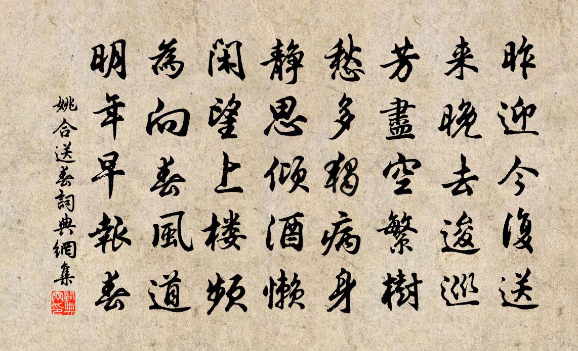 詩詞名句歷史字典書法欣賞書法字典國語詞典說文解字康熙字典古漢語字典標 題 作 者 詩 句 送春作者:姚合 朝代:唐代送春原文昨迎今復送,來晚去逡巡。芳盡空繁樹,愁多獨病身。靜思傾酒懶,閒望上樓頻。為向春風道,明年早報春。詩詞問答問:送春的作者是誰?答:姚合問:送春寫於哪個朝代?答:唐代問:送春是什麼體裁?答:五律姚合送春書法欣賞送春書法作品注釋全唐詩:卷498-34詩詞推薦與微之同賦梅花得香字三首王安石〔宋代〕淺淺池塘短短牆,年年為爾惜流芳。向人自有無言意,傾國天教抵死香。須裊黃金危欲墮,蒂團紅蠟巧能裝。嬋娟侍嘉言叔溪行和其韻陳文蔚〔宋代〕山下江清水見沙,杖頭沽醉酒旗家。多情 * 知人意,故放籬邊三四花。銅雀妓何遜〔南北朝〕秋風木葉落。蕭瑟管弦清。望陵歌對酒。向帳舞空城。寂寂檐宇曠。望飄帷幔輕。曲終相顧起。日暮松柏聲。秋懹陸游〔宋代〕昨者風雨過,浩然天地秋。年光雙雪鬢,生計一漁舟。賣藥來查浦,聽猿到沃洲。平生畏暑毒,八月記初游。【正宮】端正好吳昌齡〔元代〕美妓墨點柳眉新,酒暈桃腮嫩,破春嬌半顆朱唇,海棠顏色紅霞韻。宮額芙蓉印。【滾繡球】藉絲裳翡翠裙,芭蕉陳晦父赴十三韻戴表元〔宋代〕古人取遠士,得一以為豪。江左貢千百,選掄今始勞。占對混童廝,趨蹌偕吏曹。以茲寓繩準,棄髓索皮毛。遂乃寄劉蘇州白居易〔唐代〕去年八月哭微之,今年八月哭敦詩。何堪老淚交流日,多是秋風搖落時。泣罷幾回深自念,情來一倍苦相思。同年送知殿釋慧空〔宋代〕人人盡有光明,只恐點時不到。試攜投子油瓶,一一與伊按過。次韻張太博得余所遺二程先生集辯二程戲邵子魏了翁〔宋代〕文字未科斗,圖書未龜龍。粲然天地間,此理觸處逢。是謂象這祖,而為數之宗。吳犧古神聖,先得人所同。文因送宇昭師釋文兆〔宋代〕相見又相別,無言感倍興。諸峰微下雪,一路獨行僧。午飯煙村磬,宵吟石屋燈。他方人請住,又得繼南能。元日次良翰韻黃公度〔宋代〕老去低徊強北游,春來訊息望南州。別離況復年華換,富貴難令少壯留。行李未知何處定,屠蘇還解憶人不。可堪噫田操四章章六句寄呈王介甫王令〔宋代〕誰能采芹,不適有獲。果蓏樹之,則食其實。豈弟君子,孔敬且力。湖南江西道中十首劉克莊〔宋代〕茫茫衰草與雲平,鬥氣千年不復明。惟有多情篷上月,相隨客子過豐城。句邵伯溫〔宋代〕樓外江山無限好,二年能得幾回看。擬古張九成〔宋代〕喬松列萬行,知是誰人墓。龜趺表山岡,石馬夾山路。潺潺瀑不秋,蕭蕭白楊暮。蒼黃愁 * ,何物能超寤。人命奉送宋中丞使河源李端〔唐代〕東周遣戍役,才子欲離群。部領河源去,悠悠隴水分。笳聲悲塞草,馬首渡關雲。辛苦逢炎熱,何時及漢軍。挽陸運使詩項安世〔宋代〕八秩公何憾,淋浪我自悲。向來淮士里,最得阜陵知。故國人誰識,長身帝所思。竟隨龍馭去,應赴白雲期。致仕後即事陸游〔宋代〕一生病鶴寄樊籠,此去鴻冥萬里空。未論蓴羹與羊酪,新粳要勝太倉紅。青春能幾何趙孟堅〔宋代〕青春能幾何,青春能幾何。蒼髯紺發看成皤。亦有紅顏嫩於花,東風馳道屬誰家。可道光陰流電轉,草上霜飛峭如內道場僧弘紹賈島〔唐代〕麟德燃香請,長安春幾回。夜閒同像寂,晝定為吾開。講罷松根老,經浮海水來。六年雙足履,只步院中苔。名句推薦香幃風動花入樓,高調鳴箏緩夜愁。王昌齡《青樓怨》 樂殊貴賤,禮別尊卑。周興嗣《千字文·全文》 強欲登高去,無人送酒來。岑參《行軍九日思長安故園》 忙忙如喪家之狗,急急如漏網之魚。馮夢龍《醒世恆言·卷十七》 不聞爺娘喚女聲,但聞黃河流水鳴濺濺。佚名《木蘭詩 / 木蘭辭》 富貴多憂,貧窮自在。佚名《增廣賢文·上集》 佳人獨立相思苦。薄袖欺寒脩竹暮。劉鎮《玉樓春·東山探梅》 遙想江口依然,鳥啼花謝,今日誰為主。王瀾《念奴嬌·避地溢江書於新亭》 登舟望秋月,空憶謝將軍。李白《夜泊牛渚懷古》 佳辰強飲食猶寒,隱几蕭條戴鶡冠。杜甫《小寒食舟中作》