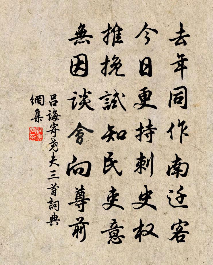 詩詞名句歷史字典書法欣賞書法字典國語詞典說文解字康熙字典古漢語字典標 題 作 者 詩 句 寄堯夫三首作者:呂誨 朝代:宋代寄堯夫三首原文去年同作南遷客,今日更持刺史權。推挽試知民吏意,無因談會向尊前。詩詞問答問:寄堯夫三首的作者是誰?答:呂誨問:寄堯夫三首寫於哪個朝代?答:宋代呂誨寄堯夫三首書法欣賞寄堯夫三首書法作品詩詞推薦滿庭芳盧祖皋〔宋代〕盤谷居成,輞川圖就,便從鷗鷺尋盟。泛溪窈窕,游釣寄高情。尚憶兒童舊地,疏簾外、煙雨新晴。微吟罷,漁歌詠史下謝安陳普〔宋代〕苻氏無良妄自尊,鮮卑羌豎正鯨吞。到頭棋酒消磨晉,莫道桓沖果失言。梨花陸游〔宋代〕粉淡香清自一家,未容桃李占年華。常思南鄭清明路,醉袖迎風雪一杈。山居臥疾廣利大師見訪崔道融〔唐代〕桐谷孫枝已上弦,野人猶臥白雲邊。九天飛錫應相誚,三到行朝二十年。六和劉克莊〔宋代〕對策南宮恥詭隨,聊攄腹憤發胸奇。並驅何異牛同驥,獨步方知虎畏羆。罰汝業儒磨鐵硯,輸它擁妓寫烏絲。區區詩似來石門風少野陳著〔宋代〕出林危世是亨途,道眼相逢菜味腴。愈契大顛非為佛,坡知老印本來儒。攜晴雪瀑藤花路,話舊青鐙柏子廬。萬事臥病雜題陸游〔宋代〕鷗鷺馴亭沼,琴書悅性靈。身叨鄉祭酒,孫為國添丁。煙浦收菰菜,秋山斸茯苓。虛名吾所薄,未應少微星。春雨王鎡〔宋代〕綠樹江南啼子規,落花流水洗胭脂。無情風雨朝朝惡,誤卻歸來海燕遲。再用韻三首裘萬頃〔宋代〕病僧行腳歸來後,萬事無心每閉寮。日射竹窗風葉亂,煙凝香鼎篆紋消。滿江紅(九日冶城樓)方岳〔宋代〕且問黃花,陶令後、幾番重九。應解笑、秋崖人老,不堪詩酒。宇宙一舟吾倦矣,山河兩戒天知否。倚西風、無奈劉氏山方信孺〔宋代〕一徑縈紆夾粉牆,向來台館化僧房。周遭老木依然在,曾見劉家偽帝王。郭補生朝李石〔宋代〕汾陽家世郎官星,百里隱隱聞雷聲。德人所至有別樣,不向尺箠求能名。上官嗔罵吏束濕,日下廩庾堆如京。此時舍南雜興陸游〔宋代〕莎徑依山曲,柴扉並水開。不因行藥出,即為覓詩來。戒婢挑蔬甲,催兒斸芋魁。隨宜也能飽,漂母未須哀。書適陸游〔宋代〕架竹苫茅屋數椽,推開窗戶即江天。微飢未遽愁長日,小疾何妨度厄年。孤鶴入秋偏警露,斷山欲雨自生煙。囊中偈頌一百二十三首釋崇岳〔宋代〕第七個沒尾巴,不落群隊獨露爪牙。擬心湊泊終難見,須信蓮開火里花。七寶玲瓏 繼重陽韻馬鈺〔元代〕至愚至魯,怎曉妙中玄。便再拜、告風仙。口訣金身長丈六,二十八宿會聖賢。此理方知合自然。坎虎離龍,蟠繞風止范成大〔宋代〕收盡狂飆卷盡雲,一竿晴日曉光新。柳魂花魄都無恙,依舊商量作好春。梁潔夫幽居林宇靚深畫幽邃不類貴第宛然山林曹勛〔宋代〕堂依山麓淨風煙,松竹窗虛小有天。汲火炷香供佛後, * 燕坐得安禪。減字木蘭花譚處端〔元代〕遇而不悟。可惜惺惺逐欲去。目下蹉跎。教我如今怎奈何。他時若到。悔晚投玄親妙道。早早回修。免向三塗六道自次前韻酬馬奧諸丈見和舒岳祥〔宋代〕得肉鳶歸樹,無魚鶴下田。此中藏世界,他處少人煙。可怪衣偏裻,何妨屐下穿。亂離多少事,史筆若為傳。名句推薦冰骨清寒瘦一枝。玉人初上木蘭時。吳文英《浣溪沙·題李中齋舟中梅屏》 西施越溪女,出自薴蘿山。李白《西施 / 詠薴蘿山》 翠貼蓮蓬小,金銷藕葉稀。李清照《南歌子·天上星河轉》 去年折贈行人遠,今年恨、依然縴手。吳文英《花心動·柳》 世情看冷暖,人面逐高低。施耐庵《水滸傳·第三十七回》 無端更渡桑乾水,卻望并州是故鄉。劉皂《旅次朔方 / 渡桑乾》 四顧山光接水光,憑欄十里芰荷香。黃庭堅《鄂州南樓書事》 久住令人賤,頻來親也疏。佚名《增廣賢文·上集》 草木秋死,松柏獨在劉向《說苑·談叢》 故園東望路漫漫,雙袖龍鍾淚不乾。岑參《逢入京使》