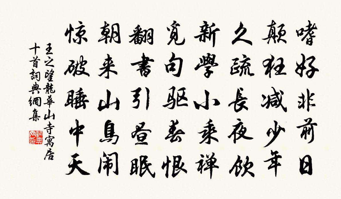 詩詞名句歷史字典書法欣賞書法字典國語詞典說文解字康熙字典古漢語字典標 題 作 者 詩 句 龍華山寺寓居十首作者:王之望 朝代:宋代龍華山寺寓居十首原文嗜好非前日,顛狂減少年。久疏長夜飲,新學小乘禪。覓句驅春恨,翻書引晝眠。朝來山鳥鬧,驚破睡中天。詩詞問答問:龍華山寺寓居十首的作者是誰?答:王之望問:龍華山寺寓居十首寫於哪個朝代?答:宋代王之望龍華山寺寓居十首書法欣賞龍華山寺寓居十首書法作品詩詞推薦湖州歌九十八首 其七十八汪元量〔宋代〕第九筵開盡帝妃,三宮端坐受金卮。須臾殿上都酣醉,拍手高歌舞雁兒。明皇幸蜀圖劉克莊〔宋代〕狼煙起幽薊,鳥道幸岷峨。穆滿尚八駿,隆基惟一騾。失守文皇業,來聽望帝聲。向令曲江在,吾豈有茲行。頌古三十二首釋明辯〔宋代〕高安灘頭百雜碎,象骨峰前眼搭痴。敢道鼓山無鼻孔,藂林千古笑嘻嘻。題曾良臣思堂楊萬里〔宋代〕謝墅新成了,潘輿竟不歸。升堂仰遺像,下拜泣沾衣。友哺烏何在,臥冰魚自肥。夢中環佩響,驚喜覺來非。春園王勃〔唐代〕山泉兩處晚,花柳一園春。還持千日醉,共作百年人。燕居十六首彭龜年〔宋代〕事事皆由命,窮能各有時。窮通吾順處,雖命亦何為。贈王進之趙蕃〔宋代〕走遍東南數十州,皇皇長愧食為謀。閱人政爾亦多矣,有客可能如此不。嘆我漫知耽句僻,如君真復是詩流。相逢次韻蓋宰敖陶孫〔宋代〕大化我蟲臂,常時炙牛心。居然身桔槔,老圃愁漢陰。簡書帝畏人,吏事頗見侵。千里得蠻語,十生生越吟。寧為西湖二首高翥〔宋代〕淺水搖船冷戛沙,平林暝色接棲鴉。湖邊老樹垂垂白,半是梅花半雪花。次韻審知十三日四絕趙蕃〔宋代〕咫尺相望得步過,忽然一雨阻山河。興來逕欲尋君去,數問溪流退幾多。水調歌頭冬至,同行台王子勉中丞,韓君美白樸〔元代〕雲黯霧樹,秋潦淨寒潭。徘徊子隱台下,不見舊書龕。鹿苑空餘蕭寺,蟒穴誰傳郗氏,聊此問瞿曇。千古得欺罔,次韻陳校書送鶴竹筍詩高似孫〔宋代〕竹如鶴腳瘦交加,驚識英英玉露沙。一見已知仙同健,高於越箭更無差。登山有作張栻〔宋代〕上頭壁立起千尋,下列群峰次第深。兀兀籃輿自吟詠,白雲流水此時心。秋宵辭白玉蟾〔宋代〕眇哉青松梢,高高九千尺。兩班森道傍,暮起淒黯色。嗟彼昂藏姿,山林端可惜。浩然呼西風,夜深鳴蕭瑟。此意行香子(永州為魏深甫壽)戴復古〔宋代〕萬古崔嵬,二水漣漪。此江山、天下之奇。太平氣象,百姓熙熙。有文章公,經綸手,把州麾。滿斟壽酒,笑捻梅送祝秀才歸衢州朱慶餘〔唐代〕舊隱縠溪上,憶歸年已深。學徒花下別,鄉路雪邊尋。騎吏陪春賞,江僧伴晚吟。高科如在意,當自惜光陰。太廟侍祠雪霽有作宋祁〔宋代〕喜雪靜氛埃,繁雲即日回。清光動冠劍,餘素著樓台。樹雜瓊枝竦,途平玉轍開。惟應餘兩騎,知是海神來。蠶舍趙汝鐩〔宋代〕每天蠶時候,村村多閉門。往來斷親黨,啼叫禁兒孫。不惜兼旬力,將圖終歲溫。殷勤馬明祝,燈火謹朝昏。贈從弟弘元時為中軍功曹住京詩謝靈運〔南北朝〕子既祗命。餞此離襟。良會難期。朝光易侵。人之執情。{郄[去]阝}景悼心。分手遵渚。傾耳淑音。游道何二山晚包倪氏玉湖程公許〔宋代〕草草盤蔬一酒壺,虎岩小憩轉金與。靜觀生物春風裡,笑拂詩牌劫火余。散策松陰寒悄悄,擷香梅逕雪速速。歸航名句推薦學之乃知,不問不識。王充《論衡·卷二十六·實知篇》 易漲易退山溪水,易反易覆小人心。佚名《增廣賢文·上集》 近淚無乾土,低空有斷雲。杜甫《別房太尉墓》 親戚不附,無務外交。墨子《墨子·02章 修身》 涓流雖寡,浸成江河;爝火雖微,卒能燎野范曄《後漢書·列傳·酷吏列傳》 支離東北風塵際,漂泊西南天地間。杜甫《詠懷古蹟五首·其一》 江南無所有,聊贈一枝春。陸凱《贈范曄詩》 怎不思量,除夢裡、有時曾去趙佶《宴山亭·北行見杏花》 善者不辯,辯者不善。老子《老子·德經·第八十一章》 新葉初冉冉,初蕊新霏霏。謝朓《詠落梅》