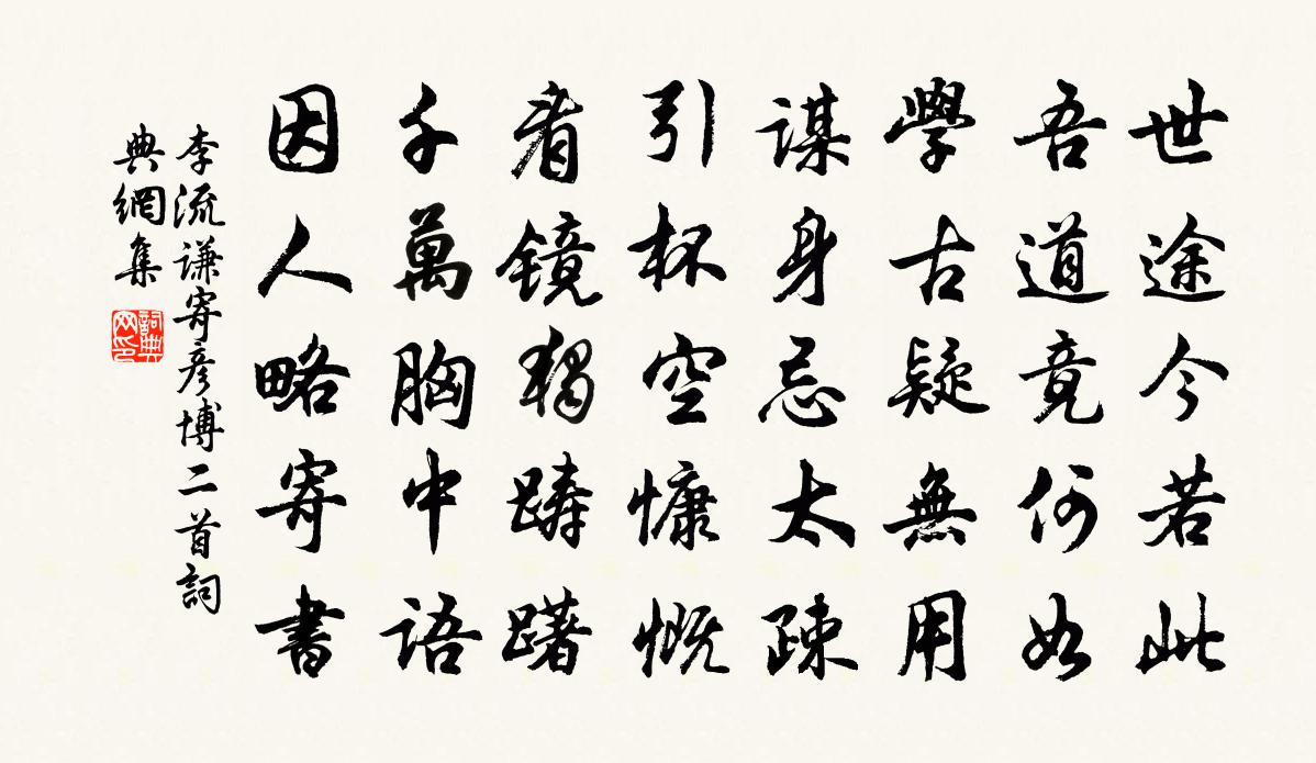 詩詞名句歷史字典書法欣賞書法字典國語詞典說文解字康熙字典古漢語字典標 題 作 者 詩 句 寄彥博二首作者:李流謙 朝代:宋代寄彥博二首原文世途今若此,吾道竟何如。學古疑無用,謀身忌太疎。引杯空慷慨,看鏡獨躊躇。千萬胸中語,因人略寄書。詩詞問答問:寄彥博二首的作者是誰?答:李流謙問:寄彥博二首寫於哪個朝代?答:宋代李流謙寄彥博二首書法欣賞寄彥博二首書法作品詩詞推薦送崔伯陽守潁州孔武仲〔宋代〕聽說州除美,州臨潁水清。風謠帶京洛,湖島似蓬瀛。昔泛扁舟下,今聞太守行。山川應好在,為道旅人情。北歸三首曾鞏〔宋代〕拜拜恩書喜滿顏,馬蹄遙望斗杓還。從今步步行平地,出得千山與萬山。偈頌一百二十三首釋普度〔宋代〕說禪說道,撒土撒沙,半山終不也隨邪。重陽定在九月九,東籬何處無黃花。清暉亭李覯〔宋代〕池亭何處占清暉,只有暉江更向西。山上白雲如有雪,水中明月似無泥。郊原不改春來秀,徑路終憂客到迷。沈約七不堪詩七首宋祁〔宋代〕五不堪,未始臨喪吊。倍重秦失號,禮譏老聾笑。題九龍巖李得之〔宋代〕靄靄雲□爛,岑岑洞穴幽。黃衣無□士,陳跡□千秋。本為征途憩,還因爽氣留。塵緣吾未斷,歸路晚颼飀。山隱竣事海棠正花二首錢時〔宋代〕春風亭館久生埃,不見花開知幾回。日日登山君莫笑,山翁不為海棠來。花光十梅高下隨宜釋師範〔宋代〕樹有高低枝短長,花開隨處恰相當。都緣妙得毫端趣,豎抹橫托總不妨。枯魚過河泣佚名〔兩漢〕枯魚過河泣,何時悔復及。作書與魴鱮,相教慎出入。顏魯公畫像朱翌〔宋代〕結芻續體祭中丞,鬼質何為苦見嗔。千五百年如烈日,二十四州惟一人。朝衣視坎趨前死,羽服行山即此身。賴有木蘭花慢 曉過盧溝劉敏中〔元代〕上盧溝一望,正紅日、破霜寒。盡渺渺飛煙,蔥蔥佳氣,東海西山。依稀玉樓飛動,道五雲深處是天關。柳外弓戈答資政邵諫議見寄二首歐陽修〔宋代〕欲知歸計久遷延,三十篇詩二十年。受寵不思身報效,乞骸惟冀上衰憐。相如舊苦中痟渴,陶令猶能一醉眠。材薄江鷗崔道融〔唐代〕白鳥波上棲,見人懶飛起。為有求魚心,不是戀江水。和人經隋唐間戰處徐夤〔唐代〕孤軍前度戰,一敗一成功。卷旆早歸國,臥屍猶臂弓。草間腥半在,沙上血殘紅。傷魄何為者,五湖垂釣翁。石鼓詩佚名〔先秦〕我車既攻。我馬既同。我車既好。我馬既(左馬右阜)。君子爰獵。爰獵爰游。麀鹿速速。君子之求。彎彎鹵弓。忘憂花吳融〔唐代〕繁紅落盡始淒涼,直道忘憂也未忘。數朵殷紅似春在,春愁特此系人腸。十二時/憶少年佚名〔宋代〕金徒箭、曉漏延長。霄極爛星芒。珠旒絢采,黼袞交章。宸表寢永昂。上交合奠鬯流香。燎揚光。神錫以百祥。壽中秋不見月寄耘老弟虞儔〔宋代〕舉杯邀月且留殘,覆雨翻雲意未闌。自是陰晴難淮擬,莫將懷抱逐悲允。燈前白髮驚秋半,鏡里清光有歲寒。玉斧天壇峰下贈杜錄事白居易〔唐代〕年顏氣力漸衰殘,王屋中峰欲上難。頂上將探小有洞,喉中須咽大還丹。[小有洞在天壇頂上。時杜方煉伏火砂次七八用喜雪韻四首吳潛〔宋代〕也知天女散花難,束帛戈戈幾疋端。富貴何妨還白屋,繁華亦欲傲蒼官。梁山操里聲愁聽,湘水圖中景喜看。爭似名句推薦自是浮生無可說。人間第一耽離別。王國維《蝶戀花·滿地霜華濃似雪》 水晶簾不下,雲母屏開,冷浸佳人淡脂粉。晁補之《洞仙歌·泗州中秋作》 細看茱萸一笑,詩翁健似常年。張可久《風入松·九日》 白白與紅紅,別是東風情味。嚴蕊《如夢令·道是梨花不是》 起來無語理朝妝,寶匣鏡凝光顧敻《虞美人·觸簾風送景陽鍾》 當事者迷,旁觀者清。佚名《增廣賢文·下集》 故國三千里,深宮二十年。張祜《宮詞·故國三千里》 長江千里,煙淡水雲闊。李綱《六么令·次韻和賀方回金陵懷古鄱陽席上作》 一別都門三改火,天涯踏盡紅塵。蘇軾《臨江仙·送錢穆父》 軍合力不齊,躊躇而雁行。曹操《蒿里行》