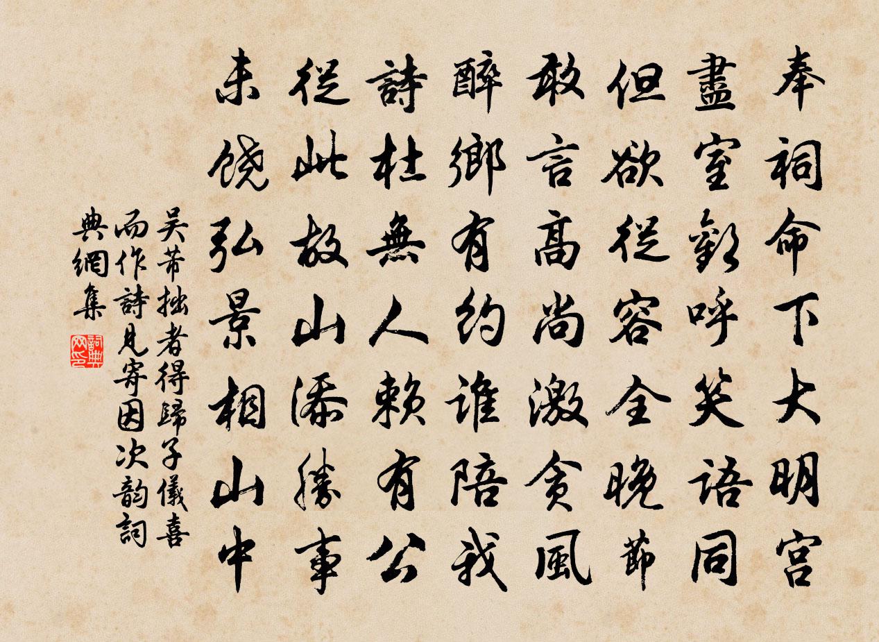 詩詞名句歷史字典書法欣賞書法字典國語詞典說文解字康熙字典古漢語字典標 題 作 者 詩 句 拙者得歸子儀喜而作詩見寄因次韻作者:吳芾 朝代:宋代原文奉祠命下大明宮,盡室歡呼笑語同。但欲從容全晚節,敢言高尚激貪風。醉鄉有約誰陪我,詩杜無人賴有公。從此故山添勝事,未饒弘景相山中。詩詞問答問:《拙者得歸子儀喜而作詩見寄因次韻》的作者是誰?答:吳芾問:該詩寫於哪個朝代?答:宋代書法欣賞拙者得歸子儀喜而作詩見寄因次韻書法作品詩詞推薦丙戌五月朔閒坐偶成陳著〔宋代〕石火光中見歲華,溪雲深處寄生涯。詩書屋下無嬉具,桑竹窗前有美花。拗境日增多活愧,囂塵天與一貧遮。乾坤見蛛絲戲作李流謙〔宋代〕一絲架空居,巧若出杼機。彌綸不知勞,終日周遭馳。相彼造為艱,中有鴟鴞詩。豈獨考其室,為罝陷群飛。口腹胡無人行二首曹勛〔宋代〕漢地山河遠,邊城草木長。西戎空大廈,北虜送君王。禮樂兼三統,車書混八荒。征伐司衛霍,奉使遣蘇張。號令句曾季貍〔宋代〕遠及水中蟹,直以投葅醢。次韻李參政湖上雜詠錄寄龍鶴墳廬魏了翁〔宋代〕聖死微言湮,千載迷津涯。浮驂遍八極,日暮猶伊鴉。大道如掌平,人苦不識家。次韻陳元輿待制新懷州呂侍講見寄蘇頌〔宋代〕繕性雖知眾射標,頹年無奈羽譙譙。覃懷新守紆高旆,寧海元侯駐累喬。憶擬曹鞭渦水賦,嘗陪戴席德陽朝。郡齋送僧法印志因西遊京師賀鑄〔宋代〕刻雪裁冰物外人,強隨肥馬走京塵。未應無地栽桃李,江北江南一樣春。題李處士月軒文同〔宋代〕圓蟾噴金波,萬里灑清滴。幽軒得虛敞,皓彩溢素壁。繩床有高隱,苦調起岑寂。盈襟納孤光,靜與爽氣敵。蜂蟻李石〔宋代〕乳蜂十蟻圍,小蜂兩翼弱。三蟻制蜂首,四蟻曳蜂腳。三蟻相後前,捍圉行且卻。蜂母正憑怒,有蠆無敢作。相視和范元作五絕胡寅〔宋代〕馬遷法左氏,實錄系日月。孰傳經世學,儻可論絕筆。跳珠軒董嗣杲〔宋代〕溪流穩信竹龍驅,聲繞闌虛入耳孤。此竅可消諸念妄,一丸長躍半空珠。掛瓢舀水應知味,就壁龕碑不用趺。誰謂過荻塘次韻衛宗武〔宋代〕平林歷歷曉雲迷,津堠將迎客棹西。千古興亡泰伯國,一川經緯鍬公堤。雨添柳色成蛾綠,春剩花香散麝臍。去去李閣學輓詩三首王炎〔宋代〕止水中心靜,浮雲外物輕。行藏無悔吝,存歿備哀榮。士類思前輩,朝廷失老成。衡湘人物盡,念舊若為情。鄉人徐辯道見過自雲有昇平遺自雲有昇平遺策袁說友〔宋代〕鄉翁初識面,獨往定何如。客舍風霜急,權門韋布疏。北書應有犬,南食尚無魚。身外只遺策,蒼苔空故廬。按曲圖釋居簡〔宋代〕八繭絲,舞衣嫌重要纎絺。君王自按霓裳曲,直到披前駐馬時。虞美人(二日小雨達旦,西園獨臥,寒甚不能寐,時窗前梨花將謝)葉夢得〔宋代〕數聲微雨風驚曉,燭影欹殘照。客愁不奈五更寒。明日梨花開盡、有誰看。追尋猶記清明近。為向花前問。東風正謁金門(和劉制幾)吳潛〔宋代〕山客野。新把朝銜書寫。慶想江南樗櫪下。踏歌雞黍社。休問坤牛乾馬。大率人生且且。聊喚玉人斟玉斝。莫辭沈觀北山先生可以亭帖子有索余著句辭不敢僭而劉六芝〔宋代〕古道今人慨不同,世情對面九疑峰。四尖山色元如舊,會構新亭始亢宗。望海潮譚處端〔元代〕全真大道,無為清淨,重重障礙堪嗟。每嘆自緣,招且不免,閒遊雲水他*。無念謗誹邪。願人人早悟,急景浮華早發剡中石城寺趙嘏〔唐代〕暫息勞生樹色間,平明機慮又相關。吟辭宿處煙霞古,心負秋來水石閒。竹戶半開鍾未絕,松枝靜霽鶴初還。明朝名句推薦關關雎鳩,在河之洲。窈窕淑女,君子好逑。佚名《關雎》 故人具雞黍,邀我至田家。孟浩然《過故人莊》 一去隔絕國,思歸但長嗟。李白《千里思》 迎天意,揣利害,不如其已。列子及其弟子《列子·力命》 見可而進,知難而退,軍之善政也。兼弱攻昧,武之善經也。左丘明《左傳·宣公·宣公十二年》 古之人,得志,澤加於民;不得志,修身見於世。窮則獨善其身,達則兼善天下。孟子《孟子·盡心章句上·第九節》 願妾身為紅菡萏。年年生在秋江上。歐陽修《漁家傲·近日門前溪水漲》 松雪飄寒,嶺雲吹凍,紅破數椒春淺。周密《獻仙音·吊雪香亭梅》 輕解羅裳,獨上蘭舟。李清照《一剪梅·紅藕香殘玉簟秋》 雨後寒輕,風前香軟,春在梨花。仲殊《柳梢青·吳中》