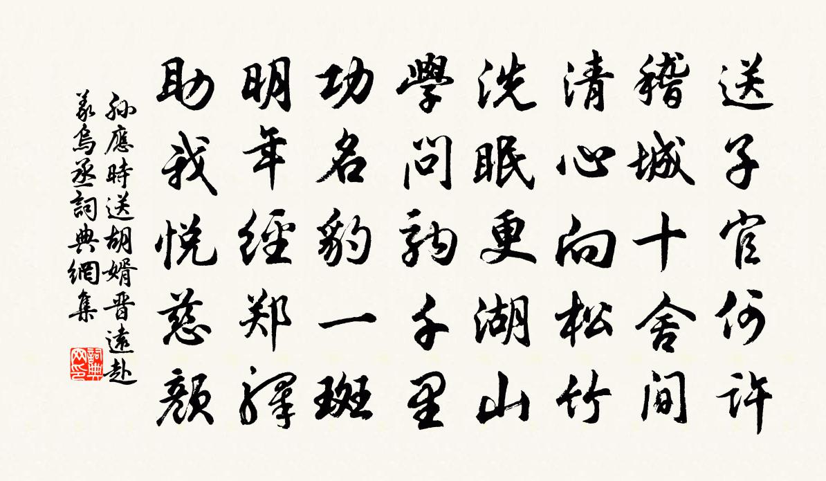 詩詞名句歷史字典書法欣賞書法字典國語詞典說文解字康熙字典古漢語字典標 題 作 者 詩 句 送胡婿晉遠赴義烏丞作者:孫應時 朝代:宋代送胡婿晉遠赴義烏丞原文送子官何許,稽城十舍間。清心向松竹,洗眠更湖山。學問駒千里,功名豹一斑。明年經鄭驛,助我悅慈顏。詩詞問答問:送胡婿晉遠赴義烏丞的作者是誰?答:孫應時問:送胡婿晉遠赴義烏丞寫於哪個朝代?答:宋代孫應時送胡婿晉遠赴義烏丞書法欣賞送胡婿晉遠赴義烏丞書法作品詩詞推薦玉樓春歐陽修〔宋代〕黃金弄色輕於粉。濯濯春條如水嫩。為緣力薄未禁風,不奈多嬌長似困。腰柔乍怯人相近。眉小未知春有恨。勸君八聲甘州元好問〔元代〕半仙亭籃輿雪中回,黃綢日高眠。兒婚女嫁,奴耕婢織,共有住山緣。夢裡松腴釀熟,竹港咽冰泉。萬古霜空月,唐道人言天目山上俯視雷雨每大雷電但聞雲中蘇軾〔宋代〕已外浮名更外身,區區雷電若為神。山頭只作嬰兒看,無限人間失箸人。水調歌頭(和薌林居士中秋)張元乾〔宋代〕閏余有何好,一歲兩中秋。滕王高閣曾醉,月涌大江流。今夜釣龍台上,還似當時逢閏,佳句記英游。看山兼看月酬白樂天杏花園元稹〔唐代〕劉郎不用閒惆悵,且作花間共醉人。算得貞元舊朝士,幾人同見太和春。送人游西山周弼〔宋代〕昔人深夜看星斗,鎮壓靈壇尚有符。偷寫只應蒼鼠慣,幾行丹篆繞春蕪。剛顯廟鄭昂〔宋代〕公昔隱居烏石岡,老觀禪師同道場。法主懶安共徜徉,李薛咨參互擊揚。擺脫利慾心清涼,是以能全此至剛。黃巢華亭道中梅詢〔宋代〕晴雲唳鶴幾千里,隔水野梅三四株。欲問陸機當日宅,而今何處不荒蕪。戲呈君用方岳〔宋代〕秋崖初無負郭二頃田,向來耕舍寒炊煙。負薪行歌遭婦罵,往往倒崖底之枯松,煮崖邊之飛泉。龜腸怒吼賣牛具,泛水曲曹勛〔宋代〕春服花僅能試,花荷小未成花蓮。畫舫維青幄,平波冪素煙。暖日薰花氣,新萍點翠鈿。歌吹浮天上,旌旗轉座前西江月辛棄疾〔宋代〕一柱中擎遠碧,兩峰旁依高寒。橫陳削就短長山。莫把一分增減。我望雲煙目斷,人言風景天慳。被公詩筆盡追還江神子蘇軾〔宋代〕曲,余嘗作數絕以紀其事矣。玉人家在鳳凰山。水雲間。掩門關。門外行人,立馬看弓彎。十里春風誰指似,斜日所思亭海棠初折贈兩使者將以小詩張栻〔宋代〕東風著物本無私,紅入花梢特地奇。想得霜台春思滿,一枝聊遣博新詩。水調歌頭夏元鼎〔宋代〕光諸丹經以質難。意初未釋,凡辨問數十條,乃噤不語,垂首悵然而去。後忽具信香誓狀,謂歷江、淮、閩、浙,風雨中過龍洞閣陸游〔宋代〕飄然醉袖怒人扶,個裡何曾有畏塗。捲地黑風吹慘澹,半天朱閣插虛無。闌邊歸鶴如爭捷,雲表飛仙定可呼。莫怪聽角思歸顧況〔唐代〕故園黃葉滿青苔,夢後城頭曉角哀。此夜斷腸人不見,起行殘日影徘徊。句司馬光〔宋代〕猶將談笑對風塵。喜涼章甫〔宋代〕老去孤黃嬭,愁來賴麴生。客居宜落寞,寒事費經營。歲稔鍛聲急,夜長燈影明。深懷不成寐,四壁候蟲鳴。雁王令〔宋代〕萬里長為客,飛飛豈自由。情知稻粱急,莫近網羅求。關塞風高夜,江湖水落秋。哀鳴徒自切,誰謂爾悲愁。送倧禪者釋重顯〔宋代〕涪江怒激鯨鰲宅,岌岌三山大傾側。冥數俄然一箇來,步武群方作禪客。振聲謂我分綱宗,今兮古兮何匆匆。令吾名句推薦遊人不管春將老,來往亭前踏落花。歐陽修《豐樂亭遊春·其三》 單者易折,眾則難摧魏收《魏書·列傳·卷八十九》 長亭路,年去歲來,應折柔條過千尺。周邦彥《蘭陵王·柳》 君子不器。孔子弟子《論語·為政篇》 浮天水送無窮樹,帶雨雲埋一半山。辛棄疾《鷓鴣天·送人》 春風不相識,何事入羅幃。李白《春思》 風塵荏苒音書絕,關塞蕭條行路難。杜甫《宿府》 夫子循循然善誘人孔子弟子《論語·子罕篇》 倉稟無宿儲,徭役猶未已。韋應物《觀田家》 別來半歲音書絕,一寸離腸千萬結。韋莊《應天長·別來半歲音書絕》