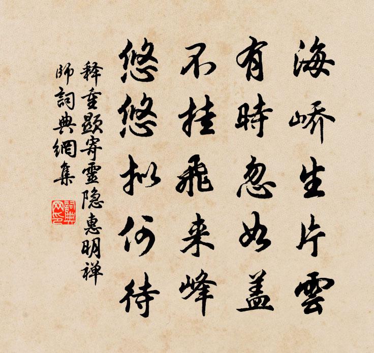 詩詞名句歷史字典書法欣賞書法字典國語詞典說文解字康熙字典古漢語字典標 題 作 者 詩 句 寄靈隱惠明禪師作者:釋重顯 朝代:宋代寄靈隱惠明禪師原文海嶠生片雲,有時忽如蓋。不掛飛來峰,悠悠擬何待。詩詞問答問:寄靈隱惠明禪師的作者是誰?答:釋重顯問:寄靈隱惠明禪師寫於哪個朝代?答:宋代釋重顯寄靈隱惠明禪師書法欣賞寄靈隱惠明禪師書法作品詩詞推薦冬至後招於秀才王建〔唐代〕日近山紅暖氣新,一陽先入御溝春。聞閒立馬重來此,沐浴明年稱意身。房君珊瑚散李商隱〔唐代〕不見姮娥影,清秋守月輪。月中閒杵臼,桂子搗成塵。馮中郎廟陳淳〔宋代〕為問中郎昔抗忠,力箴頗牧不能庸。如今疆場多塵擾,頗牧還能容不容。用王深造韻觀射寄呈吳門吳侍郎方岳〔宋代〕吳苑雲酣歌舞地,平時灞上真兒戲。府公槌鼓入轅門,盤馬彎弓士增氣。玉虬夜吼雙寶刀,曉霜冷透宮花袍。君王菩薩蠻(胡教生朝)韓淲〔宋代〕南枝已見春訊息。今年為壽方知得。俾爾熾而昌。流霞浮暗香。蓬壺清淺水。笑指雲階喜。高論不規模。平戎賦兩西江月(武昌妓徐楚楚號問月索題)劉過〔宋代〕樓上佳人楚楚,天邊皓月徐徐。呼童忙為卷蝦須。試問中情幾句。圓少卻因底事,缺多畢竟何如。嫦娥無語謾躊躇和孫偉卿雜言十章陳傅良〔宋代〕阨窮果何尤,利達竟誰在。眷言荷鉏人,妻子敬相待。聞富季申遷校書郎晁說之〔宋代〕小富秋來慰所望,青衫敘進校書郎。相公勳業久彌著,孫子門闌漸有光。莫話詩過已埋沒,且非碗脫得分張。白蓮浣溪沙李壁〔宋代〕只記梅花破臘前。惱人春色又薰然。山頭井似陸公泉。上客長謠追楚些,嬌娃短舞看胡旋。崇桃積李自年年。送王使君小子孝廉登科歸省司空曙〔唐代〕年少通經學,登科尚佩觿。張馮本名士,蔡廓是佳兒。鞍馬臨岐路,龍鍾對別離。寄書胡太守,請與故人知。知贈種徵君收孫僅〔宋代〕雄文英概比君難,二十高名滿世間。飛詔幾回來北闕,草玄終不出南山。詩篇落處風雷動,筆力停時造化閒。仙術齊國大長公主輓詞二首梅堯臣〔宋代〕魯館當年盛,秦台此日遙。龍歸終合劍,鳳去不聞簫。輓曲方傳薤,行輀競奠椒。空餘漢官屬,泣送馬如潮。送沙彌長文游京皎然〔唐代〕白版年猶小,黃花褐已通。若為詩思逸,早欲似休公。邁俗多真氣,傳家有素風。應須學心地,宗旨在關東。題山雲海月樓熊禾〔宋代〕壺山一片雲,滄海一輪月。仁人典刑靜,志士胸次闊。我來登斯樓,撫景亦奇絕。一天任舒捲,萬古看出沒。吟情獨游玉泉寺 三月三十日。白居易〔唐代〕雲樹玉泉寺,肩舁半日程。更無人作伴,只共酒同行。新葉千萬影,殘鶯三兩聲。閒遊竟未足,春盡有餘情。平園老叟周某敬讀次對兄芙容絕句嘆服不已效周必大〔宋代〕秋花少似春花紅,眼明見此木芙蓉。斜臨野水作清鏡,似照曉妝濃未濃。溪上趙孟頫〔元代〕溪上東風吹柳花,溪頭春水淨無沙。白鷗自信無機事,玄鳥猶知有歲華。錦纜牙檣非昨夢,鳳笙龍管是誰家?令人禪人寫真求贊釋正覺〔宋代〕眼空毛芥不立,心空海岳可容。便與打成一片,尚猶笑道疏蹤。虛空那掛劍,死水不藏龍。轉色轉功家法子,蘆華長卿見過賦美人插花用其韻胡銓〔宋代〕花亦興不淺,美人頭上開。心事眼勾破,鬢香魂引來。笑春燭底影,濺淚風前杯。分韻得先字,客今誰或哉。端午帖子太上皇帝閣周必大〔宋代〕寶箑裁新樣,團團玉柄寒。御書真翥鳳,仙女莫乘鸞。名句推薦散關三尺雪,回夢舊鴛機。李商隱《悼傷後赴東蜀辟至散關遇雪》 欹枕數秋天,蟾蜍下早弦。納蘭性德《菩薩蠻·蕭蕭幾葉風兼雨》 恭敬不如從命。曹雪芹《紅樓夢·第六十二回》 投我以木瓜,報之以瓊琚。佚名《木瓜》 深村時節好,應為去年豐。范成大《寒食郊行書事》 落木蕭蕭,琉璃葉下瓊葩吐。王十朋《點絳唇·素香丁香》 以近知遠,以一知萬,以微知明。此之謂也。荀子《荀子·非相》 人主之患,在於信人,信人,則制於人。韓非及後人《韓非子·備內》 彩袖殷勤捧玉鍾。當年拚卻醉顏紅。晏幾道《鷓鴣天·彩袖殷勤捧玉鍾》 往者不可諫,來者猶可追。孔子弟子《論語·微子篇》