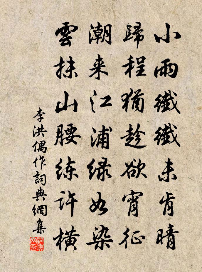 詩詞名句歷史字典書法欣賞書法字典國語詞典說文解字康熙字典古漢語字典標 題 作 者 詩 句 偶作作者:李洪 朝代:宋代偶作原文小雨纖纖未肯晴,歸程猶趁欲宵征。潮來江浦綠如染,雲抹山腰練許橫。詩詞問答問:偶作的作者是誰?答:李洪問:偶作寫於哪個朝代?答:宋代李洪偶作書法欣賞偶作書法作品詩詞推薦宿友人山居寄司徒相公李建勛〔唐代〕雨雪正霏霏,令人不憶歸。地爐僧坐暖,山枿火聲肥。隔紙烘茶蕊,移鐺剝芋衣。知君在霄漢,此興得還稀。郢客夢真三首黎廷瑞〔宋代〕昔夢拜綠章,縹緲朝紫微。均天侍清燕,寶書析玄機。錫之瑤碧簡,賚之青霞衣。微班司玉條,下糾濁世非。還家游鼓山張鎮初〔宋代〕籠翎圈裡著禪關,頂有奇峰蹬可攀。上下乾坤大千界,東西陸海兩三山。臨滄霧向風前解,喝水泉因雨後潺。一宿漁家傲楊無咎〔宋代〕梅暈漸開紅蠟壘。菊籬尚耀黃金蕊。正是小春風物美。宜家喜。生朝顏巷猶和氣。古鼎氤氳雲縷細。霞觴瀲灩紅鱗宴清都方千里〔宋代〕暮色聞津鼓。煙波碧、數行征雁時度。輕榔聚網,長歌和楫,水村漁戶。行人又落天涯,但悵望、高陽伴侶。記舊頌古四十四首釋師範〔宋代〕深深親下拜,三代禮全該。此意如不然,玉帛云乎哉。哥舒歌西鄙人〔唐代〕北斗七星高,哥舒夜帶刀。至今窺牧馬,不敢過臨洮。驀山溪(容州病起作)高登〔宋代〕黃茅時節,病惱南來客。瘦得不勝衣,試腰圍、都無一搦。東籬興在,手種菊方黃,摘晚艷,泛新蒭,誰道乾坤窄和太僕田卿酬殷堯藩侍御見寄姚合〔唐代〕往還知分熟,酬贈思同新。嗜飲殷偏逸,閒吟卿亦貧。古苔寒更翠,修竹靜無鄰。促席燈浮酒,聽鴻霜滿身。淺才叔易自三歸吳同赴竹庵荔子之集二首張元乾〔宋代〕客去雲俱散,山空月正圓。不參藤樹句,自透竹庵禪。骨法凌煙像,家聲鼓瑟篇。直須陪叔季,急佐中興年。洞霄宮陳堯佐〔宋代〕二天封部稼如雲,流水清寒出洞門。更愛林間盤石上,松花飄落羽人樽。贈孫花翁翁甫〔宋代〕我生頭髮未燥時,花間已歌花翁詩。我發既長今漸白,猶見花翁好顏色。舉酒祝翁壽百年,我為詩孫戲翁邊。酬婁秀才將之淮南見贈之什(婁秀才,圖南也)柳宗元〔唐代〕遠棄甘幽獨,誰雲值故人。好音憐鎩羽,濡沫慰窮鱗。困志情惟舊,相知樂更新。浪遊輕費日,醉舞詎傷春。風月四禽言梁棟〔宋代〕不如歸去,錦官宮殿 * 樹。天津橋上一兩聲,叫破中原無住處。不如歸去。再次韻贈張德恭陳造〔宋代〕老尋詩法得良朋,轉處驪珠悟後僧。帝所宮商中夜奏,仙盤沆瀣未秋凝。樂天不幸逢元稹,季友而來有彥升。交手前歲過真陽初識子欽今道出曲江不忍遽分手偶林光朝〔宋代〕秋崖一夕卷炎蒸,那更揮斤為斲冰。碧落舊尋燒藥灶,白芒長對讀書燈。相期大庾何多日,似出浮屠向上層。縱有四景釋慧空〔宋代〕沙寒雪後天,鳧雁將儔侶。獨怪蓑笠翁,維舟一歸去。光祿朱卿輓詞十首李廌〔宋代〕自信仁由己,深知道滿門。才華輝日域,嘉譽達天閽。坦腹方趨進,亨衢迓駿奔。欲令唐晉後,不獨美姚溫。次姜堯章餞徐南卿韻二首陳造〔宋代〕姜郎未仕不求田,倚賴生涯九萬箋。稛載珠璣肯分我,北關當有合肥船。頌古十首釋曇華〔宋代〕背眾吃油糍,對人夸好手。潦倒不識羞,抵死揚家醜。名句推薦年年躍馬長安市。客舍似家家似寄。劉克莊《玉樓春·戲林推》 常思某人境界不及我,某人命運不及我,則可以知足矣王永彬《圍爐夜話·第六一則》 忠臣挾難進之術,吐逆耳之言陳壽《三國志·魏書·辛毗楊阜高堂隆傳》 但夢想、一枝瀟灑,黃昏斜照水周邦彥《花犯·小石梅花》 我行殊未已,何日復歸來。宋之問《題大庾嶺北驛》 棠梨葉落胭脂色,蕎麥花開白雪香。王禹偁《村行·馬穿山徑菊初黃》 雲中亂拍祿山舞,風過重巒下笑聲。杜牧《過華清宮絕句三首》 五更櫪馬靜無聲。鄰雞猶怕驚。吳文英《醉桃源·元日》 江海不擇小助,故能成其富。韓非及後人《韓非子·大體》 地冷葉先盡,谷寒雲不行。李白《冬日歸舊山》