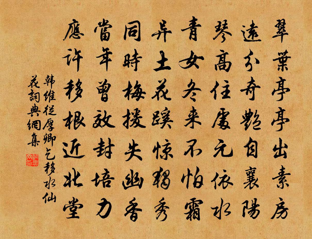 詩詞名句歷史字典書法欣賞書法字典國語詞典說文解字康熙字典古漢語字典標 題 作 者 詩 句 從厚卿乞移水仙花作者:韓維 朝代:宋代從厚卿乞移水仙花原文翠葉亭亭出素房,遠分奇艷自襄陽。琴高住處元依水,青女冬來不怕霜。異土花蹊驚獨秀,同時梅援失幽香。當年曾效封培力,應許移根近北堂。詩詞問答問:從厚卿乞移水仙花的作者是誰?答:韓維問:從厚卿乞移水仙花寫於哪個朝代?答:宋代韓維從厚卿乞移水仙花書法欣賞從厚卿乞移水仙花書法作品詩詞推薦八聲甘州(偶書)魏了翁〔宋代〕被西風吹不斷新愁。吾歸欲安歸。望秦雲蒼憺,蜀山渺渀,楚澤平漪。鴻雁依人正急,不奈稻粱稀。獨立蒼茫外,春山月夜於良史〔唐代〕春山多勝事,賞玩夜忘歸。掬水月在手, * 。興來無遠近,欲去惜芳菲。南望鳴鐘處,樓台深翠微。春日即事王安石〔宋代〕池北池南春水生,桃花深處好閒行。細思擾擾夢中事,何用悠悠身後名。山行愁思羅與之〔宋代〕日落煙欲橫,山寒翠將滴。荒村渺愁人,跬步觸四塞。路遙兩髀酸,頗恨身不翼。舍策還悵然,倦倚松下石。金陵作劉克莊〔宋代〕高牙拂雲車帶雨,清曉西州氣成霧。玉麟堂上少文書,白鷺亭前多杖屨。古來此地一都會,城郭樓台盡非故。落日燭影搖紅(隔窗聞歌)張炎〔宋代〕閒苑深迷,趁香隨粉都行遍。隔窗花氣暖扶春,只許鶯鶯占。燭焰晴烘醉臉。想東鄰、 * 笑眼。欲尋無處,暗掐歲晚陸游〔宋代〕雲暗郊原雪意稠,天公似欲富來麰。布衾歲久真如鐵,詎取私懷一己憂。題鄠縣楊氏書樓魏野〔宋代〕竹多千畝餘,賣竹濟貧儒。門掩圭峰影,樓添鄠縣圖。蝸涎緣棟有,鶴跡入泉無。終約重來此,相鄰卜養愚。觀吳偃畫松施肩吾〔唐代〕君有絕藝終身寶,方寸巧心通萬造。忽然寫出澗底松,筆下看看一枝老。南塔詩蘇泂〔宋代〕松樹何知過百年,樹根流水亦清漣。莫嫌寂寞無人到,多有人來正不然。老子·八章佚名〔先秦〕上善若水。水善利萬物而不爭,處眾人之所惡,故幾於道。居善地,心善淵,與善仁,言善信,政善治,事善能,兩同心黃庭堅〔宋代〕一笑千金。越樣情深。曾共結、合歡羅帶,終願效、比翼紋禽。許多時,靈利惺惺,驀地昏沈。自從官不容針。直宣城勸農吳泳〔宋代〕一分東作五分春,相汝耕夫更在勤。七月詩成種田法,庶人章作勸農文。祈蠶必使蠶如瓮,卜稼須觀稼似雲。老守頌古七首釋勝〔宋代〕漢祖拜將務決勝,非韓誰敢當茲任。赤幡高豎化城降,星在盤兮不在秤。黃楊林詩李廌〔宋代〕黃楊性堅貞,枝葉亦剛願。三十六旬久,增生但方寸。今何成修林,左右映煙蔓。良材豈一二,所期先愈鈍。賀丞相家廟詩戴栩〔宋代〕有永恢皇祚,中興挺世臣。王封一品貴,廟錫五筵新。日月臨華表,璇璣近彩晨。秀當吳嶠色,流自鄮江津。給吹歡喜口號黃彥平〔宋代〕占著商山接華山,兩京渾在笑談間。樵蘇按堵人甘寢,別隊官軍入武關。慶壽光晁端禮〔宋代〕事在可疑,有司難之。次子論列於朝,特封壽光縣太君。誥詞有蘊仁積善之褒,因采綸言以名所居之堂曰“積善”次韻張文伯喜雨王之道〔宋代〕新詩句句堪流傳,令人讀之神壈然。孟君已死不可見,如公筆力今無前。天生百穀養萬姓,暄潤稍闕功難全。江城憩紅詩課戲題一待於後曾國藩〔清代〕鉛山不作桐城逝,海內騷壇委寒灰。龍蟄虎潛斷吟嘯,坐令蚯蚓鳴驚雷。慈紅先生頗好事,欲拓詩國疆土恢。號召名句推薦小桃枝下試羅裳,蝶粉斗遺香。陳子龍《訴衷情·春遊》 性靈熔匠,文章奧府。淵哉鑠乎,群言之祖。劉勰《文心雕龍·宗經》 野客預知農事好,三冬瑞雪未全消。戴復古《除夜》 葡萄美酒夜光杯,欲飲琵琶馬上催。王翰《涼州詞二首·其一》 天下有道則見,無道則隱。孔子弟子《論語·泰伯篇》 何處飛來林間鵲,蹙踏松梢微雪。辛棄疾《賀新郎·把酒長亭說》 何期今日酒,忽對故園花。文森《九日》 桂林風景異,秋似洛陽春。宋之問《始安秋日》 寒氣先侵玉女扉,清光旋透省郎闈。李商隱《對雪二首》 半卷紅旗臨易水,霜重鼓寒聲不起。李賀《雁門太守行》