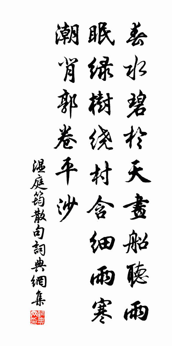 春水碧於天,畫船聽雨眠。綠樹繞村含細雨,寒潮背郭卷平沙。
