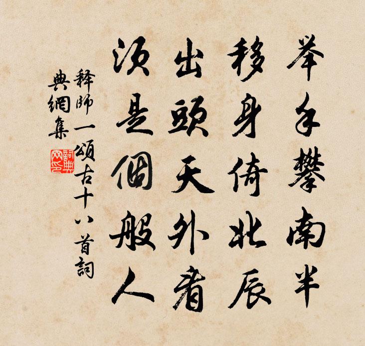 詩詞名句歷史字典書法欣賞書法字典國語詞典說文解字康熙字典古漢語字典標 題 作 者 詩 句 頌古十八首作者:釋師一 朝代:宋代頌古十八首原文舉手攀南半,移身倚北辰。出頭天外看,須是個般人。詩詞問答問:頌古十八首的作者是誰?答:釋師一問:頌古十八首寫於哪個朝代?答:宋代釋師一頌古十八首書法欣賞頌古十八首書法作品詩詞推薦訴衷情袁去華〔宋代〕荷花風細竹娟娟。新浴晚涼天。鉤簾坐期素月,相對理朱弦。歌扇底,舞裙邊。舊因緣。忔憎模樣,別沒包彈,只閉居五詠其二坐忘蘇轍〔宋代〕少年常病肺,納息肺自斂。靈液洗昏煩,百藥無此驗。爾來觀坐忘,一語頓非漸。道妙有至力,端能破諸暗。跏趺和清叟奉御大都陳普〔宋代〕帝里春深草木苞,御河滾滾浪翻桃。萬千紅紫跡如掃,九十青皇壽已高。南國江山歸夢遠,東宮松桂書陰交。丘園題招提院靜照堂祖無擇〔宋代〕院靜遠囂塵,虛堂締構新。幾招台嶺客,共話沃州春,想像山中樂,優遊物外身。公卿詩滿壁,雅正日相親。春望雜詠歸雁宋祁〔宋代〕刷羽梁王池,春至欲言歸。牽我東南恨,隨君西北飛。歸田詩庾信〔南北朝〕務農勤九榖。歸來嘉一廛。穿渠移水碓。燒棘起山田。樹陰逢歇馬。魚潭見酒船。苦李無人摘。秋瓜不直錢。社雞次林光朝八月十五日道出南昌寄龔帥實之韻程大昌〔宋代〕聞有挐音掃榻埃,尚疑卻棹酒船回。錦囊忽至詩傳諾,玉塵未交心已開。邂逅四人今楚尾,班聯十載舊蘭台。尊前西江月(次韻林茂南博士杞泛溪)葛勝仲〔宋代〕山外半規殘日,雲邊一縷餘霞。滿城飛雪散苕花。萬頃溪連罨畫。柳惲風流舊國,鶴齡瀟灑人家。肯嗟流落在天涯用前韻謝吳知府釋寶曇〔宋代〕聞道江南庾子山,新詩脫手意長閒。未嘗臨鏡嗟遲暮,更約何人共往還。我有茅茨依橘柚,自憐風雨竄荊蠻。悲歡送客至城西,望圖山,因寄浙西府中徐鉉〔唐代〕牧叟鄒生笑語同,莫嗟江上聽秋風。君看逐客思鄉處,猶在圖山更向東。同鮮于蹈夫管養正飲衛氏雲亭王之望〔宋代〕誰結危亭古岸頭,雲容水熊入簾鉤。數峰嵐翠欲排闥,半夜溪聲礙枕流。入坐煙霞終日秀,對床風雨一燈幽。那知北山丘葵〔宋代〕朝見北山青,暮見北山紫。頑然土與石,此色何處起。無情草木含清輝。朝露夕陽助明媚。四時煙雨姿熊異,天機監試蓮花峰劉得仁〔唐代〕太華萬餘重,岧嶢只此峰。當秋倚寥泬,入望似芙蓉。翠拔千尋直,青危一朵穠。氣分毛女秀,靈有羽人蹤。倒影句釋曉瑩〔宋代〕攜朋上故基。夜坐李廌〔宋代〕東郭新雨余,日入涼氣佳。長風吹天維,坐見參斗斜。默默群動息,寒螿先秋嘩。清談互絕倒,豈復憂過差。應龍吟邵雍〔宋代〕龍者陽類,與時相須。首出庶物,同游六虛。能潛能見,能吸能呼。能大能小,能有能無。疏山送日兄歸玄沙釋紹曇〔宋代〕疏山覓得曹家女,嬌舞西風不解羞。歸與謝郎稱萬福,免教紅爛在漁舟。往時趙蕃〔宋代〕往時聽說嚴州水,試向經行覓舊痕。尚有浮槎棲古木,可憐萬壑勢併吞。雨後二絕句趙蕃〔宋代〕竹樹翛然亦雨余,便疑秋已到林居。恨無新月當霄掛,空遣清風為掃除。頌古十四首釋師體〔宋代〕陽春白雪非難和,藻鑒水壺豈足觀。一把柳絲收不得,和風搭在玉欄乾。名句推薦不知庭霰今朝落,疑是林花昨夜開。宋之問《苑中遇雪應制》 安上在於悅下,為己存乎利人。房玄齡《晉書·列傳·第二十四章》 花隱掖垣暮,啾啾棲鳥過。杜甫《春宿左省》 害人之心不可有,防人之心不可無,此戒疏於慮者。洪應明《菜根譚·概論》 清漏漸移相望久,微雲未接過來遲。李商隱《辛未七夕》 兒童相見不相識,笑問客從何處來。賀知章《回鄉偶書二首·其一》 德不孤,必有鄰。孔子弟子《論語·里仁篇》 曲終漏盡嚴具陳,月沒星稀天下旦。佚名《雞鳴歌》 深林人不知,明月來相照。王維《竹里館》 爭渡,爭渡,驚起一灘鷗鷺。李清照《如夢令·常記溪亭日暮》
