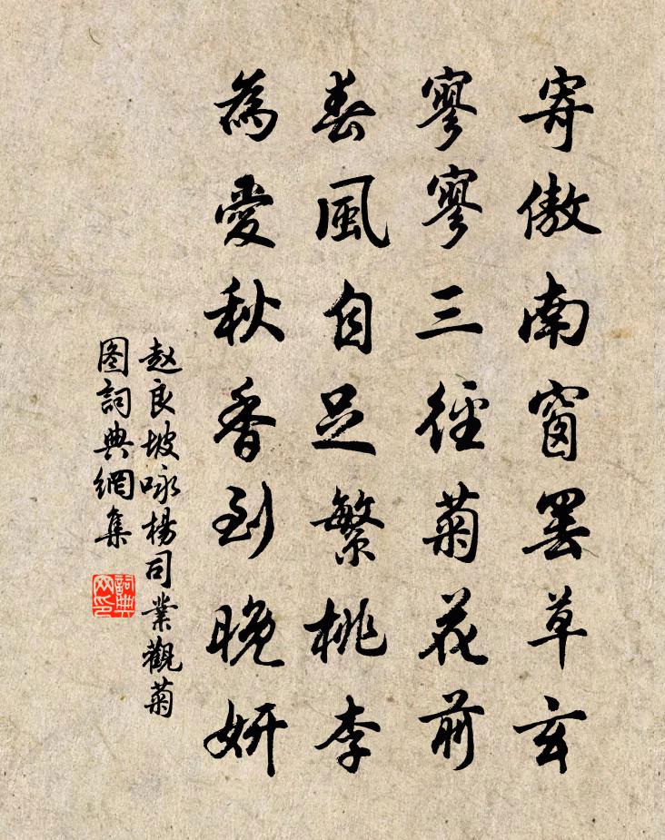詩詞名句歷史字典書法欣賞書法字典國語詞典說文解字康熙字典古漢語字典標 題 作 者 詩 句 詠楊司業觀菊圖作者:趙良坡 朝代:宋代詠楊司業觀菊圖原文寄傲南窗罷草玄,寥寥三徑菊花前。春風自足繁桃李,為愛秋香到晚妍。詩詞問答問:詠楊司業觀菊圖的作者是誰?答:趙良坡問:詠楊司業觀菊圖寫於哪個朝代?答:宋代趙良坡詠楊司業觀菊圖書法欣賞詠楊司業觀菊圖書法作品詩詞推薦寄題蒲傳正學士清風閣蘇頌〔宋代〕閣倚青山書滿堂,門齊通德里高陽。傳家載世惟清白,教子何人似義方。班嗣一丘雖道卷,劉商七業已名彰。他年雜劇·隨何賺風魔蒯通佚名〔元代〕第一折(沖末扮蕭丞相領祗候上)(蕭相詩云)秦府圖書世不收,漢家刀筆我為優。請看約法三章在,第一功臣是尋梅張道洽〔宋代〕澹澹一痕月,疎疎數個花。春風也公道,先到野人家。晴甫一日復大風雨連日不止遣懷陸游〔宋代〕書劍當年隘九州,白頭歸臥一窗幽。染成草色春猶淺,老盡梅花雨未休。複句已無前輩賞,開編時與古人游。山房偈頌一百六十首·其二釋宗杲〔宋代〕大道只在目前,要且目前難睹。欲識大道真體,不離聲色言語。玉樓春佚名〔宋代〕戲彩堂高無溽暑。滿座風生聞笑語。慈闈今日慶生申,歌遏行雲香篆縷。萬事從今休掛慮。兒輩行當壯門戶。一杯菩薩蠻張孝祥〔宋代〕雪消牆角收燈後。野梅官柳春全透。池閣又東風。燭花燒夜紅。一尊留好客。敧盡闌乾月。已醉不須歸。試聽烏夜歲日元稹〔唐代〕一日今年始,一年前事空。淒涼百年事,應與一年同。桐江汪遵〔唐代〕光武重興四海寧,漢臣無不受浮榮。嚴陵何事輕軒冕,獨向桐江釣月明。贈書肆陳解元危稹〔宋代〕兀坐書要自切磋,閱人應似閱書多。未知買得君書去,不負君書人幾何。登徒子好色賦宋玉〔先秦〕大夫登徒子侍於楚王,短宋玉曰:玉為人體貌閒麗,口多微辭,又性好色。願王勿與出入後宮。&q頌古三十八首釋慧方〔宋代〕滔滔無問說,只為太親切。有誰曾共聞,山河齊漏泄。送段覺之西蜀結婚(一作送段覺之西川過婚禮後歸覲)許渾〔唐代〕詞賦名高身不閒,采衣如錦度函關。鏡中鸞影胡威去,劍外花歸衛玠還。秋浪遠侵黃鶴嶺,暮雲遙斷碧雞山。時人和傅山父小園十詠李曾伯〔宋代〕蒼苔跡在堂無燕,綠水痕生沼自魚。回首釣游徒感慨,何時復古喜而書。同房憲部應旋儲光羲〔唐代〕衡山法王子,慧見息諸苦。落髮自南州,燕居在西土。養正不因晦,得中寧患旅。曠然長虛閒,即理寄行補。四句過興德寺李復〔宋代〕行雨忽過漸細微,冉冉傍馬殘雲飛。亂溪爭流經屢渡,近水短畦菘葉肥。躋欹到寺石燈滑,紅葉擁門人跡稀。升堂勸農虞儔〔宋代〕慚愧荒三徑,羈棲漫一同。青春非老事,白眼有途窮。柳暗鴉藏綠,花飄燕蹴紅。平生孔北海,未放酒樽空。王中奉漢老輓詞韓元吉〔宋代〕符節光華二十春,壯猷曾不侍嚴宸。棲心香火才同社,放意溪山幸卜鄰。再世簪纓宜袞袞,一門蘭玉尚詵詵。霜清藥名離合夏日即事三首陸龜蒙〔唐代〕乘屐著來幽砌滑,石罌煎得遠泉甘。草堂只待新秋景,天色微涼酒半酣。避暑最須從樸野,葛巾筠席更相當。歸來寄題鄭熙寧夫玉軒林表民〔宋代〕良玉本不琢,不音無希聲。觀君命軒意,欲以詩自鳴。君詩志古調,考擊在差韺。泠泠澗泉泣,切切溪條清。孚尹名句推薦碧溪影里小橋橫,青簾市上孤煙起。謝逸《踏莎行·柳絮風輕》 便向夕陽影里,倚馬揮毫。納蘭性德《風流子·秋郊即事》 己欲立而立人,己欲達而達人。孔子弟子《論語·雍也篇》 近淚無乾土,低空有斷雲。杜甫《別房太尉墓》 拜華星之墜幾,約明月之浮槎。文天祥《回董提舉中秋請宴啟》 一味學吃虧,是處事良方。王永彬《圍爐夜話·第五四則》 灞涘望長安,河陽視京縣。謝朓《晚登三山還望京邑》 人孰無親,罪人慎察其宗。來俊臣《羅織經·固榮卷第六》 夜雨連明春水生,嬌雲濃暖弄陰晴。蘇舜欽《初晴游滄浪亭》 鶯初解語,最是一年春好處。蘇軾《減字木蘭花·鶯初解語》