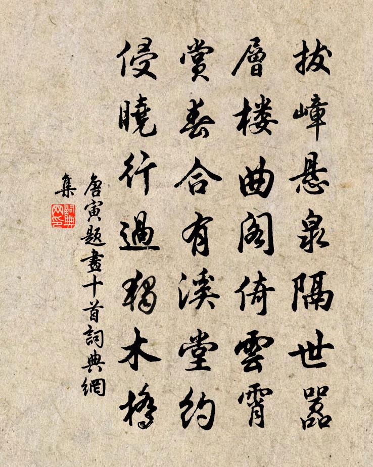 詩詞名句歷史字典書法欣賞書法字典國語詞典說文解字康熙字典古漢語字典標 題 作 者 詩 句 題畫十首作者:唐寅 朝代:明代題畫十首原文拔嶂懸泉隔世囂,層樓曲閣倚雲霄。賞春合有溪堂約,侵曉行過獨木橋。詩詞問答問:題畫十首的作者是誰?答:唐寅問:題畫十首寫於哪個朝代?答:明代問:唐寅的名句有哪些?答:唐寅名句大全唐寅題畫十首書法欣賞題畫十首書法作品詩詞推薦杭州次周大韻蔡肇〔宋代〕湖邊蓮葉已田田,聞道花開勝去年。君不御兮應有恨,風其吹汝未應仙。韻詞合繼菑公作,郡守誰如白傅賢。卻使偈頌八十五首釋妙倫〔宋代〕德山低頭,夾山點頭。俱胝豎起手指頭,玄沙{上祝下土}破腳指頭,都來不出山僧拄杖頭。一葉落,天下秋。永嘉秋夕真山民〔宋代〕風戰枯桐敲紙窗,擁裘無寐夜偏長。樵樓三鼓夜將午,雲雁數聲天正霜。寓世此身驚逆旅,寬懷何處不吾鄉。江頭傷春詞白居易〔唐代〕深淺檐花千萬枝,碧紗窗外囀黃鸝。殘妝含淚下簾坐,盡日傷春春不知。乙巳邵武建寧夜坐書呈諸公陳普〔宋代〕敬身天不寬曾子,白眼人當殺嗣宗。林下脫巾仍露腳,青雲白石肯相容。山行衛宗武〔宋代〕攜友行莫春,山南復山北。一川去縈紆,層林互倚伏。舍舟上孱顏,萬象鹹在目。野花衒殘紅,柔條曳新綠。春巒偈頌一百二十三首釋祖欽〔宋代〕南薰入奏,殿閣生涼。西來祖意,切忌商量。向下文長。清明臥病有感二首張耒〔宋代〕支離臥病逢佳節,漂泊西遊寄洛城。重帽畏風惟益睡,青筇扶步不禁行。紅飄殘萼知風急,綠滿新枝聽鳥聲。不見鶯聲繞紅樓姜夔〔宋代〕十畝梅花作雪飛。冷香下、攜手多時。兩年不到斷橋西。長笛為予吹。人妒垂楊綠,春風為、染作仙衣。垂楊卻又秀亭秋懷十五首方回〔宋代〕天欲興蒼姬,一家三聖人。扶持用禮樂,行葦於焉臻。有國八百年,終亦化為秦。末俗夸神仙,吐故以納新。彭門上已游惠泉和趙國興韻陳文蔚〔宋代〕閒倚欄桿覺句時,此身如在浣花溪。草迷芳徑王孫醉,花滿春山杜宇啼。酒罷啜茶留石井,舉餘隨月步江堤。清泉六朝門又吟周曇〔唐代〕水影星光怪異多,不思修德事干戈。無謀拒諫仍輕敵,國破身擒將奈何。送常熟錢尉宋庠〔宋代〕吏最三年集,僚英一尉沈。清壺人映玉,勛券廟藏金。夕館淮蟾度,春篙楚汰深。王孫情幾許,芳草遍天潯。送鶴神黎廷瑞〔宋代〕玄裳兮縞衣,紛爾乘兮遄歸。嗟我甿兮苦復苦,谷懸於天兮麥在土。爾之族兮類且多。蠶爾食兮如甿何。甿之憂兮過大浪灘鄭克已〔宋代〕急浪吹飛雪,鳴稿破曉灘。異鄉人易老,行路古來難。玉露晨初濕,天河夜不乾。飄流雙鬢白,未有一枝安。和任宰元紹見寄十首以歸來問信湖山撫摩松菊吳芾〔宋代〕開門無一事,終日飽看山。石罅鳴流水,翻驚響佩環。初春感舊葛起耕〔宋代〕又是春生杜若洲,憑蘭回首總關愁。雲橫楚峽縈新夢,月泛吳波憶舊遊。立馬醉題花外驛,聞鶯笑倚柳邊樓。如今春日西興道中呂祖謙〔宋代〕檐鐸無聲鳥語稀,徑深鍾梵出花遲。日長遍繞溪南寺,未信東風屬酒旗。春社陸游〔宋代〕桑眼初開麥正青,勃姑聲里雨冥冥。今朝有喜君知否,到處人家醉不醒。台州四詩尤袤〔宋代〕百病瘡痍費撫摩,官供仍愧拙催科。自憐鞅掌成何事,贏得霜毛一倍多。名句推薦天與秋光,轉轉情傷,探金英知近重陽。李清照《行香子·天與秋光》 三更月。中庭恰照梨花雪。賀鑄《子夜歌·三更月》 李白能詩復能酒,我今百杯復千首。唐寅《把酒對月歌》 雨後雙禽來占竹,秋深一蝶下尋花。文同《北齋雨後》 萬馬不嘶,一聲寒角,令行柳營。劉過《沁園春·張路分秋閱》 吳宮花草埋幽徑,晉代衣冠成古丘。李白《登金陵鳳凰台》 巧笑倩兮,美目盼兮。佚名《碩人》 一尺深紅勝麴塵,天生舊物不如新。溫庭筠《南歌子詞二首 / 新添聲楊柳枝詞》 未羞他、雙燕歸來,畫簾半卷張炎《解連環·孤雁》 三載重陽菊,開時不在家。文森《九日》