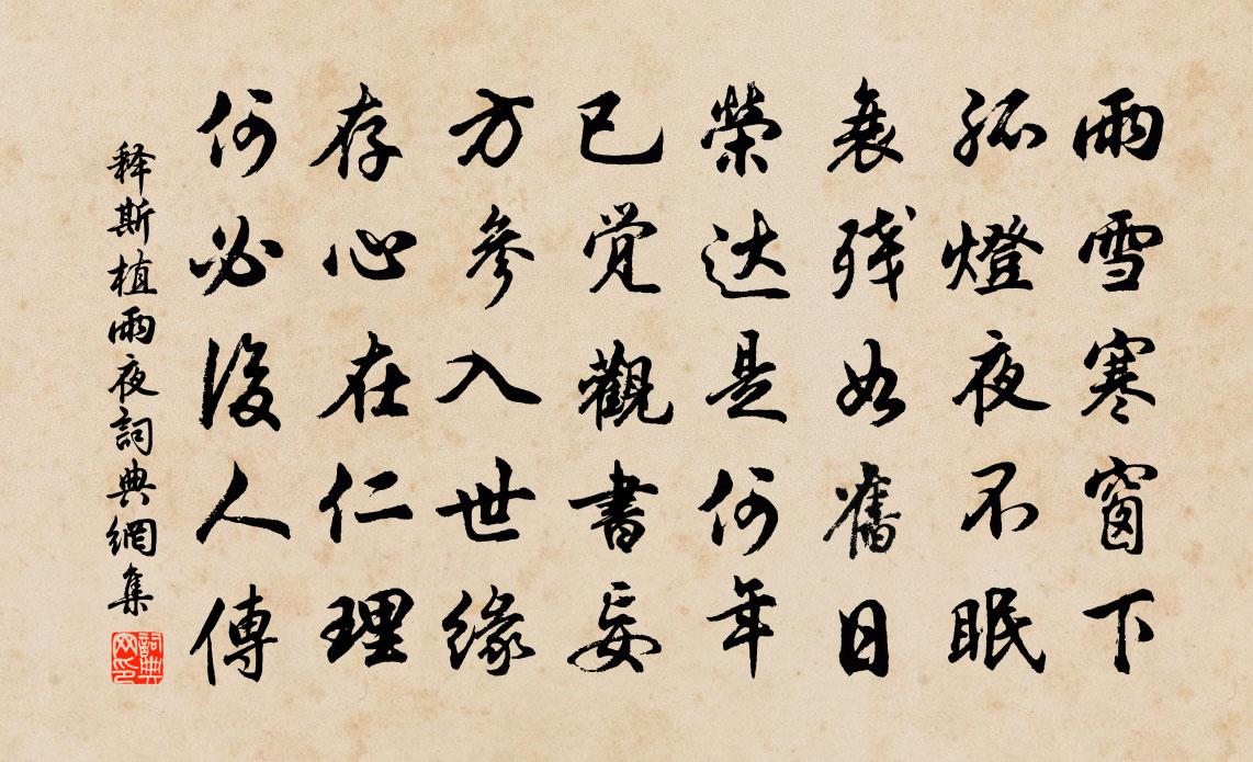 詩詞名句歷史字典書法欣賞書法字典國語詞典說文解字康熙字典古漢語字典標 題 作 者 詩 句 雨夜作者:釋斯植 朝代:宋代雨夜原文雨雪寒窗下,孤燈夜不眠。衰殘如舊日,榮達是何年。已覺觀書妄,方參入世緣。存心在仁理,何必後人傳。詩詞問答問:雨夜的作者是誰?答:釋斯植問:雨夜寫於哪個朝代?答:宋代釋斯植雨夜書法欣賞雨夜書法作品詩詞推薦徐鉉小篆千文帖贊岳珂〔宋代〕於惟騎省,神藝造古。獮兔璇窟,吸蜍銀浦。千文爰襲,百體具舉。慶雲澄靄,清風垂露。鳥跡觀象,魚書辨魯。賦梅堂閒吟陳宓〔宋代〕老覺無情戀物華,玉塵那復惜飛花。春風只在襟懷裡,試問藍溪吏隱家。休日登花將軍廟小樓陸游〔宋代〕林間縹緲出層樓,欄角蒼茫萬頃秋。曾是胸中著雲夢,不妨此地少遲留。頌古一百則釋正覺〔宋代〕巍巍堂堂,磊磊落落。鬧處刺頭,穩處下腳。腳下線斷我自由,鼻端泥盡君休斲。莫動著,千年故紙中合藥。板橋曾極〔宋代〕輪鞅各年路欲迷,板橋名在市朝非。玄暉太白微吟處,獨酌悠然命駕歸。南鄉子(集句)趙彥端〔宋代〕窗戶映朝光。花氣渾如百和香。即遣花飛深造次,茫茫。曲渚飄成錦一張。相憶莫相忘。並蒂芙蓉本自雙。草色連留別登州舉人蘇軾〔宋代〕身世相忘久自知,此行閒看古黃腄。自非北海孔文舉,誰識東萊太史慈。落筆已吞雲夢客,抱琴欲訪水仙師。莫嫌和成冠卿見寄姚孝錫〔宋代〕別恨頻添鬢雪深,百年懷抱郁沈沈。標名不掛金銀榜,涉世空堅鐵石心。俗物何勞供一醉,殘僧正欲伴孤吟。朱弦戲呈孔毅父黃庭堅〔宋代〕管城子無肉食相,孔方兄有絕交書。文章功用不經世,何異絲窠綴露珠。校書著作頻詔除,猶能上車問何如。忽憶點絳唇(賦登樓)王灼〔宋代〕休惜余春,試來把酒留春住。問春無語。簾卷西山雨。一掬愁心,強欲登高賦。山無數。煙波無數。不放春歸去。贈胡明府林逋〔宋代〕一琴牢落倚松窗,孤澹天君得趣長。謁廟有時封縣版,坐衙終日著公裳。為收牌印教村仆,偶檢圖書見古方。微足次韻正紀見寄郭印〔宋代〕棲棲奔走不知春,日月無停疾轉輪。塵土強顏成俗吏,林泉放意屬高人。書題繾綣情何切,詩律雄遒語不陳。引起奉使契丹二十八首其二十二學士院端午帖子二蘇轍〔宋代〕決獄初迎雨,開倉旋取陳。青黃今接夏,飢疫免憂春。和晏相公初春韓維〔宋代〕春物華猶少,春風思已多。新黃先入柳,微綠自生波。酒興潛傾倒,詩情暗揣摩。流年不須問,判作白頭歌。次績溪趙簿孟英見投韻許月卿〔宋代〕碧澗仙人亦愛樓,星溪樓上豁雙眸。吟邊興落千峰外,醉里眉攢萬國愁。傳舍官途輕似燕,禪心世事狎於鷗。詩人孫器之奉使淮浙至江為書見寄以詩謝之五首司馬光〔宋代〕{左革右闌}矢迎山驛,軺車下帝台。夜看牛斗分,應有使星來。擬古五首方回〔宋代〕騷人稱屈宋,宋豈敵子平。詩家推陶謝,謝豈肩淵明。魯直愛水仙,以梅為其兄。梅似可祖父,吾今改茲評。善福閣對雨,寄李儋幼遐韋應物〔唐代〕飛閣凌太虛,晨躋郁崢嶸。驚飆觸懸檻,白雲冒層甍。太陰布其地,密雨垂八紘。仰觀固不測,俯視但冥冥。感此泛鏡湖南溪宋之問〔唐代〕乘興入幽棲,舟行日向低。岩花候冬發,谷鳥作春啼。沓嶂開天小,叢篁夾路迷。猶聞可憐處,更在若邪溪。愛亭元絳〔宋代〕朱轓何事獨來頻,不為溪山只為民。最愛年年禾稻熟,時豐自有壤歌人。名句推薦廣陵城裡昔繁華,煬帝行宮接紫霞。曾棨《維揚懷古》 白日淪西河,素月出東嶺。陶淵明《雜詩十二首·其二》 竹馬踉蹡沖淖去,紙鳶跋扈挾風鳴。陸游《觀村童戲溪上》 故人書報,莫因循、忘卻蓴鱸。辛棄疾《漢宮春·會稽秋風亭觀雨》 我居北海君南海,寄雁傳書謝不能。黃庭堅《寄黃幾復》 以大事小者,樂天者也。孟子《孟子·梁惠王章句下·第三節》 皮之不存,毛將安傅?左丘明《左傳·僖公·僖公十四年》 苟利國家生死以,豈因禍福避趨之。林則徐《赴戍登程口占示家人·其二》 吳宮花草埋幽徑,晉代衣冠成古丘。李白《登金陵鳳凰台》 罪人或免人罪,難為亦為也。來俊臣《羅織經·問罪卷第十》
