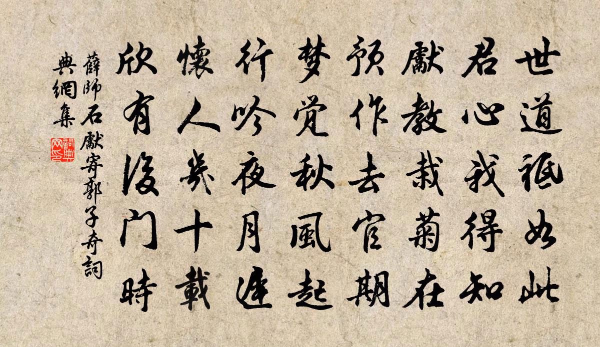 詩詞名句歷史字典書法欣賞書法字典國語詞典說文解字康熙字典古漢語字典標 題 作 者 詩 句 先寄郭子奇作者:薛師石 朝代:宋代先寄郭子奇原文世道祗如此,君心我得知。先教栽菊在,預作去官期。夢覺秋風起,行吟夜月遲。懷人幾十載,欣有後門時。詩詞問答問:先寄郭子奇的作者是誰?答:薛師石問:先寄郭子奇寫於哪個朝代?答:宋代薛師石先寄郭子奇書法欣賞先寄郭子奇書法作品詩詞推薦賀蕭蔘政張鎡〔宋代〕向來投謁未嘗頻,今日尤宜後眾賓。先世年家登政府,時情禮數到閒人。只將忠實酬明方,果見推遷作大臣。何用酬謝皋父見寄林景熙〔宋代〕人山采芝薇,豺虎據我丘。入海尋蓬萊。鯨鯢掀我舟。山海兩有礙,獨立凝遠愁。美人渺天西,瑤音寄青羽。自言四月五日難維成都連日行淺灘中或遲或速如在項安世〔宋代〕青林淺瀨密縈洄,喚作蘭亭載酒來。忽聽江深發鳴櫓,始知身是罷官回。再賦流觴亭秦觀〔宋代〕仙山游觀甲寰瀛,不比人間自雨亭。歌斷瑤池雲杳杳,酒行金谷水泠泠。珠簾卷雨驚秋近,羅襪凌波笑客醒。月下元夕范成大〔宋代〕 * 中陸地蓮,小梅初破月初圓。新年第一佳時節,誰肯如翁閉戶眠?途中得姜總管詩因和韻虞儔〔宋代〕相知何必舊,我輩正鍾情。老去難為別,詩來愈覺清。舟虛和雪載,水淺過灘平。一路俱佳境,收歸五字城。別後寄趙賓暘並楊華父二首方回〔宋代〕貌顛神定楊明府,聽聵思聰趙廣文。此老足成三釣叟,相望各占一溪雲。賓暘客邸偶胥會,華父家園誰共醺。為報論語絕句一百首張九成〔宋代〕見得分明乃謂如,分明如此尚為疏。莫於見處留形跡,方信心齋萬象虛。喜方溪復歸白雲釋行海〔宋代〕十載青燈自苦辛,懶將白眼顧浮塵。鳳聲偏近瑤台月,草色難連玉樹春。雲有去來非本意,世無榮辱是何人。幾番宮詞李建勛〔唐代〕宮門長閉舞衣閒,略識君王鬢便斑。卻羨落花春不管,御溝流得到人間。詩一首黃孝先〔宋代〕天寒霜落雁來棲,歲晚川空雁不歸。江海一身多少事,清風明月我沾衣。偈頌一百零一首釋慧性〔宋代〕春雨如膏,春雲如鶴。客從天外來,正是魔王腳。閫外威權,麒麟萬里何抅束。肥馬轆轆,瘦馬轆轆。日逐忙忙等次韻晁元忠西歸十首黃庭堅〔宋代〕聖莫如東家,長年困行路。公養為淹留,豈不以食故。林薄鳥遷巢,水寒魚不聚。孤士似無家,轉蓬何由住。丙除夜泊舟東湖用白石歸苕溪韻書懷徐端〔宋代〕空山歲晚足堪娛,殘雪千峰水半湖。明發臨風相諸弟,共扶白髮進屠蘇。都下秋懷呈聶之美司馬光〔宋代〕愚疏強從仕,趣尚與時乖。朅來游京邑,榮願知誰諧。王國富英奇,氣象摽岩崖。雲鴻送雙目,攀援路可階。秋風萬松亭蘇軾〔宋代〕十年栽種百年規,好德無人助我儀。縣令若同倉庾氏,亭松應長子孫枝。天公不救斧斤厄,野火解憐冰雪姿。為問偈頌二百零五首釋正覺〔宋代〕釣盡滄波月一鉤,月低煙樹夜維舟。寒雞抖擻呼天曉,笑對春風百草柔。中外夷猶,縱橫自由。志公不是閒和尚,同魏進道晚過湖上韓維〔宋代〕春風湖上泮,奈此淨綠何。平堤看瀲灩,皎如鏡新磨。支流別而東,下走萬玉珂。俜俜橋邊柳,芳牙綴柔柯。中洲辛未中元記夢夢與一僧談世事良久問答中有凡五邁〔宋代〕蘧蘧一夢中,了了三生意。法界如許寬,此生亦特寄。誰言玉局仙,元本是法器。不解自磨礲,因人亦成事。強顏歲除二首劉克莊〔宋代〕冰銜常憑麽,雪鬢轉皤然。一然差堪喜,詩多似去年。名句推薦信使可覆,器欲難量。周興嗣《千字文·全文》 黃埃散漫風蕭索,雲棧縈紆登劍閣。白居易《長恨歌》 故國山川,故園心眼,還似王粲登樓。周密《一萼紅·登蓬萊閣有感》 屋上春鳩鳴,村邊杏花白。王維《春中田園作》 天下英雄誰敵手?曹劉。生子當如孫仲謀辛棄疾《南鄉子·登京口北固亭有懷》 法不仁,不可以為法。墨子《墨子·04章 法儀》 胸中有誓深于海,肯使神州竟陸沉?鄭思肖《二礪》 水風輕,蘋花漸老,月露冷、梧葉飄黃。柳永《玉蝴蝶·望處雨收雲斷》 台高不盡看楓葉,院淨何須坐菊花。沈輅《九日登高台寺》 亂碧萋萋,雨後江天曉。梅堯臣《蘇幕遮·草》