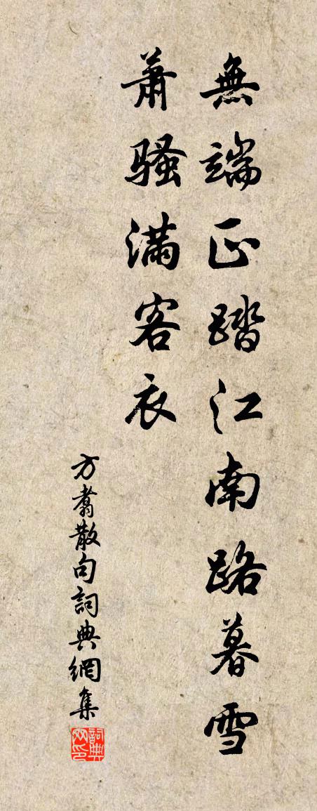 詩詞名句歷史字典書法欣賞書法字典國語詞典說文解字康熙字典古漢語字典標 題 作 者 詩 句 句作者:方翥 朝代:宋代句原文無端正踏江南路,暮雪蕭騷滿客衣。詩詞問答問:句的作者是誰?答:方翥問:句寫於哪個朝代?答:宋代方翥句書法欣賞句書法作品詩詞推薦聞晦庵罷宜春留南昌亟往見之將至貴溪逆風大趙蕃〔宋代〕下水放輕舠,真期快意遭。那知吾道蹇,還值逆風鏖。空闊初憑棹,淵洄竟倚篙。三山信非遠,弱水謾增勞。起來劉克莊〔宋代〕起來呵手檢衣篝,燭影蛩聲伴小樓。賴有夢中堪細說,錦箋寫不盡離愁。江村晚望釋斯植〔宋代〕保處問歸程,滄茫入句清。雲生峰頂白,月近水邊明。芳草連平楚,晴樓出遠城,此身南北外,漁火是閒情。綠綺七詠曹勛〔宋代〕爐薰一炷北窗虛,公幹歸來樂有餘。插架萬簽時諷味,孟光倚阮閱琴書。自題懶愚堂何師韞〔宋代〕君不見南嶽懶殘師,佯狂啖殘食。鼻涕任垂頤,懶為俗人拭。又不見愚溪子柳子,堂堂古遺直。以愚言溪山,於今挽黃夫人王洋〔宋代〕官棲枳棘莫消魂,身吒絲蘿在德門。三後姻聯門戶重,貳卿閱閥德名尊。傷心結蟻靈{乾乞換需}遠,保室鳴鳩道寄陳西老徐璣〔宋代〕長日無吟伴,閒庭儜物華。竹枝斜帶雨,草色淨侵沙。風度平生友,鄰居幾十家。前曾乘小醉,訪爾一甌茶。宿雲屏山寺文同〔宋代〕翠嶺聳雲端,巉巉走復蟠。客從塵外入,僧向畫中看。月上千岩碧,風生萬木寒。平明惜歸雲,猶待一憑欄。論語絕句一百首張九成〔宋代〕願乘車馬衣輕裘,便與顏回論不投。更得預聞夫子志,天高地下果難儔。禮記引南人言佚名〔先秦〕人而無恆。不可以為卜筮。鳴弦泉釋音可〔清代〕石上懸琴琴醉寒,五更三點是誰彈? 清音流出相思淚,月照風吹竟不乾。觀廉女真葬(女真善隸書,常為內中學士)李遠〔唐代〕玉窗拋翠管,輕袖掩銀鸞。錯落雲車斷,丁泠金磬寒。鶴尋深院宿,人借舊書看。寂寞焚香處,紅花滿石壇。泰山汪元量〔宋代〕敕使聯鑣上翠岑,飛泉躍澗吼雷音。凌高一覽知天遠,迂曲千蹊覺洞深。龍蟄滄溟蛟舞壑,梟橫碧落鳳歸林。山靈次韻子瞻謫居三適其三夜臥濯足蘇轍〔宋代〕海民慢寒備,不畜衾與裯。雖苦地氣泄,亦無徒跣憂。逐客久未安,集舍占鵂鶹。念昔使胡中,車馳卒不留。貂裘偈頌一百三十六首釋惟一〔宋代〕自夏及秋,頻頻出入。送舊迎新,賓士不歇。十字街頭忽吃攧。起來拾得胡餅只。今日不辭舉似諸人,團團圓圓,宮詞張公庠〔宋代〕月少銀台初勘契,一聲金鎖禁門開。千官聳轡爭朝路,騶士籠街宰相來。梅花趙葵〔宋代〕夜深梅印橫窗月,紙帳魂清艾亦香。莫謂道人無一事,也隨疏影伴寒光。和人賀楊僕射致政汪元量〔宋代〕蓮府公卿拜後塵,手持優詔掛朱輪。從軍幕下三千客,聞禮庭中七十人。飾帳麗詞推北巷,畫堂清樂掩南鄰。豈同送謝十二判官皇甫冉〔唐代〕四牡驅馳千里餘,越山稠疊海林疏。不辭終日離家遠,應為劉公一紙書。頌古二十首釋了一〔宋代〕甘贄設粥念摩訶,致見南泉打破鍋。萬事但將公道斷,任教四海動干戈。名句推薦李白如今已仙去,月在青天幾圓缺?唐寅《把酒對月歌》 明足以察秋毫之末,而不見輿薪,則王許之乎?孟子《孟子·梁惠王章句上·第八節》 父老得書知我在,小軒臨水為君開。蘇軾《送賈訥倅眉》 山遠翠眉長。高處淒涼。菊花清瘦杜秋娘。吳文英《浪淘沙·九日從吳見山覓酒》 正雁水夜清,臥虹平帖。吳文英《暗香·送魏句濱宰吳縣解組分韻得闔字》 風光人不覺,已著後園梅。史青《應詔賦得除夜》 柳帶搖風漢水濱,平蕪兩岸爭勻。牛希濟《臨江仙·柳帶搖風漢水濱》 打算精明,自謂自計,然敗祖父之家聲者,必此人也王永彬《圍爐夜話·第十九則》 黃鶴一去不復返,白雲千載空悠悠。崔顥《黃鶴樓 / 登黃鶴樓》 雖有戈矛之刺,不如恭儉之利也。荀子《荀子·榮辱》