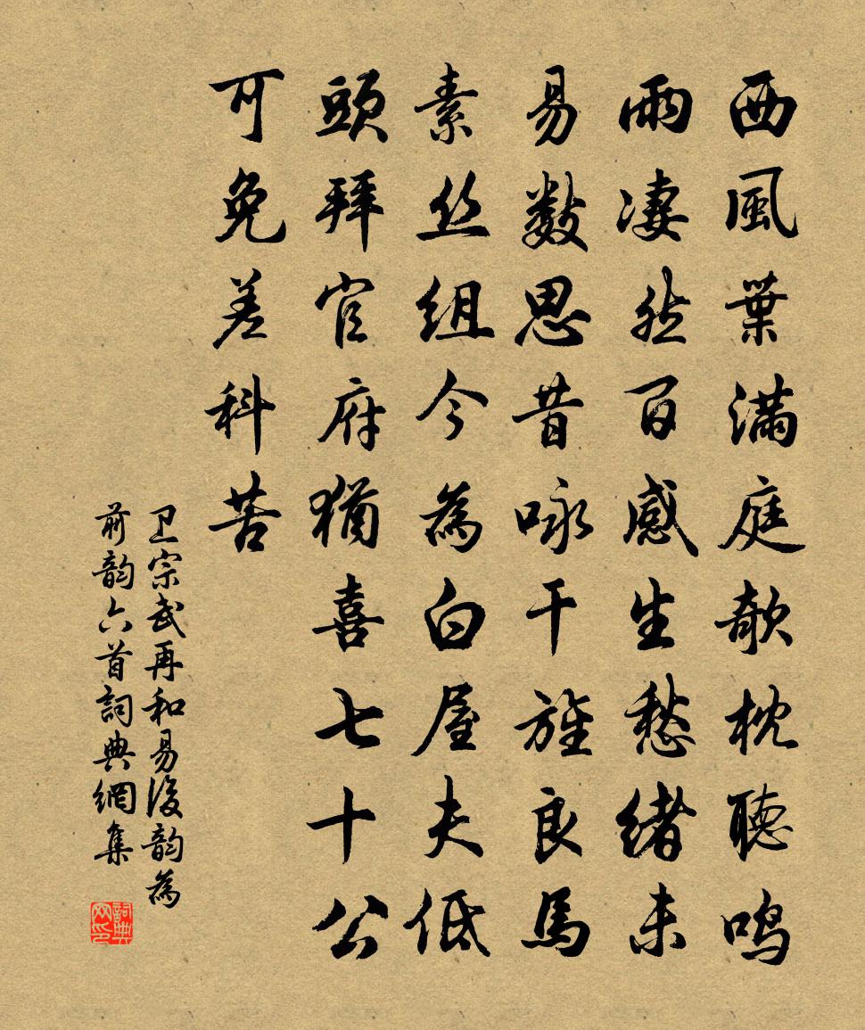 詩詞名句歷史字典書法欣賞書法字典國語詞典說文解字康熙字典古漢語字典標 題 作 者 詩 句 再和易後韻為前韻六首作者:衛宗武 朝代:宋代再和易後韻為前韻六首原文西風葉滿庭,欹枕聽鳴雨。悽然百感生,愁緒未易數。思昔詠乾旌,良馬素絲組。今為白屋夫,低頭拜官府。猶喜七十公,可免差科苦。詩詞問答問:再和易後韻為前韻六首的作者是誰?答:衛宗武問:再和易後韻為前韻六首寫於哪個朝代?答:宋代衛宗武再和易後韻為前韻六首書法欣賞再和易後韻為前韻六首書法作品詩詞推薦雪晴施樞〔宋代〕送臘終宵舞,知春破曉晴。燒痕隨草長,霽色映梅清。溜滴檐簪折,冰開沼鏡明。夜窗如對月,還又憶輕盈。與薛肇明奕棋賭梅花詩輸一首王安石〔宋代〕華發尋春喜見梅,一株臨路雪培堆。鳳城南陌他年憶,杳杳難隨驛使來。高帝求賢詔班固〔兩漢〕蓋聞王者莫高於周文,伯者莫高於齊桓,皆待賢人而成名。今天下賢者智慧型,豈特古之人乎?患在人主不交故也,張谷田舍鄭谷〔唐代〕縣官清且儉,深谷有人家。一逕入寒竹,小橋穿野花。碓喧春澗滿,梯倚綠桑斜。自說年來稔,前村酒可賒。紹興祀岳鎮海瀆四十三首佚名〔宋代〕我祀伊何,於彼長淮。尋源桐柏,委注蓬萊。扞齊肪楚,宣威示懷。豆籩列陳,亦孔之偕。樂府雜曲。鼓吹曲辭。有所思孟郊〔唐代〕桔槔烽火晝不滅,客路迢迢信難越。古鎮刀攢萬片霜,寒江浪起千堆雪。此時西去定如何,空使南心遠淒切。浮碧亭王炎〔宋代〕鳧舄飛來空翠間,萬家聯絡擁風煙。箇中杖屨宜頻到,此外樓台總浪傳。山似蓬萊差可近,水疑渤澥欲無邊。湘妃錦園雙桂植之二十八年未嘗著花今忽盛開紫趺喻良能〔宋代〕疇昔栽雙桂,於今四七秋。紫趺香冉冉,金蕊色浮浮。標緻殊他桂,風流最蓐收。無才強摹寫,著語故難遒。憑闌陳普〔宋代〕南浦路東西,佳人不可期。斷雲荒草渡,歸鳥夕陽枝。心事十二曲,頭顱大半絲。低回問流水,去去復何之。和胡季永赴季文遊園良集之韻,聊以致私怨於楊萬里〔宋代〕有酒招元亮,無漿饋子居。何曾三不速,焉用一行書。乞飲殊無分,於時不已疏。猶應慰大嚼,玉軸到吾廬。海陽十詠蒙池劉禹錫〔唐代〕瀠渟幽壁下,深淨如無力。風起不成文,月來同一色。地靈草木瘦,人遠煙霞逼。往往疑列仙,圍棋在岩側。香港感懷十首黃遵憲〔清代〕豈欲珠崖棄,其如城下盟。帆檣通萬國,壁壘遏三城。虎穴人雄據,鴻溝界末明。傳聞哀痛詔,猶灑淚縱橫。送行詩鄭清之〔宋代〕半生霜鬢飄萍跡,幾度風餐系柳船。舞詠未忘雩里在,去來翻似賈胡然。先生自是今和靖,林下端能友士賢。二畝瑪瑙杯歌錢起〔唐代〕瑤溪碧岸生奇寶,剖質披心出文藻。良工雕飾明且鮮,得成珍器入芳筵。含華炳麗金尊側,翠斝瓊觴忽無色。詹弦史畫吟邵雍〔宋代〕史筆善記事,畫筆善狀物。狀物與記事,二者各得一。詩史善記意,詩書善狀情。狀情與記意,二者皆能精。狀情游紫微觀阮閱〔宋代〕春來猶未到多庭,桃杏離披柳已青。直待斜陽方興盡,一筇獨立紫微亭。夏日游目聊作駱賓王〔唐代〕暫屏囂塵累,言尋物外情。致逸心逾默,神幽體自輕。浦夏荷香滿,田秋麥氣清。詎假滄浪上,將濯楚臣纓。桂枝香王安石〔宋代〕登臨送目。正故國晚秋,天氣初肅。千里澄江似練,翠峰如簇。歸帆去棹殘陽里,背西風、酒旗斜矗。彩舟雲淡,熙春園楊蟠〔宋代〕桃源未識恐微茫,每坐青林慣日長。魚鳥自同千里樂,風煙漫逐一城香。竹圍月色來深院,花引春情過短牆。人世禪人寫師真請贊釋慧遠〔宋代〕倒數一二三,翻成四五六。蹋斷獨木橋,唱起雲門曲。急似箭,直如弦。列祖不知何處去,瞎驢依舊痛加鞭。名句推薦落月滿屋樑,猶疑照顏色。杜甫《夢李白二首·其一》 善在身,介然必以自好也;不善在身,菑然必以自惡也。荀子《荀子·修身》 殘雪庭陰,輕寒簾影,霏霏玉管春葭。王沂孫《高陽台·和周草窗寄越中諸友韻》 昔我往矣,楊柳依依。佚名《採薇》 南浦淒淒別,西風裊裊秋。白居易《南浦別》 如何同枝葉,各自有枯榮李白《樹中草》 卷旗夜劫單于帳,亂斫胡兒缺寶刀。馬戴《出塞詞》 射有似乎君子。失諸正鵠,反求諸其身。子思《中庸·第十四章》 征馬分飛日漸斜,見此空為人所嗟。孟浩然《高陽池送朱二》 背法而治,此任重道遠而無馬、牛,濟大川而無舡、楫也。商鞅《商君書·弱民》