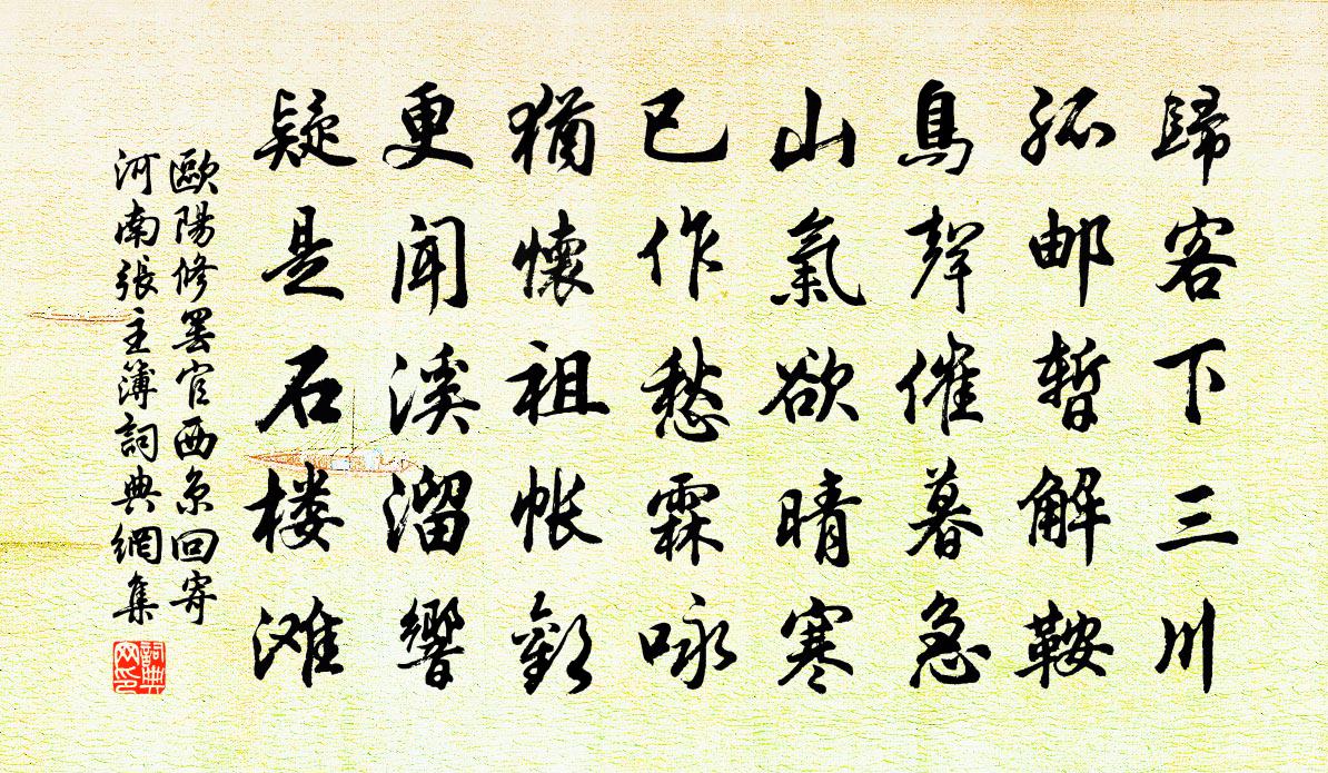詩詞名句歷史字典書法欣賞書法字典國語詞典說文解字康熙字典古漢語字典標 題 作 者 詩 句 罷官西京回寄河南張主簿作者:歐陽修 朝代:宋代罷官西京回寄河南張主簿原文歸客下三川,孤郵暫解鞍。鳥聲催暮急,山氣欲晴寒。已作愁霖詠,猶懷祖帳歡。更聞溪溜響,疑是石樓灘。詩詞問答問:罷官西京回寄河南張主簿的作者是誰?答:歐陽修問:罷官西京回寄河南張主簿寫於哪個朝代?答:宋代問:歐陽修的名句有哪些?答:歐陽修名句大全歐陽修罷官西京回寄河南張主簿書法欣賞罷官西京回寄河南張主簿書法作品詩詞推薦蝶戀花(惜春)張震〔宋代〕梅子初青春已暮。芳草連雲,綠遍西池路。小院繡垂簾半舉。銜泥紫燕雙飛去。人在赤闌橋畔住。不解傷春,還解遣興 其三王冕〔元代〕老來百病出,坐臥不能安。稍得春風暖,尋憂夜雨寒。中原人倥傯,南國步艱難。薇省分權重,匡時自選官。太常樂章三十首其十六皇帝行奏隆安之曲楊億〔宋代〕禮備樂成,乾健天行。帝容有穆,佩玉鏘鳴。和李德裕游漢州房公湖二首鄭浣〔唐代〕太尉留琴地,時移重可尋。徽弦一掩抑,風月助登臨。榮駐青油騎,高張白雪音。祗言酬唱美,良史記王箴。靜對柘軒李侗〔宋代〕耕桑本是吾儒事,不免饑寒智者非。出處自然皆有據,不應感念泣牛衣。長至壽廣西提刑吳大卿曾豐〔宋代〕無量壽佛今壽皇,家傳室授不老方。九轉丹砂一仁念,函四大海為壽鄉。仁氣所覃莫非壽,椿松龜鶴不足當。三公雜詠四首范仲淹〔宋代〕鏗鏗千古嶧山桐,金石聲來造化中。誰道元和無復致,為君堂上起薰風。贈弈棋藍氏子李仲光〔宋代〕古人制此文楸枰,要下黑白知死生。閒中藉此消永日,未必能取人心爭。後人不識古人意,致使方寸生縱橫。爛柯山中雜興 十三王冕〔元代〕山園無定式,力作是生涯。近水多栽竹,依岩半種茶。春風低小草,夜雨出新沙。不必聞時事,城中減大家。即席次韻微之泛舟王安石〔宋代〕畫舸幽尋北果園,應將陳跡問桑門。地隨牆墅行多曲,天著岡巒望易昏。故國時平空有木,荒城人少半為村。悠悠秋竹曲謝朓〔南北朝〕{女便}娟綺窗北。結根未參差。從風既裊裊。映日頗離離。欲求棗下吹。別有江南枝。但能凌白雪。貞心蔭曲池六月初二日作丘葵〔宋代〕萬古青天萬古山,頹然形氣太虛間。氤氳開門無窮妙,只見飛雲日往還。恭和皇帝宸翰四絕句胡仲弓〔宋代〕憑嵩望殺舊山川,萬里雲迷不盡天。汴水流經淮泗去,更無人買北歸船。點絳唇(艷香茉莉)王十朋〔宋代〕畏日炎炎,梵香一炷薰亭院。鼻根充滿。好利心殊淺。貝葉書名,名義誰能辨。西風遠。勝鬟不見。喜見瓊花面。蒙示黃磵佳詩三讀欽羨輒繼韻仰報嘉賜陳與義〔宋代〕痴兒了官事,官事那可訖。豈知公偷閒,臨水照纓紱。雖微八川雄,暴怒常至沸。儻或似山陰,清流可共祓。貪德送樂安教諭周亦山何希之〔宋代〕獨佩傳家印,芹宮一線春。居然風月意,笑卻簿書塵。溪水吾同味,檐花道固貧。迂寒從獻笑,肯與俗為鄰。走馬樓三更曲溫庭筠〔唐代〕春姿暖氣昏神沼,李樹拳枝紫芽小。玉皇夜入未央宮,長火千條照棲鳥。馬過平橋通畫堂,虎幡龍戟風飄揚。簾間酬張相公見寄貫休〔唐代〕周郎懷抱好知音,常愛山僧物外心。閉戶不知芳草歇,無能唯擬住山深。感通未合三生石,騷雅歡擎九轉金。但似過乘如禪師蕭居士嵩丘蘭若王維〔唐代〕無著天親弟與兄,嵩丘蘭若一峰晴。食隨鳴磬巢烏下,行踏空林落葉聲。迸水定侵香案濕,雨花應共石床平。深洞曳杖姜特立〔宋代〕曳杖度林樾,晴光破衰顏。好鳥忽相鳴,覺我身世閒。身世誰自覺,此妙吾獨觀。正以靜得之,樂哉天地寬。名句推薦歲月匆匆留不住,鬢已星星堪鑷。吳淵《念奴嬌·我來牛渚》 傍鄰聞者多嘆息,遠客思鄉皆淚垂。李頎《聽安萬善吹觱篥歌》 近重陽、偏多風雨,絕憐此日暄明。姚雲文《紫萸香慢·近重陽》 秋到長門秋草黃。畫梁雙燕去,出宮牆。薛昭蘊《小重山·秋到長門秋草黃》 和戎詔下十五年,將軍不戰空臨邊。陸游《關山月》 衣懶換,酒難賒。可憐此夕看梅花。吳文英《思佳客·癸卯除夜》 遠書歸夢兩悠悠,只有空床敵素秋。李商隱《端居》 昨夜醉眠西浦月。今宵獨釣南溪雪。洪适《漁家傲引·子月水寒風又烈》 穩當話,卻是平常話,所以聽穩當話者不多王永彬《圍爐夜話·第四則》 江山留勝跡,我輩復登臨。孟浩然《與諸子登峴山》