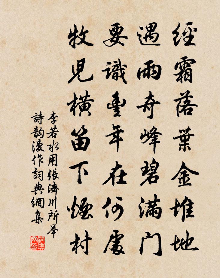 詩詞名句歷史字典書法欣賞書法字典國語詞典說文解字康熙字典古漢語字典標 題 作 者 詩 句 用張濟川所舉詩韻漫作作者:李若水 朝代:宋代用張濟川所舉詩韻漫作原文經霜落葉金堆地,遇雨奇峰碧滿門。要識豐年在何處,牧兒橫笛下煙村。詩詞問答問:用張濟川所舉詩韻漫作的作者是誰?答:李若水問:用張濟川所舉詩韻漫作寫於哪個朝代?答:宋代李若水用張濟川所舉詩韻漫作書法欣賞用張濟川所舉詩韻漫作書法作品詩詞推薦回文暮春吳光〔宋代〕嬌聲囀處藏鸚小,美睡濃時落日斜。橋拂柳溪深漲水,眼驚春雨過飛花。五絕呈李惟學山長王奕〔宋代〕鑄金為蠡聲猶泯,磨石為碑字亦漫。雜雜萬形歸五化,燼餘方策更長存。次韻高蓼洪咨夔〔宋代〕隰葒照眼似舡窗,只欠沙頭野鴨雙。花引穟垂丹作佩,葉扶節起翠為幢。婦收滋味歸羹鼎,兒挹馨香赴酒缸。老我仙人文同〔宋代〕頭梳三角髻,余發散垂腰。時伴秦樓女,月明吹紫簫。鷓鴣天劉秉忠〔元代〕垂柳風邊拂萬絲。春光照眼惜花枝。鳳城好景誰來賞,忙殺悠悠世上兒。歌近耳,酒盈卮。十分勸飲欲推辭。人生謝耕道一犁春雨圖蘇泂〔宋代〕好事圖形復賦詩,豈知真箇把鋤犁。野人開卷微微笑,最憶輕簑帶濕歸。東林寺上方塔董嗣杲〔宋代〕塵外乾坤豈易窺,上方尋勝短筇隨。病僧借榻山衣破,臥佛當門石塔危。亂竹迸階交密樹,荒苔沿壁纏疏枝。幅巾游太山四首其二四禪寺蘇轍〔宋代〕山蹊容車箱,深入遂有得。古寺依岩根,連峰轉相揖。樵蘇草木盡,佛事亦蕭瑟。居僧麋鹿人,對客但羞澀。雙碑道中艾性夫〔宋代〕共僧分晚供,呼渡立橋東。雁背西風緊,漁梁落照紅。雲添疏樹影,葉補敗船蓬。舊日津亭酒,黃壚蔓草中。菩薩蠻(次張秉道韻)舒亶〔宋代〕真珠酒滴琵琶送。行雲舊識巫山夢。空得醉中歸。老來心事非。江梅含日暖。照水花枝短。密葉似商量。向人春意以紗巾寄魯望因而有作皮日休〔唐代〕周家新樣替三梁。裹發偏宜白面郎。掩斂乍疑裁黑霧,輕明渾似戴玄霜。今朝定見看花昃,明日應聞漉酒香。更有游何山登道場釋永頤〔宋代〕中流望極山頭寺,溪午聞鍾泊柳津。春草細沾微雨潤,老松高與碧虛鄰。鶴歸煙麓書堂廢,虎去寒岩蘚石皴。無奈思程氏父子兄弟因以寄之邵雍〔宋代〕氣候如當日,山川似舊時,獨來還獨往,此意有誰知。天啟惠酥周邦彥〔宋代〕金城良犉不當車,特為人間作好酥。余湩尚供肥犢子,小匳先入太官廚。鄴中鹿尾空名目,吳地蓴羹謾僻迂。欲比木蘭花慢(壽王實之)劉克莊〔宋代〕瀛洲真學士,為底事、在紅塵。為語觸宮圍,沈香亭里,瞋謫仙人。為親近君側者,見萬言策子惎劉蕡。為是尚方觀月揚千寺門李彌遜〔宋代〕背山靈剎兩松間,待月松前覿面山。雲去月低松影落,倚天唯有碧迴環。和壽州宋待制九題其二春暉亭梅堯臣〔宋代〕卉木日以發,中圃日以嘉。歡言樂和景,及此鬢未華。春風實無幾,凌亂枝上花。山陰況暮月,府仰誠可嗟。過望亭六首楊萬里〔宋代〕晴河不似雨中看,晴里波紋只簟班。卻是雨河新樣巧,簟間織出小金鐶。湖中蜆蚌甚佳村婦調羹名曰水菜餘珍嗜之作水孫銳〔宋代〕春風一夜浪花起,大蚌小蚌浮江沚。漁蓑撒網唶嚄音,滿載論斗不論斤。寄語庖廚煮白湯,脫殼擊肉和椒漿。爛蒸襄武館游眺韋應物〔唐代〕州民知禮讓,訟簡得遨遊。高亭憑古地,山川當暮秋。是時粳稻熟,西望盡田疇。仰恩慚政拙,念勞喜歲收。澹泊名句推薦衝波突出人齊譀,躍浪爭先鳥退飛。盧肇《競渡詩 / 及第後江寧觀競渡寄袁州剌史成應元》 溫故而知新,可以為師矣。孔子弟子《論語·為政篇》 黃雲萬里動風色,白波九道流雪山。李白《廬山謠寄盧侍御虛舟》 此時相望不相聞,願逐月華流照君。張若虛《春江花月夜》 藏巧於拙,用晦而明,寓清於濁,以屈為伸。陳繼儒《小窗幽記·集醒篇》 漉我新熟酒,只雞招近局。陶淵明《歸園田居·其五》 為世用者,百篇無害;不為用者,一章無補。王充《論衡·卷三十·自紀篇》 大道如青天,我獨不得出。李白《行路難三首》 眺聽良多感,徙倚獨沾襟。李密《淮陽感秋》 夜覺曉非,今悔昨失顏之推《顏氏家訓·序致篇》