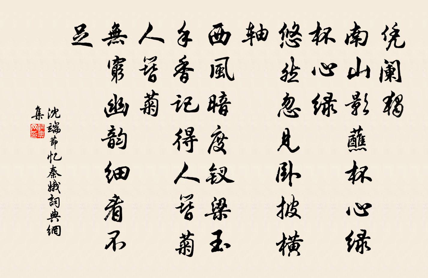 詩詞名句歷史字典書法欣賞書法字典國語詞典說文解字康熙字典古漢語字典標 題 作 者 詩 句 憶秦娥作者:沈端節 朝代:宋代憶秦娥原文憑闌獨。南山影蘸杯心綠。杯心綠。悠然忽見,臥披橫軸。西風暗度釵梁玉。手香記得人簪菊。人簪菊。無窮幽韻,細看不足。詩詞問答問:憶秦娥的作者是誰?答:沈端節問:憶秦娥寫於哪個朝代?答:宋代問:憶秦娥是什麼體裁?答:詞沈端節憶秦娥書法欣賞憶秦娥書法作品詩詞推薦瓶中淮陽紅牡丹落盡有嘆三首楊萬里〔宋代〕又是明年看牡丹,未開芍藥怪春寒。落英滿地不須掃,一片蔫紅也足觀。浣溪沙毛熙震〔唐代〕春暮黃鶯下砌前,水精簾影露珠懸,綺霞低映晚晴天。弱柳萬條垂翠帶,殘紅滿地碎香鈿,蕙風飄蕩散輕煙。花榭答趙景猷曹攄〔魏晉〕精誠之至。崩城隕霜。韓凡丹青。化為鴛鴦。止必交頸。飛必雙翔。願言與汝。攜手同行。情若比目。離如參商。從鄭秀才覓菊二首趙蕃〔宋代〕漫從僧舍移甘菊,清蕊重陽摘未堪。徑欲過君籬下看,二兒端可為輿籃。官冷仇遠〔宋代〕不負平生下澤車,宦遊卜宅亦村墟。家貧累重須乾祿,官冷身閒可讀書。高柳每聞鶯婭奼,破籬時度竹蕭疏。西南元夕大風雨范成大〔宋代〕河傾海立夜翻盆,不獨妨燈更損春。凍澀笙簧猶可耐,滴皴梅頰勢須嗔。九日詠懷簡仁實李洪〔宋代〕登臨勝踐負幽期,山色溪光日益奇。那得賜茱來北闕,漫從採菊向東籬。升虛楚望猶能賦,振履商謳只自悲。可是郡界閔雨州將率官屬禳禬宋祁〔宋代〕劭農方狎野,熯旱嘆焦原。六幕沈雲族,千箱害稼孫。都人望天漢,國相閉陽門。盛怒風生穴,汙邪祝有豚。征徒野螺峰陳岩〔宋代〕野螺倒向空中立,迴旋縈成翠甲長。沫霧濡雲真得計,魚蝦舊侶莫相忘。蝶戀花(餞汪漕使杲勸酒)魏了翁〔宋代〕可煞潼人真慕顧。接得官時,只道來何暮。歲歲何曾摏得住。遂人又見迎將去。謾自兒曹相爾汝。心事同時,千里寄漢陽故人張籍〔唐代〕知君漢陽住,煙樹遠重重。歸使雨中發,寄書燈下封。同時買江塢,今日別雲松。欲問新移處,青蘿最北峰。初入筠州界高岡鋪楊萬里〔宋代〕千尺霜松夾道周,國初涼繖至今留。筠州舊是朝天路,六十年來行信州。秦樓月/憶秦娥黎廷瑞〔宋代〕春脈脈。含章檐下妝宮額。妝宮額。也還點畫,春煙茅結。人間天上俱清絕。風流大似東坡客。東坡客。玉堂如玉宿武安山有懷羅鄴〔唐代〕野店暮來山畔逢,寒蕪漠漠露華濃。窗間燈在犬驚吠,溪上月沈人罷舂。遠別只愁添雪鬢,此生何計隱雲峰。離心送吳時父侍郎二首劉克莊〔宋代〕慧燈溥照人幽隱,心秤能權物重輕。士子比之常相國,吏民道是蔡端明。來時稻蟹非常熟,去日琴龜作伴行。安得竹溪直院盛稱起予草堂詩之善暇日覽之多有可劉克莊〔宋代〕李下雖雲僻,行人冷處看。彼方垂美實,渠可整巍冠。才見花初縞,俄驚核可鑽。吾寧墊雨過,君欲切雲難。鶯集四和項安世〔宋代〕一州如許斗大,四海望公則深。事業本無奇巧,聖賢只有虛心。紅頭紫賈似道〔宋代〕紅頭紫勇敵剛強,項赤紅班腿長{外囗內昆}長。翅紫牙灣如桑剪,此蟲名號促織王。侯家胡宿〔唐代〕洞戶春遲漏箭長,短轅初返雒陽傍。彩雲按曲青岑醴,瀋水薰衣白璧堂。前檻蘭苕依玉樹,後園桐葉護銀床。宴殘行吟二首梅堯臣〔宋代〕持轡趨代北,妄意希名馬。代北馬如雲,由來重取捨。王官待才能,高下不苟且。行都未修飭,黃金誰變瓦。吾當名句推薦三日入廚下,洗手作羹湯。王建《新嫁娘詞三首》 閒門向山路,深柳讀書堂。劉昚虛《闕題》 暗相思,無處說,惆悵夜來煙月。韋莊《應天長·別來半歲音書絕》 置冠服,有定位。勿亂頓,致污穢。李毓秀《弟子規·謹》 不積跬步,無以致千里;不積小流,無以成江海。李昉、李穆、徐鉉《太平御覽·學部·卷一》 坐看黑雲銜猛雨,噴灑前山此獨晴。崔道融《溪上遇雨二首》 歸來三徑重掃,松竹本吾家。葉夢得《水調歌頭·秋色漸將晚》 仁者見之謂之仁,知者見之謂之知佚名《易傳·繫辭傳上·第五章》 詩成自寫紅葉,和恨寄東流。晏幾道《訴衷情·憑觴靜憶去年秋》 秦中花鳥已應闌,塞外風沙猶自寒。王翰《涼州詞二首》