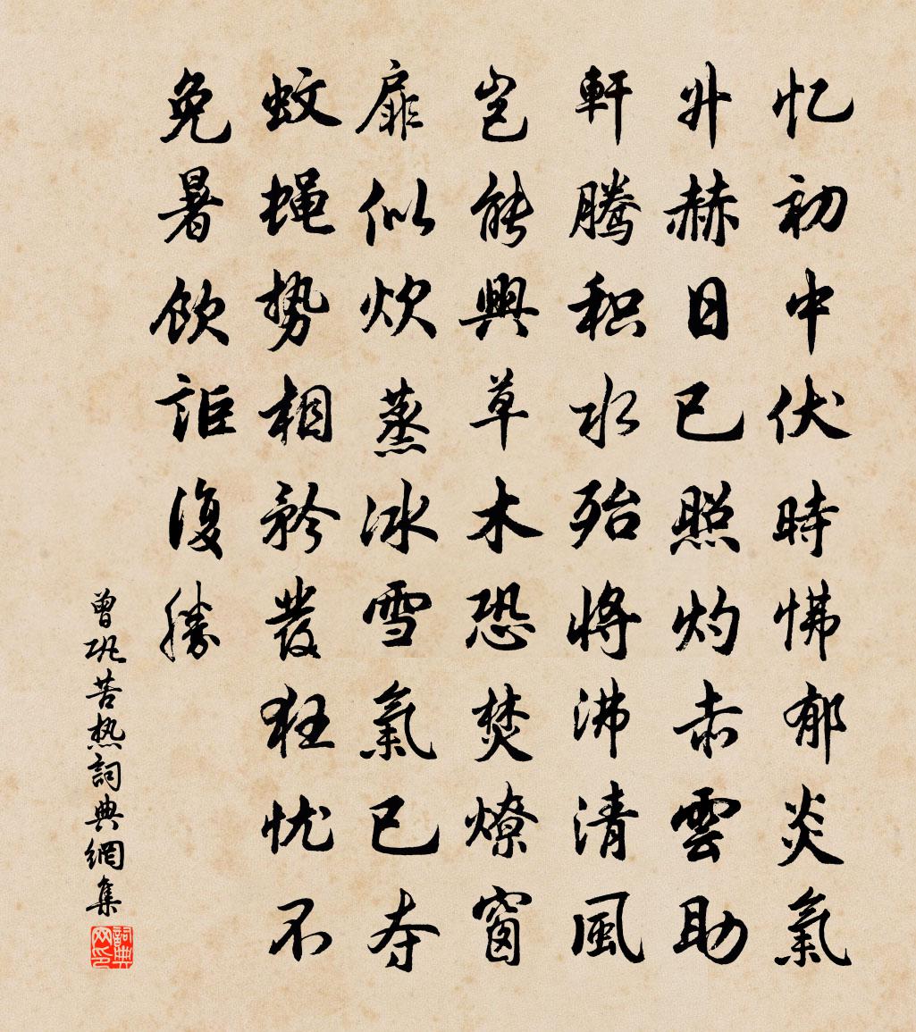 詩詞名句歷史字典書法欣賞書法字典國語詞典說文解字康熙字典古漢語字典標 題 作 者 詩 句 苦熱作者:曾鞏 朝代:宋代苦熱原文憶國中伏時,怫鬱炎氣升。赫日已照灼,赤雲助軒騰。積水殆將沸,清風豈能興。草木恐焚燎,窗扉似炊蒸。冰雪氣已奪,蚊蠅勢相矜。發狂憂不免,暑飲詎復勝。詩詞問答問:苦熱的作者是誰?答:曾鞏問:苦熱寫於哪個朝代?答:宋代曾鞏苦熱書法欣賞苦熱書法作品詩詞推薦與韓撫乾大倫八首袁燮〔宋代〕等閒援筆賦新篇,句法新奇思湧泉。絕勝唐人作詩苦,推敲一字強雕鐫。金陵懷古六首周文璞〔宋代〕孫伯陵頭水最悲,蔣侯廟下月來遲。夜深行客心驚恐,猿掛晉朝楓樹枝。聞虜人敗於柘皋作口號十首龐謙孺〔宋代〕一自官軍報捷頻,番人無數願歸明。渠魁未必能方略,所恃多多以力爭。挽李樓峰馬廷鸞〔宋代〕短槧傳邊警,長篇罄畝忠。危邦韜晝錦,劇盜剪春蔥。地隔幾廬舍,天憐兩禿翁。而今吾後死,作傳豈能工。華亭百詠鳳皇山許尚〔宋代〕覽德來何代,慵歸丹穴藏。甘心化為石,萬歲瑞吾皇。郴江百詠並序雕玉山阮閱〔宋代〕{倍亻換山}嶁崎嶇面碧霄,何曾溫潤似瓊瑤。一堆頑石彬江上,縱有昆刀不可雕。題閻才元喜雪堂葉適〔宋代〕東來十月黃塵滿,霰點霜花總未堪。恰是使君誠意足,帶將臘雪赴荊南。題米芾山水趙文〔宋代〕遠山濃淡幾無影,遠樹高低略帶行。不是模糊並紙敗,無人知是米元章。贈劉相士華岳〔宋代〕班超未侯漢,誰識烏孫客。韓信已王齊,誰知長樂厄。彼亦非異術,忠諛分黑白。直道世且違,彼亦何足責。自古晚題東林寺雙池白居易〔唐代〕向晚雙池好,初晴百物新。裊枝翻翠羽,濺水躍紅鱗。萍泛同遊子,蓮開當麗人。臨流一惆悵,還憶曲江春。秋晚過北渡舒岳祥〔宋代〕淒涼客路趁長川,荷葉無衣柳不綿。日暮正愁無宿處,亂鴉飛下有人煙。題平遼碑宇文虛中〔金代〕十丈豐碑勢倚空,風雲猶憶下遼東。百年功業秦皇帝,一代文章太史公。石斷雲鱗秋雨後,苔封鰲背夕陽中。行人上元前一日,游東國看紅梅右題停罷坊場圖三楊萬里〔宋代〕欲折紅梅朵,看來不忍攀。周回尋四處,恰得一枝繁。次韻張耒學士病中二首蘇轍〔宋代〕一臥憐君三十朝,呼醫仍苦禁城遙。靈根自遂新陽發,病枿從經野火燒。吻燥未須尋麴櫱,囊空誰與典絺蕉。何時臨海所居三首顧況〔唐代〕此是昔年征戰處,曾經永日絕人行。千家寂寂對流水,唯有汀洲春草生。此去臨溪不是遙,樓中望見赤城標。不知鴻門舞劍歌汪宗臣〔宋代〕黑雲壓壘騅嘶風,荊軻聶政粗豪同。舞筵閃動青蛇影,焉知火帝生真龍。一劍剡剡匹夫勇,一劍翼翼隨西東。壯士雜興張鎡〔宋代〕掄才如百藥,治效各不同。儻能區別性,當聚和扁功。武德定亂後,諸公悉登庸。帝久知所長,未欲任已聰。品題郊壇齋宮七首任希夷〔宋代〕帝籍傍連蠶館桑,禁林喬木書陰涼。卻從謝愉臨江閣,中有通衢夾苑牆。次韻張司戶陳造〔宋代〕他日猶能說宦遊,老禁多病厭漂流。近臨西蜀窺鮫室,舊傍東溟看蜃樓。歸計已嗟霜蟹晚,吟聲閒伴侯蟲秋。塵冠贈護國寺山上宏道者顧逢〔宋代〕三十年趺坐,何曾下此山。忘形超物外,無夢到人間。窗暗月來照,門開風自關。虎狼情亦狎,夜夜廟前還。名句推薦半天涼月色,一笛酒人心。袁枚《夜過借園見主人坐月下吹笛》 惟有兩行低雁,知人倚、畫樓月。范成大《霜天曉角·梅》 雨中禁火空齋冷,江上流鶯獨坐聽。韋應物《寒食寄京師諸弟》 無事不登三寶殿馮夢龍《警世通言·卷二十八》 二月湖水清,家家春鳥鳴。孟浩然《春中喜王九相尋 / 晚春》 捫蘿正意我,折桂方思君。范雲《送沈記室夜別》 露下旗濛濛,寒金鳴夜刻。李賀《塞下曲》 逢郎欲語低頭笑,碧玉搔頭落水中。白居易《採蓮曲》 獨上江樓思渺然,月光如水水如天。趙嘏《江樓舊感》 無情燕子,怕春寒、輕失花期。晁沖之《漢宮春·梅》
