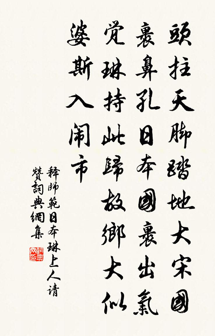 詩詞名句歷史字典書法欣賞書法字典國語詞典說文解字康熙字典古漢語字典標 題 作 者 詩 句 日本琳上人請贊作者:釋師範 朝代:宋代日本琳上人請贊原文頭拄天,腳踏地。大宋國裹鼻孔,日本國裹出氣。覺琳持此歸故鄉,大似婆斯入鬧市。詩詞問答問:日本琳上人請贊的作者是誰?答:釋師範問:日本琳上人請贊寫於哪個朝代?答:宋代釋師範日本琳上人請贊書法欣賞日本琳上人請贊書法作品詩詞推薦冬早書事楊時〔宋代〕窈冥誰為宰爐錘,榮謝唯知歲序催。臘日未經梅已綻,春風尚遠凍先開。愁無潤澤歸芳樹,獨有餘寒著死荄。收盡柳橋晚眺陸游〔宋代〕小浦聞魚躍,橫林待鶴歸。閒雲不成雨,故傍碧山飛。秋日即事三首王之道〔宋代〕今日知何日,西風正得秋。天心方祚漢,人物合師留。才略煩威敵,聲名賴鎮浮。不妨臨賦樂,汎汎有楊舟。賀新郎(童養合卺)彭子翔〔宋代〕一點陽春小。傍妝檯、梅梢粉嫩,桃花紅透。合卺樽前人笑語,銀燭兩行紅補。雲正暖、流蘇香獸。金屋阿嬌元共曲肱詩二十首白玉蟾〔宋代〕謫君塵世意徘徊,煉盡金丹待鶴來。歸去神霄朝玉帝,依前命我掌風雷。夏安居日過實上人東軒時新竹浴雨因作句歌之釋正覺〔宋代〕籜龍出叢林,脫錦露新綠。昂藏引頭角,密密均節目。娟然塵外姿,雲霧膩寒玉。翠滿東窗陰,心眼掃惡俗。虛靜題茅山李尊師所居(一作秦系詩)嚴維〔唐代〕天師百歲少如童,不到山中更不逢。洗藥每臨新瀑水,步虛時繞最高峰。籬根五月留殘雪,座右千年蔭古松。此去秋晚信州推院親友或責無書,即事寄答韓琮〔唐代〕官信安仁拙,書非叔夜慵。謬馳驄馬傳,難附鯉魚封。萬里勞何補,千年運忝逢。不量橫草力,虛慕入雲蹤。潔水用厚後弟強甫韻劉克莊〔宋代〕先皇親為扁溪庵,奎畫煌煌陽世南。多病安知年望九,歸耕何幸歲登三。新詩有弟聊相屬,前事無人與共談。作飲水亭待孫元京遇之歸途方回〔宋代〕獨向水亭坐,未聞詩友來。入城還偶遇,下馬與同回。各已泥雙屨,終難致一杯。菰蒲偃微雨,忽見野蓮開。醉贈劉十二(一作寄嶺南張明府)殷堯藩〔唐代〕春草正淒淒,知君過惡溪。鶯將吉了語,猿共猓然啼。別路魂先斷,還家夢幾迷。定尋雷令劍,應識越王笄。樹色出惠山遙望橫山楊萬里〔宋代〕三日橫山反覆看,殷懃送我惠山前。常州更在橫山外,只望橫山已杳然。金丹詩四十八首張繼先〔宋代〕阿爾多淫上帝嗔,罰為狐獸尾隨身。只言五百年方變,豈謂三千日化神。雷火不知何處用,犬牙同此作教親。冤魔贈至寂禪師朱慶餘〔唐代〕處世唯據衲,禪門幾歲寒。法空無所染,性悟不多看。竟日門長掩,相逢草自殘。有時尋道侶,飛錫度峰巒。思賢頓(即望賢宮也)李商隱〔唐代〕內殿張弦管,中原絕鼓鼙。舞成青海馬,斗殺汝南雞。不見華胥夢,空聞下蔡迷。宸襟他日淚,薄暮望賢西。湖南江西道中十首劉克莊〔宋代〕丁男放犢草間嬉,少歸看蠶不畫眉。歲暮家家禾絹熟,萍鄉風物似豳詩。木蘭花令黃庭堅〔宋代〕庾郎三九常安樂。使有萬錢無處著。徐熙小鴨水邊花,明月清風都占卻。朱顏老盡心如昨。萬事休休休莫莫。樽前明神李商隱〔唐代〕明神司過豈令冤,暗室由來有禍門。莫為無人欺一物,他時須慮石能言。南鄉子·集調名龔翔麟〔清代〕撥棹驀山溪。月上瓜州楊柳枝。金盞玉人歌解佩。一片子。綠蓋舞風輕簇水。讀樂天集戲作五絕蘇轍〔宋代〕樂天得法老凝師,後院猶存楊柳枝。春盡絮飛餘一念,我今無累日無思。名句推薦玉碗冰寒滴露華,粉融香雪透輕紗。晏殊《浣溪沙·玉碗冰寒滴露華》 聖人不期修古,不法常可,論世之事,因為之備。韓非及後人《韓非子·五蠹》 日星隱曜,山嶽潛形;范仲淹《岳陽樓記》 疏影橫斜水清淺,暗香浮動月黃昏。林逋《山園小梅·其一》 琴書倦,鷓鴣喚起南窗睡。謝逸《千秋歲·詠夏景》 暗暗淡淡紫,融融冶冶黃。李商隱《菊花》 獨有宦遊人,偏驚物候新。杜審言《和晉陵陸丞早春遊望》 武皇去金閣,英威長寂寞江淹《銅爵妓》 士不以利移、不為患改。劉向《說苑·談叢》 知往日所往之非,則學日進矣王永彬《圍爐夜話·第五六則》