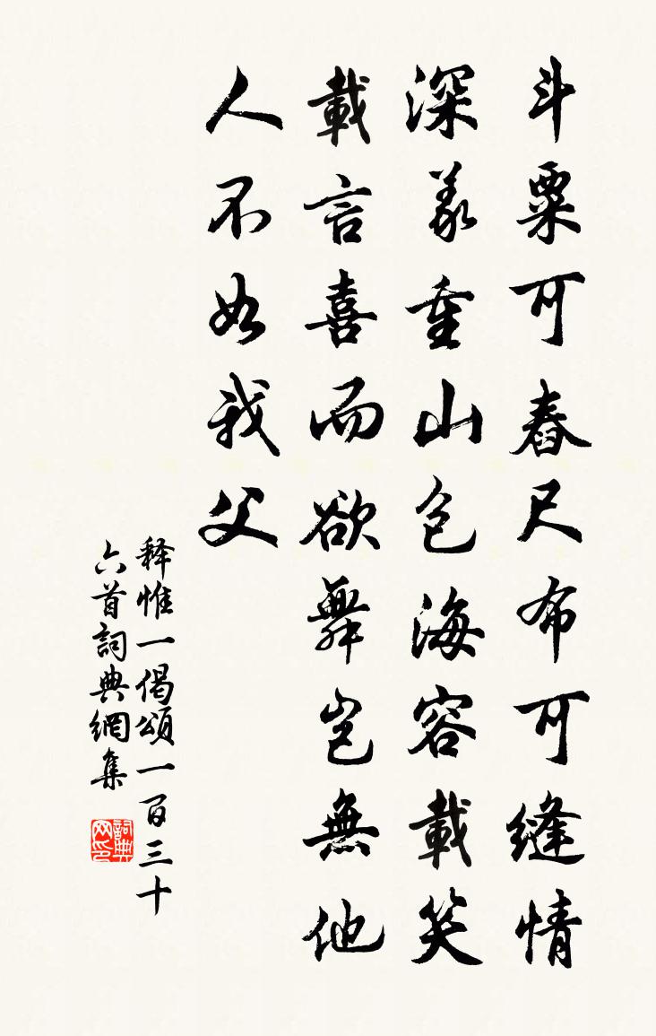 詩詞名句歷史字典書法欣賞書法字典國語詞典說文解字康熙字典古漢語字典標 題 作 者 詩 句 偈頌一百三十六首作者:釋惟一 朝代:宋代偈頌一百三十六首原文斗粟可舂,尺布可縫。情深義重,山包海容。載笑載言,喜而欲舞。豈無他人,不如我父。詩詞問答問:偈頌一百三十六首的作者是誰?答:釋惟一問:偈頌一百三十六首寫於哪個朝代?答:宋代釋惟一偈頌一百三十六首書法欣賞偈頌一百三十六首書法作品詩詞推薦荷花楊巽齋〔宋代〕翠蓋紅幢耀日鮮,西湖佳麗會群仙。波平十里舖雲錦,風度清香趁畫船。浪淘沙(九日登釣台懷思溪舊遊)善珍〔宋代〕七十二年翁。曾客吳中。清游占斷水晶宮。幾度藕花歸棹晚,月渚煙鍾。追記已陳蹤。回首空濛。恁高荒草夕陽同喜公權仲逢垂訪朱長文〔唐代〕高軒相約訪柴關,瀟灑如君會合難。雨徑偕行穿履濕,風亭久佇袷衣寒。百忙好向閒中息,萬動宜當靜處看。公暇衡岳左右道旁茅舍竹門中有老人八十一歲宣和鄭剛中〔宋代〕茅舍柴門書亦扃,松姿鶴骨向人情。闔門饘粥千金重,九品冠裳一唾輕。仁義至頭焉用稼,聲名真是豈其卿。我慚松陳景沂〔宋代〕遠吹疏疏奏竹房,亂撩松友發清狂。雲拖雨陣沿山至,岩溲泉聲走澗長。和我微吟似音律,續他高韻費思量。誰人雜賦陸游〔宋代〕昔人莽莽荒丘里,陳跡紛紛朽簡中。畢竟是非誰辨得,舉杯吾欲問虛空。將至韶州先寄張端公使君借圖經韓愈〔唐代〕曲江山水聞來久,恐不知名訪倍難。願借圖經將入界,每逢佳處便開看。去冬十二月與成父分袂於上饒春見於溧陽又見趙蕃〔宋代〕客里凡重見,天涯竟獨歸。急難徒眷眷,離別倍依依。夏木青圍幄,春流綠染衣。與俱端不惡,吾事故成遲。船頭韓偓〔唐代〕兩岸綠蕪齊似翦,掩映雲山相向晚。船頭獨立望長空,日艷波光逼人眼。逼仄行,贈畢曜杜甫〔唐代〕逼仄何逼仄,我居巷南子巷北。可恨鄰裡間,十日不一見顏色。自從官馬送還官,行路難行澀如棘。我貧無乘非無再次贈張學錄韻十詩陳造〔宋代〕閱世有順逆,飛埃噎空虛。曠懷略外物,曲士乃拘墟。和劉制乾潛夫陳宓〔宋代〕制閫宣勞已再期,胸中方寸了無私。誰言今日平齊策,不似當年代蔡時。馬上陳琳能草檄,幕中韓愈更長詩。休嫌酇陽行蔡襄〔宋代〕春秋書大水,災患古所評。去年積行潦,田畝魚蛙生。今歲谷翔貴,鼎飪無以烹。繼亦掇原野,草萊不得萌。剝伐題法喜院是院一瓦一木皆自能師手而師丈室惟舒坦〔宋代〕了無情解作攀緣,一缽三衣只兀然。坐對青山不知老,學人休問祖師禪。和梵才寄林逋處士宋庠〔宋代〕白首江湖傳散人,天弢解盡有天真。漢家不惜青蒲費,終為枚生一裹輪。賀新郎(贈張彥功)劉過〔宋代〕曉印霜花步。夢半醒、扶上雕鞍,馬嘶人去。嵐濕青絲雙轡冷,緩鞚野梅江路。聽畫角,吹殘更鼓。悲壯寒聲撩客次韻十一叔芍藥五絕杜范〔宋代〕手把春花已後春,錦容入眼更成新。憑欄落日渾無□,倍覺君詩信有神。觀燈口號姜夔〔宋代〕遊人總戴孟家蟬,爭托星球萬眼圓。鬧里傳呼大官過,後車多少盡嬋娟。道士夜醮黃庚〔宋代〕步虛聲裹碧雲飛,佩玉珊珊謁紫微。月浸剛風鸞鶴過,仙都道士拜章歸。偈頌一百二十三首釋普度〔宋代〕用文武火,運惡鉗錐。死學者偷心,開人天眼目。大用機前轉轆轆,十分慈悲,十分惡毒。六踞名藍兮一笑來歸,名句推薦明月幾時有?把酒問青天。蘇軾《水調歌頭·丙辰中秋》 涼月如眉掛柳灣,越中山色鏡中看。戴叔倫《蘭溪棹歌》 不見又思量,見了還依舊。李之儀《謝池春·殘寒銷盡》 冀枝葉之峻茂兮,願俟時乎吾將刈。屈原《離騷》 朔風吹雪透刀瘢,飲馬長城窟更寒。盧汝弼《和李秀才邊庭四時怨·其四》 野梅燒不盡,時見兩三花劉基《古戍》 君子養心莫善於誠荀子《荀子·不苟》 亂雲低薄暮,急雪舞迴風。杜甫《對雪》 江湖多風波,舟楫恐失墜。杜甫《夢李白二首·其二》 國危主憂,說者成伍,無益於安危也。商鞅《商君書·農戰》