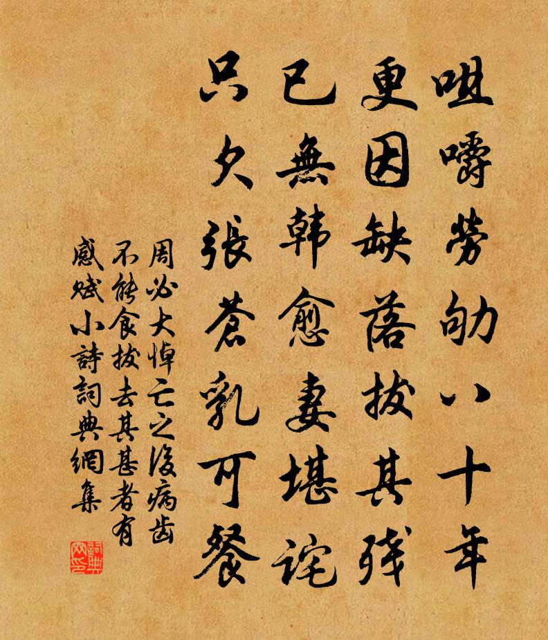 詩詞名句歷史字典書法欣賞書法字典國語詞典說文解字康熙字典古漢語字典標 題 作 者 詩 句 悼亡之後病齒不能食拔去其甚者有感賦小詩作者:周必大 朝代:宋代原文咀嚼勞劬八十年,更因缺落拔其殘。已無韓愈妻堪詫,只欠張蒼乳可餐。詩詞問答問:《悼亡之後病齒不能食拔去其甚者有感賦小詩》的作者是誰?答:周必大問:該詩寫於哪個朝代?答:宋代書法欣賞悼亡之後病齒不能食拔去其甚者有感賦小詩書法作品詩詞推薦墨梅釋普度〔宋代〕常憶西湖處士家,疏枝冷蕊自橫斜。精明一片當時事,只欠清香不欠華。浣溪沙(題湖樓壁)高觀國〔宋代〕一色煙雲澹不消。兩峰眉黛為誰嬌。春寒猶占木蘭橈。燕子似甘愁寂寞,海棠未肯醉妖嬈。小園嫩約尚蕭條。宿空舲峽青樹村浦陳子昂〔唐代〕的的明月水,啾啾寒夜猿。客思浩方亂,洲浦寂無喧。憶作千金子,寧知九逝魂。虛聞事朱闕,結綬騖華軒。委別東陽郭希呂山園十詠小爛柯陳傅良〔宋代〕促膝有仙凡,爛柯無小大。誰知桃源人,不在秦晉外。王頤赴建州錢監求詩及草書蘇軾〔宋代〕我昔識子自武功,寒廳夜語樽酒同。酒闌燭盡語不盡,倦仆立寐僵屏風。丁寧勸學不死訣,自言親受方瞳翁。嗟余永濟橋張耒〔宋代〕墟廟無人吊毀垣,故橋遺址至今存。侵波野岸生新草,齧石老燙留舊痕。金殿有基藏兔穴,玉輿無路半樵村。甘棠富春吳融〔唐代〕水送山迎入富春,一川如畫晚晴新。雲低遠渡帆來重,潮落寒沙鳥下頻。未必柳間無謝客,也應花里有秦人。嚴光除夜二首陳與義〔宋代〕萬里江湖憔悴身,冬冬街鼓不饒人。只愁一夜梅花老,看到天明付與春。庭前菊蘇泂〔宋代〕百圳黃香十月春,東籬佳節誤陶巾。開花較晚酒羞澀,風味依然似主人。韋居守晚歲常言退休之志因署其居曰大隱洞…因贈絕句元稹〔唐代〕謝公潛有東山意,已向朱門啟洞門。大隱猶疑戀朝市,不知名作罷歸園。送侄孫周上人歸剡余亦入吳門釋行海〔宋代〕三十餘年不在家,齒搖發白眼昏花。如今送子東歸去,心逐征帆過白沙。蘇江陰輓詞樓鑰〔宋代〕萬卷蟠胸次,千篇秀筆端。朝行期奮迅,賢路竟艱難。雖號循良守,欠為文字官。遺編幸無恙,留與後人看。【正宮】端正好_我做的利己佚名〔元代〕我做的利己脫身術,恁做的害眾成家活,恁道我風魔你更風魔。俺這裡無名無利都參破,你利害有他這天來大。 烏李嶠〔唐代〕日路朝飛急,霜台夕影寒。聯翩依月樹,迢遞繞風竿。白首何年改,青琴此夜彈。靈台如可托,千里向長安。飲後獻時相吳士矩〔唐代〕一夕心期一種歡,那知疏散負杯盤。尊前數片朝雲在,不許馮公子細看。遊仙詞三十三首王鎡〔宋代〕懶向東溟釣碧波,醉時自唱太平歌。銀竿插在靈河畔,閒把龍鬚作玉簑。鬻孫謠李思衍〔宋代〕白頭老翁發垂領,牽孫與客摩孫頂。翁年八十死無恤,鄰女孩童困饑饉。去年雖旱猶禾熟,今年飛霜先殺菽。去年初到連江和林公曄先輩李彌遜〔宋代〕投老身名信陸沉,欲將白髮寄遙岑。賦詩未敢師彭澤。抱瓮真堪友漢陰。江面飛橋夸壯麗,山腰臥石必幽深。公才夏夜陸游〔宋代〕六尺筇枝膝上橫,中庭岸幘聽鼉更。露零金掌漢宮曉,月度銀河秦塞明。菡萏晚花香未減,梧桐病葉墮無聲。關河送張明遠歸丹陽金君卿〔宋代〕此行非遠行,何用慘離顏。縱棹豀亭外,清歌樽酒間。相期在西笑,從此望南還。歸去重回首,夕陽江外山。名句推薦水滿田疇稻葉齊,日光穿樹曉煙低。徐璣《新涼》 雞鳴紫陌曙光寒,鶯囀皇州春色闌。岑參《奉和中書舍人賈至早朝大明宮》 年年雪裡。常插梅花醉。李清照《清平樂·年年雪裡》 菊暗荷枯一夜霜。新苞綠葉照林光。蘇軾《浣溪沙·詠橘》 居安思危。思則有備,有備無患左丘明《左傳·襄公·襄公十一年》 珠玉在側,覺我形穢。劉義慶《世說新語·容止》 汀洲采白苹,日落江南春。柳惲《江南曲》 夜寒茅店不成眠,殘月照吟鞭。吳激《訴衷情·夜寒茅店不成眠》 閨中風暖,陌上草薰江淹《別賦》 白髮三千丈,緣愁似個長。李白《秋浦歌十七首》