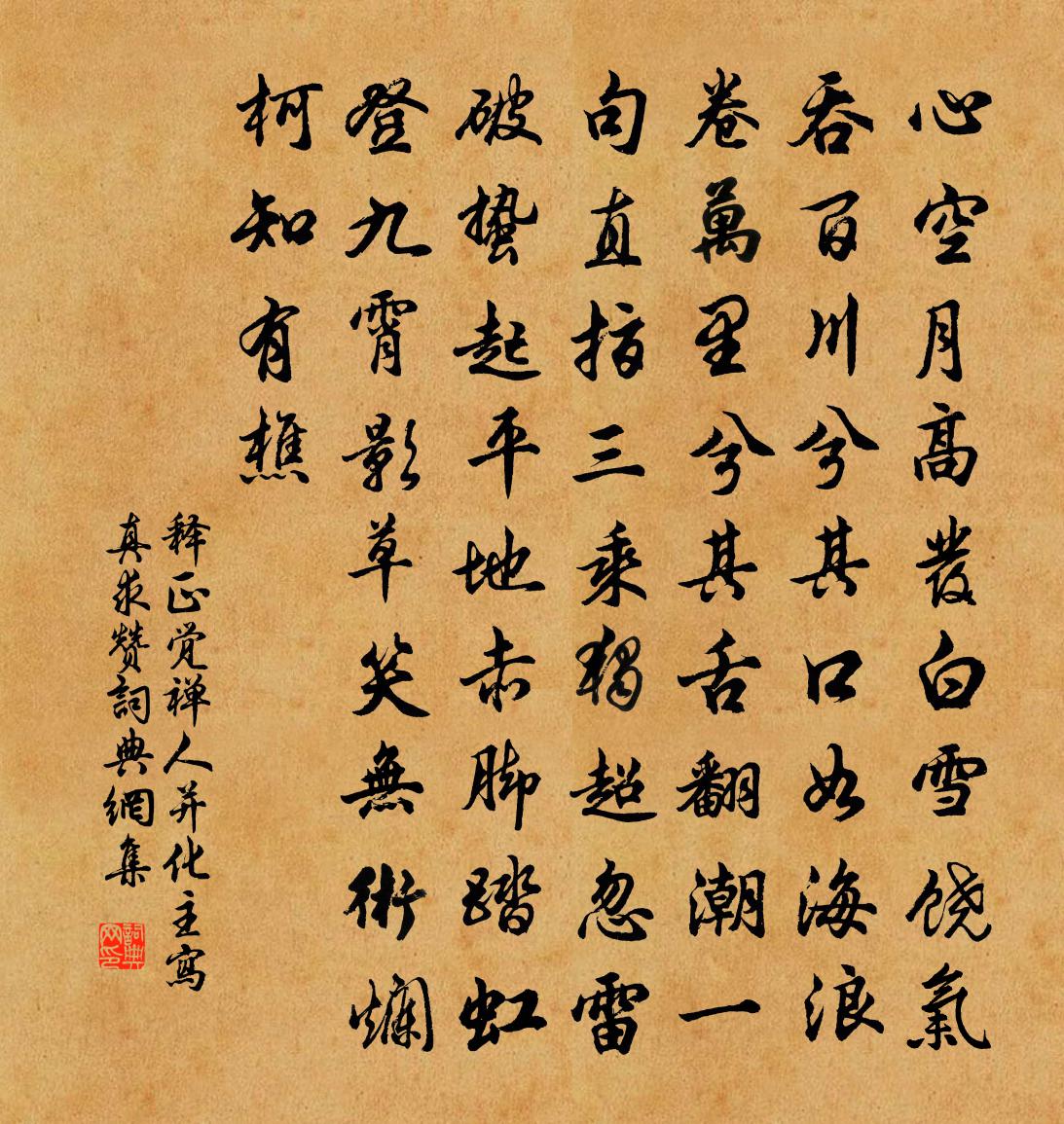 詩詞名句歷史字典書法欣賞書法字典國語詞典說文解字康熙字典古漢語字典標 題 作 者 詩 句 禪人並化主寫真求贊作者:釋正覺 朝代:宋代禪人並化主寫真求贊原文心空月高,發白雪饒。氣吞百川兮其口如海,浪卷萬里兮其舌翻潮。一句直指,三乘獨超。忽雷破蟄起平地,赤腳踏虹登九霄。影草笑無術,爛柯知有樵。詩詞問答問:禪人並化主寫真求贊的作者是誰?答:釋正覺問:禪人並化主寫真求贊寫於哪個朝代?答:宋代釋正覺禪人並化主寫真求贊書法欣賞禪人並化主寫真求贊書法作品詩詞推薦水調歌頭(裴公亭懷古)王以寧〔宋代〕歲晚橘洲上,老葉舞愁紅。西山光翠,依舊影落酒杯中。人在子亭高處,下望長沙城郭,獵獵酒帘風。遠水湛寒碧題淡山岩盛某〔宋代〕黃公丘壑人,閱遍山水奇。晚觀淡岩作,獨許天下稀。我初頗未信,及到乃愧之。偉茲過奇特,驟睹心驚疑。神靈江上師潰彭秋宇〔宋代〕江上西風督戌秋,國人延頸捷隨收。中宵棄甲三軍潰,往歲藏弓百戰休。甚羨虞公前採石,可憐丁謂後雷州。諸賢秋遊白居易〔唐代〕張翰一杯酒,榮期三樂歌。聰明傷混沌,煩惱污頭陀。簟冷秋生早,階閒日上多。近來門更靜,無雀可張羅。兩晉徐夤〔唐代〕三世深謀啟帝基,可憐孀婦與孤兒。罪歸成濟皇天恨,戈犯明君萬古悲。巴蜀削平輕似紙,勾吳吞卻美如飴。誰知和馬粹老四明雜詩聊記里俗耳十首舒坦〔宋代〕稻飯雪翻白,魚羹金門黃。鮚埼千蚌熟,花嶼一村香。海近春蒸濕,湖靈夜放光。北窗休寄傲,大隱即吾鄉。雙泉陳岩〔宋代〕檻泉湧出不多深,兌澤相資互有心。水淨苦嫌塵土污,底須吾欲濯吾襟。送同年孫錫勾簿巢縣宋祁〔宋代〕乾牘公車與願違,卻懷黃綬去江湄。中都食酪憂蒪老,要路編苫笑錦遲。酒幟亭長離帟罷,浪花風穩暝帆移。驚秋和李左藏荔支袁燮〔宋代〕姑射山中冰雪姿,凜然標格欺寒威。一經蒙莊品題後,使人起敬如賓屍。仙風道骨今何有,韶顏豐頰夸絕奇。閩中水調歌頭(燕甲戌進士歸自都城)魏了翁〔宋代〕古說士夫郡,猶欠殿頭魁。記曾分付公等,行矣勉之哉。世事弈棋無定,甲子循還復爾,不免且低回。人物價自定小圃茅亭初成即事十絕句程公許〔宋代〕醉里眉攢萬國愁,杜陵聊復傲滄洲。扶持何代無人物,魚鳥飛覺得自由。漁父陸游〔宋代〕湘湖煙雨長菁絲,菰米新炊滑上匙。雲散後,月斜時,潮落舟橫醉不知。孤憤吟十三首高斯得〔宋代〕乘桴頤浩元無策,進蹕豐公妙達權。寧死老身終不去,太皇此語可回天。送程子方歸蜀仇遠〔宋代〕風雪飄蕭季子裘,大江西泝過荊州。洲家無計歸蔥肆,歲晚何人付麥舟。長子應門寬後慮,輕帆入峽及春遊。明年春暮思平泉雜詠二十首東谿李德裕〔唐代〕近蓄東谿水,悠悠起淥波。彩鴛留不去,芳草日應多。夾岸生奇筱,緣岩覆女蘿。蘭橈思無限,為感濯纓歌。苦雨范成大〔宋代〕河流滿滿更滿,檐溜垂垂又垂。皇天寧有漏處,后土豈無乾時?祝英台曹勛〔宋代〕晚寒濃,殘雪重,春意在何許。萼綠仙姿,海上未飛去。粲粲玉立丰標,天寒日暮,笑東風、不曾輕付。幾凝佇。詠談容娘常非月〔唐代〕舉手整花鈿,翻身舞錦筵。馬圍行處匝,人壓看場圓。歌要齊聲和,情教細語傳。不知心大小,容得許多憐。與弟清河雲詩十章陸機〔魏晉〕一章於穆予宗。稟精東嶽。誕育祖考。造我南國。南國克靖。實繇洪績。惟帝念功。載繁其錫。其錫惟何。玄冕袞請告東歸發灞橋卻寄諸僚友劉禹錫〔唐代〕征徒出灞涘,回首傷如何。故人云雨散,滿目山川多。行車無停軌,流景同迅波。前歡漸成昔,感嘆益勞歌。名句推薦人間夢隔西風,算天上、年華一瞬。吳文英《惜秋華·七夕》 清香隨風發,落日好鳥歸。李白《詠鄰女東窗海石榴》 城裡夕陽城外雪,相將十里異陰晴。王守仁《次韻陸僉憲元日春晴》 玄都觀里桃千樹,花落水空流。元好問《人月圓·玄都觀里桃千樹》 千萬恨,恨極在天涯。溫庭筠《夢江南·千萬恨》 人主莫喜強臣,臣下戒懷妄念。來俊臣《羅織經·事上卷第二》 釣者之恭,非為魚賜也;餌鼠以蟲,非愛之也。墨子《墨子·49章 魯問》 參差連曲陌,迢遞送斜暉。李商隱《落花》 峰巒如聚,波濤如怒,山河表里潼關路。張養浩《山坡羊·潼關懷古》 寄意寒星荃不察,我以我血薦軒轅。魯迅《自題小像》