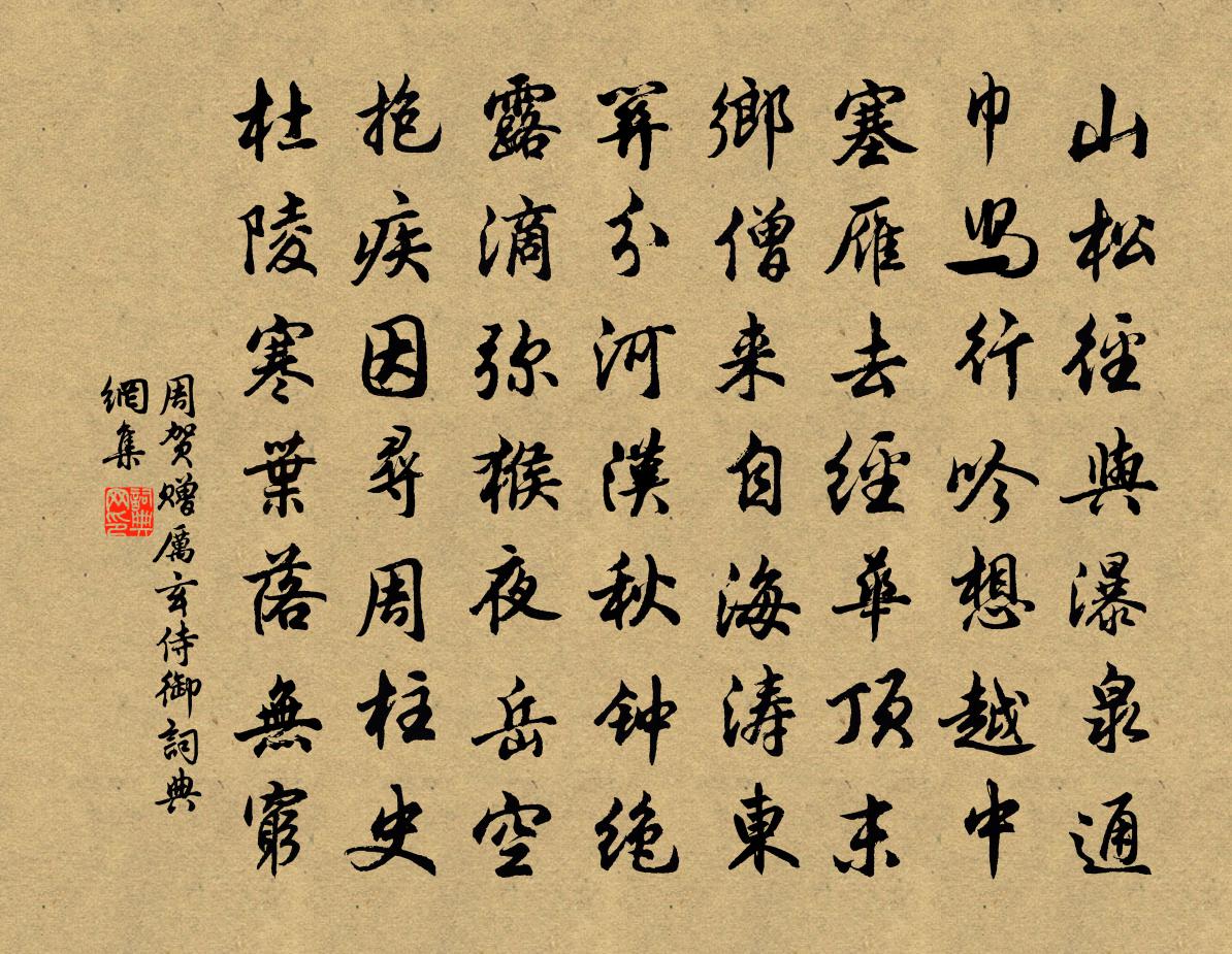 詩詞名句歷史字典書法欣賞書法字典國語詞典說文解字康熙字典古漢語字典標 題 作 者 詩 句 贈厲玄侍御作者:周賀 朝代:唐代贈厲玄侍御原文山松徑與瀑泉通,巾舄行吟想越中。塞雁去經華頂末,鄉僧來自海濤東。關分河漢秋鍾絕,露滴彌猴夜岳空。抱疾因尋周柱史,杜陵寒葉落無窮。詩詞問答問:贈厲玄侍御的作者是誰?答:周賀問:贈厲玄侍御寫於哪個朝代?答:唐代問:贈厲玄侍御是什麼體裁?答:七律周賀贈厲玄侍御書法欣賞贈厲玄侍御書法作品注釋全唐詩:卷503-67詩詞推薦僧可真東歸因謁范蘇州梅堯臣〔宋代〕姑蘇台畔去,雲壑付清機。野策過寒水,山童護衲衣。松門正投宿,竹笠帶餘暉。誰愛杼山句,使君應姓韋。和寄王五四將仕趙希逢〔宋代〕帝業未成三尺劍,老人先授一編書。遭時若與留侯異,蓑笠江湖亦可漁。息夫人宋之問〔唐代〕可憐楚破息,腸斷息夫人。仍為泉下骨,不作楚王嬪。楚王寵莫盛,息君情更親。情親怨生別,一朝俱殺身。初到延平會四邑宰陳宓〔宋代〕郡縣本來同一體,何須催賦屬州家。如今已許從民便,升斗須防顆粒加。張文潛作淮陰侯詩有平生蕭相真知己何事還同張嵲〔宋代〕當日追亡如不及,豈於今日故相圖。身如累卵君知否,方買民田俗自汙。送花趙提刑張伯玉〔宋代〕蓬萊閣上牡丹開,盡日憑欄望外台。不敢登門謁樽酒,且教山仆送花來。詩二首釋惟謹〔宋代〕看了青燈夢不成,東風混雪落寒聲。半生客里無窮恨,告訴梅花說到明。三月三十日題慈恩寺白居易〔唐代〕慈恩春色今朝盡,盡日徘徊倚寺門。惆悵春歸留不得,紫藤花下漸黃昏。上太師公相生辰詩十首佚名〔宋代〕跋扈驕矜糾紛,兵威不定將焚。槿歸宥密消兵灰,力壗枸槍息祲氛。鴻劉將軍休盡策,捧觴記罷論動。四方廊無餘醉里送裴子赴鎮西岑參〔唐代〕醉後未能別,待醒方送君。看君走馬去,直上天山雲。畫工又作道裝王邁〔宋代〕揚州節鉞非吾愛,肯要腰纏十萬錢。只願天公多與壽,道巾野服伴胎仙。傳義上人釋祖欽〔宋代〕直指之道,義不可傳。不立文字,昭昭現前。萬里不掛片雲,一亘白日青天。聲前有意,句後無言。理事雙遣也,石門戍李群玉〔唐代〕到此空思吳隱之,潮痕草蔓上幽碑。人來皆望珠璣去,誰詠貪泉四句詩。近買山范灣自營藏地與亡弟草塘君及外家墓塋薛嵎〔宋代〕因緣還是范灣邊,乾巽峰高四應全。千古青山逢具眼,數莖秋鬢近衰年。倒騎黃犢循來路,貪看行龍下遠田。慚愧嘉樹韓維〔宋代〕殘芳不入眼,愛此嘉樹秀。青雲重欲垂,翠幄遠相鬥。輕涼迎早夏,繁影亂清晝。茲日更徘徊,聊攜一樽酒。方竹張詠〔宋代〕筍從初籜已方堅,峻節凌霜更可憐。為報世間邪佞者,如何不似竹枝賢。偈頌三十首釋慧暉〔宋代〕佛日高懸,祖月彌朗。僧雲漫漫,法雨浩浩。禪林花發,教風春迎。別離情所鍾十二章章四句送定叟弟之官嚴陵張栻〔宋代〕歲律亦已暮,風烈雪漫漫。去路阻且長,念子衣裘單。夢仙謠劉子翬〔宋代〕鵝子峰前波色清,劉郎看山無俗情。癯儒自昔有仙骨,夜夢體飛如葉輕。雲中不識朝天路,雙童導我凌空去。側身滿庭芳(九日)吳則禮〔宋代〕玉壘尊罍,清秋關塞,正宜催喚香醪。涼風吹帽,橫槊試登高。相見征西舊事,龍山會、賓主俱豪。來群雁,涼生名句推薦飛來山上千尋塔,聞說雞鳴見日升。王安石《登飛來峰》 吠犬雜鳴雞,燈火熒熒歸路迷。納蘭性德《南鄉子·秋暮村居》 怒不過奪,喜不過予。荀子《荀子·修身》 清露晨流,新桐初引,多少遊春意。李清照《念奴嬌·春情》 留七分正經,以度生;留三分痴呆,以防死。陳繼儒《小窗幽記·集醒篇》 誰憐旅愁荏苒。謾長門夜悄,錦箏彈怨。張炎《解連環·孤雁》 群芳過後西湖好,狼籍殘紅。歐陽修《採桑子·群芳過後西湖好》 自是相思抽不盡,卻教風雨怨秋聲。鄭燮《詠芭蕉》 彩扇紅牙今都在,恨無人、解聽開元曲。蔣捷《賀新郎·夢冷黃金屋》 方舟安可極,離思故難任!曹植《雜詩六首·其一》