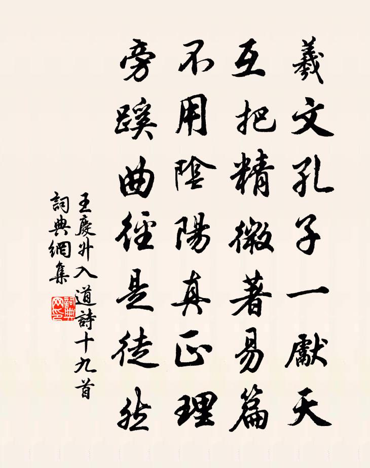 詩詞名句歷史字典書法欣賞書法字典國語詞典說文解字康熙字典古漢語字典標 題 作 者 詩 句 入道詩十九首作者:王慶升 朝代:宋代入道詩十九首原文羲文孔子一先天,互把精微著易篇。不用陰陽真正理,旁蹊曲徑是徒然。詩詞問答問:入道詩十九首的作者是誰?答:王慶升問:入道詩十九首寫於哪個朝代?答:宋代王慶升入道詩十九首書法欣賞入道詩十九首書法作品詩詞推薦洪福寺藤架孔武仲〔宋代〕生長應毫末,敷腴忽十尋。繁花春不歇,密葉書長陰。風過龍蛇動,雲開洞府深。時來學晏坐,朝市不關心。憶鹿鶴吳芾〔宋代〕山中鹿鶴久相疏,恨不歸來與汝俱。飛舞尚如前日否,奔騰還上後山無。不聞警露來庭下,猶想銜花近座隅。嘆我瑞光亭有作丘葵〔宋代〕終年蕭寺裹,人跡往來稀。雀踏梁塵落,蜂穿森屑飛。佛幡書古偈,僧壁掛禪衣。此景惟予愛,冷然契道機。早春懷薛公裕儲嗣宗〔唐代〕幽獨自成愚,柴門日漸蕪。陸機初入洛,孫楚又游吳。失意怨楊柳,異鄉聞鷓鴣。相思復相望,春草滿南湖。光華寺秦觀〔宋代〕霞通海天曙,月來東山白。共是憑欄人,誰足當秋色。次韻郭明叔登縣樓見思長句黃庭堅〔宋代〕令尹登臨多暇日,杖生芝菌筆生埃。溪橫鳳尾寒光去,山擁旌陽翠氣來。晚市張燈明遠近,□□留客舞徘徊。紅裳有所思陳允平〔宋代〕憶昔美人初別時,長亭兩岸柳依依。今日美人天之涯,美人美人胡不歸。憶昔君別妾,分破青鸞鏡,破鏡如破心。故相少師李公輓詩李彌遜〔宋代〕國步乘陽九,胡塵暗上京。支傾隆大廈,卻敵隱長城。草木知春澤,狐狸絕夜鳴。雲台瞻袞繡,千古繼哀榮。至節前十日游勝因寺洪咨夔〔宋代〕霜霽午羲暖,潦收沙路晞。束山知寺古,避客怪僧稀。籜滑涉危屐,藤鉤穿密衣。月黃風不動,燈火虹橋歸。來燕堂聯句韓絳〔宋代〕賢侯謝郡歸,從遊樂吾黨。林泉富餘地,卜築疏陳莽。是時春正中,來燕音下上。若賀大夏成,喜留眾賓賞。得名淳祐祭海神十六首佚名〔宋代〕告靈鄉矣,錫我嘉祚。乾端坤倪,開豁呈露。玄雲聿收,群龍龍驚。減除凶烴,六幕清豫。送朱可久歸越中賈島〔唐代〕石頭城下泊,北固暝鍾初。汀鷺潮衝起,船窗月過虛。吳山侵越眾,隋柳入唐疏。日欲躬調膳,辟來何府書。題墨梅王柏〔宋代〕胸中含靜操,筆下走寒梢。一見孤山客,清香盡拆苞。使東川慚問囚元稹〔唐代〕司馬子微壇上頭,與君深結白雲儔。尚平村落擬連買,王屋山泉為別游。各待陸渾求一尉,共資三徑便同休。那知柬石軒胡仲弓〔宋代〕便著工夫去看山,蘭亭未遇莫空還。向來一段風流事,只在茂林修竹間。春晚謠張佖〔宋代〕雨微微,煙霏霏,小庭半坼紅薔薇。鈿箏斜倚畫屏曲,零落幾行金雁飛。蕭關夢斷無尋處,萬疊春波起南浦。凌亂一輪明月滿乾坤吳承恩〔明代〕十里長亭無客走,九重天上現星辰。八河船隻皆收港,七千州縣盡關門。六宮五府回官宰,四海三江罷釣綸。兩座雲夢澤杜牧〔唐代〕日旗龍旆想飄揚,一索功高縛楚王。直是超然五湖客,未如終始郭汾陽。中秋前一日邀賀子忱為對月之款乃審放意山林曹勛〔宋代〕積陰掃秋風,吹作今夕月。山嶽四高寒,天地一澄澈。幽人渺何許,慶喜清暉發。一樽不同樂,孤光共愁絕。已亥雜詩 285龔自珍〔清代〕嘉慶文風在目前,記同京兆鹿鳴筵。白頭相見冬山路,誰惜荷衣兩少年。名句推薦惱他香閣濃睡,撩亂有啼鶯。晏殊《訴衷情·東風楊柳欲青青》 君王選玉色,侍寢金屏中。李白《怨歌行》 不知何歲月,得與爾同歸?韋承慶《南中詠雁詩》 石壕村里夫妻別,淚比長生殿上多。袁枚《馬嵬》 一聲已動物皆靜,四座無言星欲稀。李頎《琴歌》 人見利而不見害,魚見食而不見鉤。李汝珍《鏡花緣·第九十二回》 相逢喚醒京華夢,吳塵暗斑吟發。詹玉《齊天樂·送童瓮天兵後歸杭》 瓜熟蒂落,水到渠成。佚名《增廣賢文·下集》 凡音者,產乎人心者也。呂不韋《呂氏春秋·紀·季夏紀》 客愁全為減,舍此復何之?杜甫《後游》