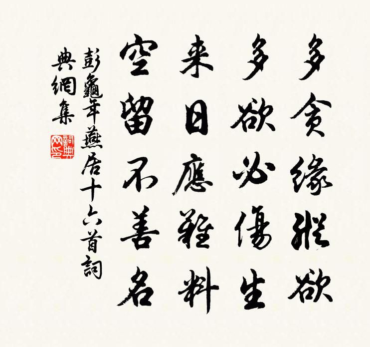 詩詞名句歷史字典書法欣賞書法字典國語詞典說文解字康熙字典古漢語字典標 題 作 者 詩 句 燕居十六首作者:彭龜年 朝代:宋代燕居十六首原文多貪緣縱慾,多欲必傷生。來日應難料,空留不善名。詩詞問答問:燕居十六首的作者是誰?答:彭龜年問:燕居十六首寫於哪個朝代?答:宋代彭龜年燕居十六首書法欣賞燕居十六首書法作品詩詞推薦示兒韓愈〔唐代〕始我來京師,止攜一束書。辛勤三十年,以有此屋廬。此屋豈為華,於我自有餘。中堂高且新,四時登牢蔬。前榮和武興解舟趙希逢〔宋代〕寂寞黃昏古渡頭,悽然秋思滿汀洲。臥薪要復中原地,載荻先燒強虜舟。席勝長驅如朽拉,老師何苦更迍留。義旗水雲遊 繼重陽韻馬鈺〔元代〕不住不住。火院當離,深宜別戶。害風仙、化我扃門,這修行須做。腥膻戒盡常餐素。掛體唯麻布。待百朝、鎖*詩劉楨〔魏晉〕昔君錯畦畤。東土有素木。條柯不盈尋。一尺再三曲。隱生置翳林。控倊自迫速。得托芳蘭苑。列植高山足。 述字倒回文三首宋太宗〔宋代〕依憂前舊比,求推生背費。希留然祐以,休知亨最述。深村艾性夫〔宋代〕索居無遠興,晚憩傍深村。(左石右問)澀水爭道,桑空草托根。斷橋回老馬,熟果聚飢猿。解後僧同話,歸來人徵招調中腔/徵招王安中〔宋代〕紅雲茜霧籠金闕。聖運葉、星虹佳節。紫禁曉風馥天香,奏九韶、帝心悅。瑤階萬歲蟠桃結。睿算永、壺天風月。送春歸(元和十一年三月三十日作)白居易〔唐代〕送春歸,三月盡日日暮時。去年杏園花飛御溝綠,何處送春曲江曲。今年杜鵑花落子規啼,送春何處西江西。帝城新添聲楊柳枝詞裴諴〔唐代〕思量大是惡姻緣,只得相看不得憐。願作琵琶槽那畔,得他長抱在胸前。獨房蓮子沒有看,偷折蓮時命也拌。若有西江月佚名〔宋代〕隆暑正當三伏,明朝又是雙旬。崧高孕秀降生申。再捧瑤觴稱慶。督府贊猷英俊,難淹大展經綸。倚需召入秉洪鈞華陽山堂落成諸葛舜臣〔宋代〕小築菟裘石磴間,登臨極望意蒼然。三更栗葉中峰雨,四月桃花一洞天。時聽茅君歸碧落,恍聞玉女煉丹鉛。江湖送錢國博知坊州魏野〔宋代〕遙為坊民賀一方,壽星偏去照光芒。解攜朋友龍三處,隨侍兒孫雁兩行。芳草路中車突兀,落花風裡旆悠颺。眠雲漁父詩四首趙蕃〔宋代〕早悟君王物色求,子陵應已棄羊裘。絕知至德終難掩,女子亦稱韓伯休。下手遲 景金本注云,二首本名恨歡遲 自詠丘處機〔元代〕落魄閒人本姓丘。住山東、東路登州。自少年、割斷攀緣網,從師父西遊。兀兀騰騰不系留。似長江、一葉孤舟。君疇仰晦茂功蒙仲和余差須韻二詩再答二首劉克莊〔宋代〕懊悔平生擇術差,誓將秋實代春華。幸無大節污青史,曾有狂言壞白麻。已約宗雷同入社,且饒燕許自成家。傍人送張端明赴召周必大〔宋代〕曾以詩書化蜀人,更恢文教大江垠。諸生亦有如何武,爭詠三章轉上聞。義上人歸自武林戲作四偈劉應時〔宋代〕身世總為閒伎倆,生前須了惡因緣。把茅約子歸雲壑,品字柴頭坐說禪。唐律寄呈父鳳山提舉十首汪元量〔宋代〕錦帆浩蕩濕龍鸞,樂指三千粉淚寒。萬里遠行看日近,一人不殺見天寬。玉關屢沐軍羅拜,金殿時蒙上問安。宴罷沁園春·詠菜花陳維崧〔清代〕極目離離,遍地濛濛,官橋野塘。正杏腮低亞,添他旖旎;柳絲淺拂,益爾輕颺。繡襪才挑,羅裙可擇,小摘情親龜負圖(東都試)丁澤〔唐代〕天意將垂象,神龜出負圖。五方行有配,八卦義寧孤。作瑞旌君德,披文協帝謨。乘流喜得路,逢聖倖存軀。蓮葉名句推薦當時相候赤欄橋,今日獨尋黃葉路。周邦彥《玉樓春·桃溪不作從容住》 有個嬌嬈如玉,夜夜繡屏孤宿,閒抱琵琶尋舊曲,遠山眉黛綠。韋莊《謁金門·春漏促》 碧玉妝成一樹高,萬條垂下綠絲絛。賀知章《詠柳 / 柳枝詞》 梅似雪,柳如絲。試聽別語慰相思。辛棄疾《鷓鴣天·送歐陽國瑞入吳中》 夜雨剪春韭,新炊間黃粱。杜甫《贈衛八處士》 知不知,上矣。過者之患,不知而自以為知。呂不韋《呂氏春秋·論·似順論》 罔談彼短,靡恃己長。周興嗣《千字文·全文》 停船暫借問,或恐是同鄉。崔顥《長干行·君家何處住》 青出於藍而勝於藍程登吉《幼學瓊林·卷二·師生》 何處它年寄此生,山中江上總關情。虞集《院中獨坐》