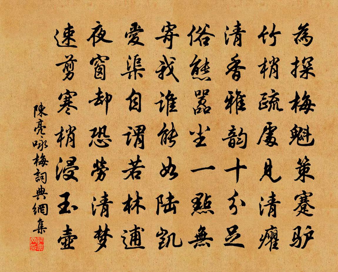 詩詞名句歷史字典書法欣賞書法字典國語詞典說文解字康熙字典古漢語字典標 題 作 者 詩 句 詠梅作者:陳亮 朝代:宋代詠梅原文為探梅魁策蹇驢,竹梢疏處見清癯。清香雅韻十分足,俗態囂塵一點無。寄我誰能如陸凱,愛渠自謂若林逋。夜窗卻恐勞清夢,速剪寒梢浸玉壺。詩詞問答問:詠梅的作者是誰?答:陳亮問:詠梅寫於哪個朝代?答:宋代問:陳亮的名句有哪些?答:陳亮名句大全陳亮詠梅書法欣賞詠梅書法作品詩詞推薦曉別故人釋文珦〔宋代〕別日不易數,相逢多故情。為吾留一宿,同子話三生。月印秋燈白,霜添夜氣清。晨鐘緣底事,還又動離聲。句釋惠崇〔宋代〕坐 * 袖,添泉月入瓶。病起窺園十絕劉克莊〔宋代〕經月龍鍾少下床,土花上壁筍穿牆。不知老去無筋力,猶自支吾探海棠。暮歸張耒〔宋代〕牛羊久已下,寂寂掩城扉。水鶴鳴城堞,飛螢上戟衣。夜涼江海近,天闊鬥牛微。何日招舟子,寒江北渡歸。病中散步六絕岳珂〔宋代〕朝隨粥鼎蟬腹潤,夜掩書帷鰥目眠。無奈暑威侵病骨,起來搔首斗垂天。芙蓉花歌釋文珦〔宋代〕東鄰檻外芙蓉花,初開粲粲如朝霞。今朝花謝枝空在,繞樹千回只嘆嗟。花謝明年還復開,紅顏已去終難回。人生戊辰三月清明後三日見葉丈於石林承命賦詩作韓元吉〔宋代〕東風易陰晴,一雨曉便止。舍舟欣徐行,烏鵲聲為喜。岧嶢石林谷,蒼翠間紅紫。丈人厭調元,玩意丘壑里。鄭公滿庭芳韓淲〔宋代〕玉水靈山,霜天清曉,非煙非霧琴堂。載臨初度,圭壁記煌煌。百里民安撫字,歡呼處、禾黍登場。今年好,為茲店紿嘆方回〔宋代〕均為橫目民,賢否天壤異。苟懷長者心,必徇君子義。道途分兩岐,書木立標識。行人免顛迷,豈不亦一惠。大澤從事中郎張彥明為中護軍奚世都為汲郡太守客陸雲〔魏晉〕思文有聖。叡哲配天。功濟生黎。道合上玄。休命發揮。有集惟賢。哲彼寤宿。澄此在淵。游金華山禪院貫休〔唐代〕茲地曾棲菩薩僧,旃檀樓殿瀑崩騰。因知境勝終難到,問著人來悉不曾。斜谷暗藏千載雪,薄嵐常翳一龕燈。多慚海棠花王安石〔宋代〕綠嬌隱約眉輕掃,紅嫩妖饒臉薄妝。巧筆寫傳功未盡,清才吟詠興何長。相和歌辭。採桑郎大家宋〔唐代〕春來南雁歸,日去西蠶遠。妾思紛何極,客游殊未返。賀王伯愚登第葉寘〔宋代〕先君有女嘗擇對,玉雪王郎真可人。連榜舍升俱伯氏,中興家世最名臣。迴翔璧水十年舊,踴躍龍門三月新。從此菩薩蠻(和李狀元·十之九)鄧肅〔宋代〕騎鯨好向雲端去。踏花偶為狂朋住。笑語凜生風。眼高四海空。羊裘沖雨露。我是漁樵侶。已趁白鷗歸。長江自在宴胡侍御書堂(李尚書之芳、鄭秘監審同集歸字韻)杜甫〔唐代〕江湖春欲暮,牆宇日猶微。暗暗春籍滿,輕輕花絮飛。翰林名有素,墨客興無違。今夜文星動,吾儕醉不歸。前詩似盡意別成二小詩王洋〔宋代〕已分都將命乞花,恩多成怨莫傷嗟。玉容紅淚猶堪憶,織手拳頭盡好夸。和陳德章春日送客虞儔〔宋代〕歲月斜川路,風流杜曲天。過牆紅杏雨,低戶綠楊煙。鴻秸今千里,鶯花又一年。陽春慚屬和,五字得珠連。先天吟示邢和叔邵雍〔宋代〕一片先天號太虛,當其無事見真腴。胸中美箋肯自衒,天下英才敢厚誣。理順是言皆可放,義安何地不能居。直從自處吟邵雍〔宋代〕堯夫自處道如何,滿洛陽城都似家。不德於人焉敢異,至誠從物更無他。眼前只見羅天爵,頭上誰知換歲華。何止名句推薦冰合井泉月入閨,金缸青凝照悲啼。李白《夜坐吟》 金柳搖風樹樹,系彩舫龍舟遙岸。柳永《破陣樂·露花倒影》 冷艷全欺雪,余香乍入衣。丘為《左掖梨花》 千門開鎖萬燈明,正月中旬動帝京。張祜《正月十五夜燈》 天下無指者,生於物之各有名,不為指也。公孫龍《公孫龍子·指物論》 願為西南風,長逝入君懷。曹植《七哀詩》 豈曰無衣?與子同袍。佚名《秦風·無衣》 爾曹身與名俱滅,不廢江河萬古流。杜甫《戲為六絕句·其二》 老景蕭條,送君歸去添淒斷。毛滂《燭影搖紅·送會宗》 信宿漁人還泛泛,清秋燕子故飛飛。杜甫《秋興八首》