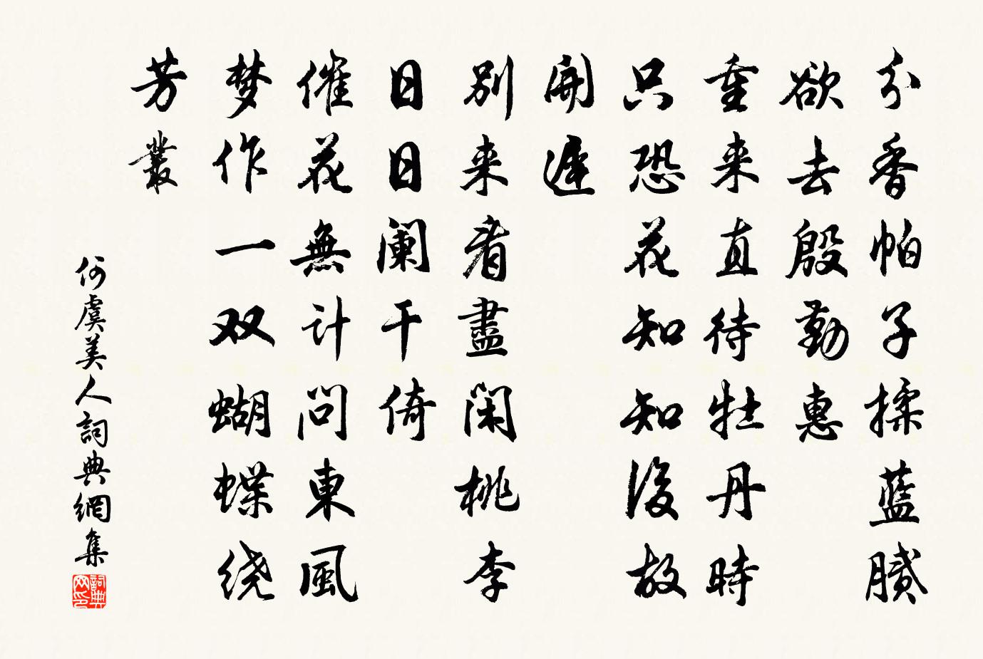 詩詞名句歷史字典書法欣賞書法字典國語詞典說文解字康熙字典古漢語字典標 題 作 者 詩 句 虞美人作者:何 朝代:宋代虞美人原文分香帕子揉藍膩。欲去殷勤惠。重來直待牡丹時。只恐花知、知後故開遲。別來看盡閒桃李。日日闌乾倚。催花無計問東風。夢作一雙蝴蝶、繞芳叢。詩詞問答問:虞美人的作者是誰?答:何問:虞美人寫於哪個朝代?答:宋代問:虞美人是什麼體裁?答:詞何虞美人書法欣賞虞美人書法作品詩詞推薦憶舊遊(聞雁)劉應幾〔宋代〕記銅駝載酒,翠陌 * ,曾聽相呼。不盡離離意,覺柔腸如剪,立馬踟躕。人生似此蒼鬢,禁得幾聲疏。想怨入秋夏日即事劉得仁〔唐代〕到曉改詩句,四鄰嫌苦吟。中宵橫北斗,夏木隱棲禽。天地先秋肅,軒窗映月深。幽庭多此景,惟恐曙光侵。苑中題友人林亭李頻〔唐代〕井邑藏岩穴,幽棲趣若何。春篁抽筍密,夏鳥雜雛多。坐有清風至,林無暑氣過。亂書還就葉,真飲不聽歌。片影次黃日岩韻王舫〔宋代〕孤舟閒野渡,竹外小橋通。不涉終南逕,獨高彭澤風。雲閒鍾梵里,月靜笑談中。千載留清節,誰雲吾道窮。雨過知津酒正潘元壽皆留飲漫興絕句趙蕃〔宋代〕楊柳依依洲渚深,駕言聊爾縱幽尋。不虞為子登臨費,但約新詩好處吟。鷓鴣天史達祖〔宋代〕睡袖無端幾摺香。有人丹臉可占霜。半窗月印梅猶瘦,一律瓶笙夜正長。情艷艷,酒狂狂。小屏誰與畫鴛鴦。解衣謝慧明王道自大面山寧贈三詩並密黃精程公許〔宋代〕尺書覼縷寫衷誠,大面山前兩日程。黃獨潤含岩谷味,清詩吟作澗泉聲。灰心久已安枯寂,月指何勞借發明。更與張安國寫坡詩帖贊岳珂〔宋代〕玉妃粲粲怯詩瘦,秦艷蘇腴略先後。於湖筆力並奇秀,手執遺篇欲三嗅。賀新郎(童養合卺)彭子翔〔宋代〕一點陽春小。傍妝檯、梅梢粉嫩,桃花紅透。合卺樽前人笑語,銀燭兩行紅補。雲正暖、流蘇香獸。金屋阿嬌元共次壁間韻題懷巡道上三州三氏亭六言二首魏了翁〔宋代〕滿壁故人何在,倚闌心事誰同。蚤徑遊絲罥日,亂山瘦馬行空。移疾會詩客元生與釋子法朗,因貽諸祠曹韋應物〔唐代〕對此嘉樹林,獨有戚戚顏。抱瘵知曠職,淹旬非樂閒。釋子來問訊,詩人亦扣關。道同意暫遣,客散疾徐還。園徑和孫長史秋日臥病駱賓王〔唐代〕霍第疏天府,潘園近帝台。調弦三婦至,置驛五侯來。尚想歡娛洽,吁嗟歲月催。金壇分上將,玉帳引環材。決勝久雨鄭剛中〔宋代〕門前 * 路無跡,窗下書昏雲滿樓。況是幽人本多睡,飲空小社一尊休。桃陶夢桂〔宋代〕誰從王母覓來栽,等得花長結子來。我種數株能向久,有花如錦子如杯。浣溪沙許有壬〔元代〕修黛橫愁苦愛顰。*霞亂玉更宜嗔。嗅香*蕊柰何春。織就回文難會意,寫成離字亦傷神。他年不及卷中人。白人徐凝〔唐代〕暖風入煙花漠漠,白人梳洗尋常薄。泥郎為插瓏璁釵,爭教一朵牙雲落。湖心寺偶書舒坦〔宋代〕吹落清香縹緲風,樓台彷佛水邊紅。人間誰是丹青手,畫取春湖細雨中。代書寄趙處州公甫蘇泂〔宋代〕苕霅無來使,如今又幾時。案餘分惠筆,室有寄來詩。豁達偏憐我,風流更許誰。懷哉括蒼小,安用借留為。偈頌一百零一首釋慧性〔宋代〕搖唇鼓舌,展事投機。千拂出世,不通懺悔。焦巴,有葉丫。長天秋水,孤鶩落霞。頌古十五首釋慧遠〔宋代〕良哉觀世音,旋聞與聲脫。犬吠驢鳴休未休,世出世間活鱍鱍。名句推薦風緊雁行高,無邊落木蕭蕭。納蘭性德《河瀆神·風緊雁行高》 不看僧面看佛面。吳承恩《西遊記·第三十一回》 長安故人問我,道尋常、泥酒只依然。辛棄疾《木蘭花慢·滁州送范倅》 不得乎親,不可以為人;不順乎親,不可以為子。孟子《孟子·離婁章句上·第二十八節》 砌下落梅如雪亂,拂了一身還滿。李煜《清平樂·別來春半》 將贍才力,務在博見劉勰《文心雕龍·事類》 日射紗窗風撼扉,香羅拭手春事違。李商隱《日射》 翠娥執手送臨歧,軋軋開朱戶柳永《採蓮令·月華收》 魯女東窗下,海榴世所稀。李白《詠鄰女東窗海石榴》 昨夢西湖,老扁舟身世。吳文英《拜星月慢·林鐘羽姜石帚以盆蓮數十置中庭宴客其中》