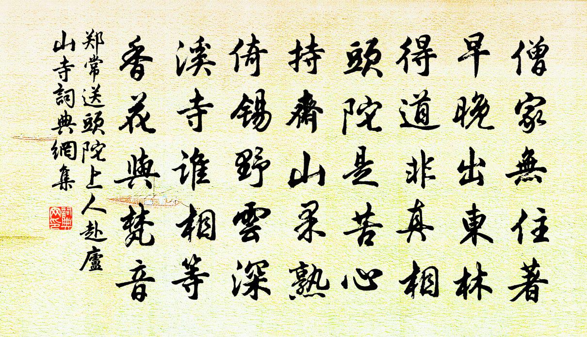詩詞名句歷史字典書法欣賞書法字典國語詞典說文解字康熙字典古漢語字典標 題 作 者 詩 句 送頭陀上人赴廬山寺作者:鄭常 朝代:唐代送頭陀上人赴廬山寺原文僧家無住著,早晚出東林。得道非真相,頭陀是苦心。持齋山果熟,倚錫野雲深。溪寺誰相等,香花與梵音。詩詞問答問:送頭陀上人赴廬山寺的作者是誰?答:鄭常問:送頭陀上人赴廬山寺寫於哪個朝代?答:唐代問:送頭陀上人赴廬山寺是什麼體裁?答:五律鄭常送頭陀上人赴廬山寺書法欣賞送頭陀上人赴廬山寺書法作品詩詞推薦句錢惟演〔宋代〕雪意未成雲著地,秋聲不斷雁連天。送蔣肖韓薛師石〔宋代〕岳陽有仙跡,君去頗相宜。已料官閒日,多吟湘水詩。高風琴斷裂,白月酒漣漪。無意求人薦,惟應我自知。陳秀才問詩於余次韻贈之戴表元〔宋代〕秋半說詩秋又闌,覓從忘處更喔看。不妨味熟心自悟,祗恐業成身轉寒。竊木野風天倡和,崩溪怪石鬼鐫刊。扳君閨思梅堯臣〔宋代〕望日赤如橘,游梁音信稀。愁心常似醉,春絮等閒飛。江鮆看將爛,芹牙吐尚微。何時憑燕子,寄取錦書歸。休日早起陳與義〔宋代〕曨曨窗影來,稍稍禽聲集。開門知有雨,老樹半身濕。劇談了無味,遠遊非所急。 * 著身寬,安取萬戶邑。開鏡送張君實赴制舉李新〔宋代〕不用名矜自半千,高才十二許爭光。乘軺遠道三千里,下筆談王數百篇。忠膽自能傾白日,決科時似選青錢。山城奉酬魯望醉中戲贈皮日休〔唐代〕秦吳風俗昔難同,唯有才情事事通。剛戀水雲歸不得,前身應是太湖公。頌古十九首釋慧暉〔宋代〕百尺竿頭氎布巾,上頭題作酒家春。相逢不飲空歸去,洞裡桃花笑 * 。壽趙茂嘉郎中二首辛棄疾〔宋代〕玉色長身白首郎,當年麾節幾甘棠。力貧活物陰功大,未老垂車逸興長。久矣如今太公望,巋然真是魯靈光。朝廷賣花聲·閨思康與之〔宋代〕愁捻斷釵金。遠信沈沈。秦箏調怨不成音。郎馬不知何處也,樓外春深。 好夢已難尋。夜夜余衾。目窮千里正傷衢州道中鄭會〔宋代〕生危薔薇插鬢斜,閒隨女伴摘新茶。回頭見客低頭笑,卻拾殘花帖面花。圓機寵以長句賀禱雪龍池輒次韻述謝晁說之〔宋代〕神州鐘鼓浹年豐,燈焰紅綿照景龍。況有玉楚榮廣內,不勞金甲老邊封。同雲出洞如人意,孤宦臨岐歛病容。何事劉君元暉八月十四日邀余玩月快雪齋中,命余倪瓚〔元代〕捲簾見月形神清,疑是山陰夜雪明。長歌欲覓剡溪戴,悵然停杯遠恨生。爾營茅齋名快雪,邀我吹笙弄明月。明星江東李商隱〔唐代〕驚魚撥剌燕翩翾,獨自江東上釣船。今日春光太漂蕩,謝家輕絮沈郎錢。蒜山被始興王命作詩鮑照〔南北朝〕暮冬霜朔嚴。地閉泉不流。玄武藏木陰。丹烏還養羞。勞農澤既周。役車時亦休。高薄符好蒨。藻駕及時游。鹿苑李少府廳吊李元賓遺字孟郊〔唐代〕零落三四字,忽成千萬年。那知冥寞客,不有補亡篇。斜月吊空壁,旅人難獨眠。一生能幾時,百慮來相煎。戚戚春日叢桂書舍偶成二首王炎〔宋代〕檐頭燕子話新晴,客里春來何似生。短榻曲肱眠未穩,好花刺眼笑相迎。生憎重碧杯中物,懶趁踏青江上行。燕坐下第獻所知三首李山甫〔唐代〕偶向江頭別釣磯,等閒經歲與心違。虛教六尺受辛苦,枉把一身憂是非。青桂本來無欠負,碧霄何處有因依。春風瓜洲阻風宋伯仁〔宋代〕狂風未許放歸船,借得僧房半榻眠。落雁影收帆腳外,怒濤聲到枕頭邊。黃蘆葉底秋將老,白羽書中病未痊。傳語太孺人生朝度正〔宋代〕萬事隨緣處處安,分明淡泊有餘歡。痴兒解賦蟠桃頌,拙婦能炊脫粟餐。天上神仙誰羨慕,人間真樂我團欒。願如名句推薦白馬繞旌旗,悲鳴相追攀。李白《豫章行》 盛事惟忠,庸則自從。來俊臣《羅織經·控權卷第四》 西風吹老洞庭波,一夜湘君白髮多。唐珙《題龍陽縣青草湖》 午醉未醒紅日晚,黃昏簾幕無人卷。蘇軾《蝶戀花·蝶懶鶯慵春過半》 貴上極則反賤,賤下極則反貴。司馬遷《史記·貨殖列傳》 人生如寄,何事辛苦怨斜暉。朱熹《水調歌頭·隱括杜牧之齊山詩》 九華山路雲遮寺,清弋江村柳拂橋。杜牧《宣州送裴坦判官往舒州時牧欲赴官歸京》 有耳莫洗潁川水,有口莫食首陽蕨李白《行路難三首》 誰念文園病客?夜色沉沉,獨抱一天岑寂。張埜《奪錦標·七夕》 黑髮不知勤學早,轉眼便是白頭翁。佚名《增廣賢文·上集》