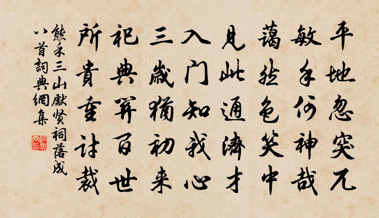 詩詞名句歷史字典書法欣賞書法字典國語詞典說文解字康熙字典古漢語字典標 題 作 者 詩 句 三山先賢祠落成八首作者:熊禾 朝代:宋代三山先賢祠落成八首原文平地忽突兀,敏手何神哉。藹然色笑中,見此通濟才。入門知我心,三歲猶初來。祀典關百世,所貴重討裁。詩詞問答問:三山先賢祠落成八首的作者是誰?答:熊禾問:三山先賢祠落成八首寫於哪個朝代?答:宋代熊禾三山先賢祠落成八首書法欣賞三山先賢祠落成八首書法作品詩詞推薦江上王令〔宋代〕羃羃江城沒遠煙,暮雲歸族忽相連。春江流水出天外,晚渡歸舟下日邊。杏萼春深翻淺纈,柳花風遠曳晴綿。無錢頌古十八首釋寶印〔宋代〕李公要勸張公酒,卻被張公罰一杯。珠繞團團休錯會,還家拍手笑哈哈。奉和夏日應令詩庾信〔南北朝〕朱簾卷麗日。翠幕蔽重陽。五月炎蒸氣。三時刻漏長。麥隨風裡熟。梅逐雨中黃。開冰帶井水。和粉雜生香。衫含春日衛宗武〔宋代〕化工溥至仁,生機運不停。榮觀遍原野,宇宙一丹青。奉和魯望樵人十詠樵擔皮日休〔唐代〕不敢量樵重,唯知益薪束。軋軋下山時,彎彎向身曲。清泉洗得潔,翠靄侵來綠。看取荷戈人,誰能似吾屬?和大著何後部程公許〔宋代〕憶昔歲雲暮,言趨君子堂。昕班偶同歸,三度金節涼。木天並英游,東壁分餘光。日者對宸扆,直聲動岩廊。豈不送純禪者釋重顯〔宋代〕莎蘿雨滴蒼苔痕,前峰後峰啼斷猿。攜筇別我下層翠,何處靜敲仁者門。送裴虞部知信州梅堯臣〔宋代〕攢青歷歷正面山,刺史日坐雲屏間。楚人竟掘水精璞,漢女買作月佩環。時惟產寶不重谷,願當化俗無棄菅。往辭上邪佚名〔兩漢〕上邪,我欲與君相知,長命無絕衰。山無陵,江水為竭。冬雷震震,夏雨雪。天地合,乃敢與君絕。山居雜詩九十首曹勛〔宋代〕鑿池固不廣,納納隘所居。苟無水光寒,便覺非吾廬。漪漣漾芳渚,澄影浮晴虛。樂哉濠梁心,已復游嘉魚。暑雨葛紹體〔宋代〕連日霏霏濕夕陽,灑衣沾席碎聲長。暑天不是苦多雨,愛與人間生晚涼。巫山蘇軾〔宋代〕瞿塘迤邐盡,巫峽崢嶸起。連峰稍可怪,石色變蒼翠。天工運神巧,漸欲作奇偉。坱軋勢方深,結構意未遂。旁觀石室庵夜坐朱真靜〔宋代〕青燈寒焰弄微明,燈與幽人一樣清。案上黃庭渾嫩看,時聞敗葉打窗聲。登秀山至半而還有懷賓暘方回〔宋代〕擁書終日汗如漿,試上崔嵬覓晚涼。忽喜孤煙支拄杖,偶逢平石寘繩床。十年世事頭須白,六月江城草樹蒼。莫盡樂府雜曲。鼓吹曲辭。有所思孟郊〔唐代〕桔槔烽火晝不滅,客路迢迢信難越。古鎮刀攢萬片霜,寒江浪起千堆雪。此時西去定如何,空使南心遠淒切。過函谷關宋之問〔唐代〕二百四十載,海內何紛紛。六國兵同合,七雄勢未分。從成拒秦帝,策決問蘇君。雞鳴將狗盜,論德不論勛。過豫章蘇轍〔宋代〕白屋可能無孺子,黃圭不是欠陳蕃。古人冷淡今人笑,湖水年年刺舊痕。巫山一段雲 白岳晴雲李齊賢〔元代〕曉過青郊驛,春遊白岳山。提壺勸酒語關關。一聽一開顏。村舍疏林外,田畦亂水間。郊原雨足信風還。羨殺嶺雲夜賦陸游〔宋代〕小齋寂寂似禪寮,臥數更籌覺夜遙。帳外殘燈欺不寐,梁間棲燕伴無聊。江湖蹭蹬朱顏改,憂患侵凌壯志消。掛旆秋峽杜甫〔唐代〕江濤萬古峽,肺氣久衰翁。不寐防巴虎,全生狎楚童。衣裳垂素髮,門巷落丹楓。常怪商山老,兼存翊贊功。名句推薦此身合是詩人未?細雨騎驢入劍門。陸游《劍門道中遇微雨》 過橋分野色,移石動雲根。賈島《題李凝幽居》 豪華盡成春夢,留下古今愁。康與之《訴衷情令·長安懷古》 刑稱罪,則治;不稱罪,則亂。荀子《荀子·正論》 天命之謂性;率性之謂道子思《中庸·第一章》 情知已被山遮斷,頻倚闌乾不自由。辛棄疾《鷓鴣天·晚日寒鴉一片愁》 撩亂舞晴空,發人無限思。劉禹錫《柳花詞三首》 形在江海之上,心存魏闕之下劉勰《文心雕龍·神思》 白頭太守真愚甚,滿插茱萸望辟邪。宋祁《九日置酒》 認得醉翁語,山色有無中蘇軾《水調歌頭·黃州快哉亭贈張偓佺》