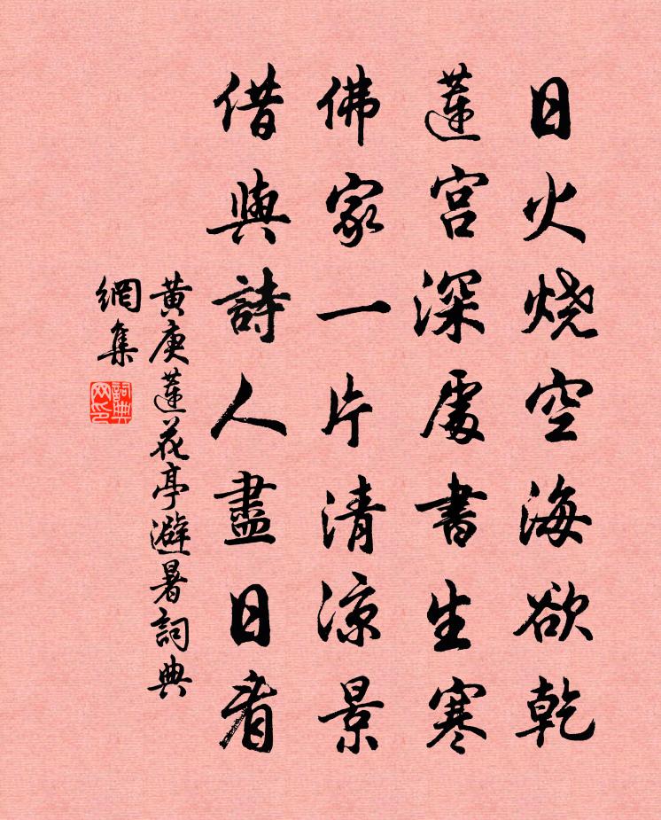 詩詞名句歷史字典書法欣賞書法字典國語詞典說文解字康熙字典古漢語字典標 題 作 者 詩 句 蓮花亭避暑作者:黃庚 朝代:宋代蓮花亭避暑原文日火燒空海欲乾,蓮宮深處書生寒。佛家一片清涼景,借與詩人盡日看。詩詞問答問:蓮花亭避暑的作者是誰?答:黃庚問:蓮花亭避暑寫於哪個朝代?答:宋代黃庚蓮花亭避暑書法欣賞蓮花亭避暑書法作品詩詞推薦燕雀湖楊備〔宋代〕平湖岸側見高墳,萬土銜來燕譽群。鑒面無波天一色,此中文藻似儲君。郡圃雪霽便有春意楊萬里〔宋代〕臘傍梅梢盡,春從水底歸。草拳擎雪健,桃糝隔年肥。夜夜還鄉夢,心心逐鴈飛。誰言五斗米,便勝北山薇。滿江紅佚名〔宋代〕萱草堂開,仙姿秀、金枝玉葉。親曾映、堯階三月,蓂舒六莢。榮侍早隨台輔鼎,長生已鏤天潢牒。自當年、苹藻諸人見和返魂梅再次韻曾幾〔宋代〕蠟炬高花半欲摧,斑斑小雨學黃梅。有時燕寢香中坐,如夢前村雪裡開。披拂故令攜袖滿,橫斜便欲映窗來。重簾句晏殊〔宋代〕何用粉牆高百尺,任教牆外俗人看。次方雲台韻陳宓〔宋代〕泉石膏盲世欲忘,扁舟更遡壽湖光。也知他日持荷橐,不似閒時制芰裳。雨後尚餘新稻熟,風前偏覺荔枝香。人生徐先輩輓詞趙師秀〔宋代〕豈謂聲名早,番成不遇非。賦曾天子見,詩有世人知。忽種松三尺,終乖桂一枝。幽芳誰與志,御史念壎箎。滿庭芳 和芝陽靈元子衛信道韻馬鈺〔元代〕放懶生涯,欣慵活計,起心念念慈悲。而今不肯,摘葉更尋枝。撇下之乎者也,的端認、蓮出青泥。閒閒里,捫心賢者之孝二百四十首闕黨子弟林同〔宋代〕既漸夫子教,罔有不分均。何復間多取,齊言彼有親。題蘇才翁草書壁後黃庭堅〔宋代〕老公不得千年壽,何況高材傲世人。唯有草書三昧法,龍蛇夭矯鎖黃塵。舟中遣懷陸游〔宋代〕三黜歸來結草廬,平生狂態掃無餘。但思下帷授老子,那復騎牛讀漢書。歷歷舊遊渾似夢,蕭蕭殘發不勝梳。閒中二十四詩品司空圖〔唐代〕猶礦出金,如鉛出銀,超心鍊冶,絕愛緇磷。空潭瀉春,古鏡照神,體素儲潔,乘月反真。載瞻星辰,載歌幽人,復用韻記昨日坐中劇談及趙家琵琶之妙,呈王范成大〔宋代〕曹穆新聲和者稀,如今妙手屬天支。轉關濩索都傳得,想見飛凰舞綠絲。用寄成季韻呈魯直晁補之〔宋代〕懷英名高長史口,獨以一人當北斗。黃公崛起與之班,奄有斯名唐以還。文章破觚賴聖世,筆墨未逃蹊徑間。湖州賀新郎(壽右史·正月初七)王邁〔宋代〕曾侍螭頭立。吐危言、嬰鱗編虎,扶持鰲極。誰煉精金鑄剛卯,氣節毅然鎮國。肯顧戀、眼前官職。碧水丹山持翠題張醫諭活庵李曾伯〔宋代〕用藥如用兵,命醫猶命將。醫良則身安,將良則師壯。表里孰虛實,存亡在俯仰。能出康濟方,憂慮危急狀。活法清平樂趙長卿〔宋代〕紫簫聲斷。窗底春愁亂。試著春衫羞自看。窄似年時一半。一春長病厭厭。新來愁病重添。香冷倦熏金鴨,日高不滿庭芳侯善淵〔元代〕斗柄迴旋,紫微初現,緬平一色淳清。雲瑛搗盡,天寶耀華嬰。玉桂瓊林素羽,升玄御、光璨流精。冷然妙,丹黃李與賢來訪,自言所居幽勝,甚似剡溪。因以楊萬里〔宋代〕漫浪江湖天一方,故人不見兩三霜。對床說盡平生話,黃葉聲中秋夜長。奉和李相公早朝於中書候傳點偶書所懷奉呈門下…鄭相公呂溫〔唐代〕禁門留騎吹,內省正衣冠。稍辨旂常色,尚聞鐘漏殘。九天爐氣暖,六月玉聲寒。宿霧開霞觀,晨光泛露盤。致君名句推薦物莫非指,而指非指。公孫龍《公孫龍子·指物論》 空山不見人,但聞人語響。王維《鹿柴》 昔嘆當年無李牧,今知江左有夷吾陳亮《送文子轉漕江東二首》 攻取者先兵權,建本者尚德化。陳壽《三國志·魏書·荀彧攸賈詡傳》 憶得盈盈拾翠侶,共攜賞、鳳城寒食。李甲《帝台春·芳草碧色》 雲物淒涼拂曙流,漢家宮闕動高秋。趙嘏《長安晚秋 / 秋望 / 秋夕》 小住京華,早又是,中秋佳節。秋瑾《滿江紅·小住京華》 八月秋高風怒號,卷我屋上三重茅。杜甫《茅屋為秋風所破歌》 那堪疏雨滴黃昏。更特地、憶王孫。歐陽修《少年游·欄乾十二獨憑春》 塞北梅花羌笛吹,淮南桂樹小山詞。劉禹錫《楊柳枝詞九首·其一》