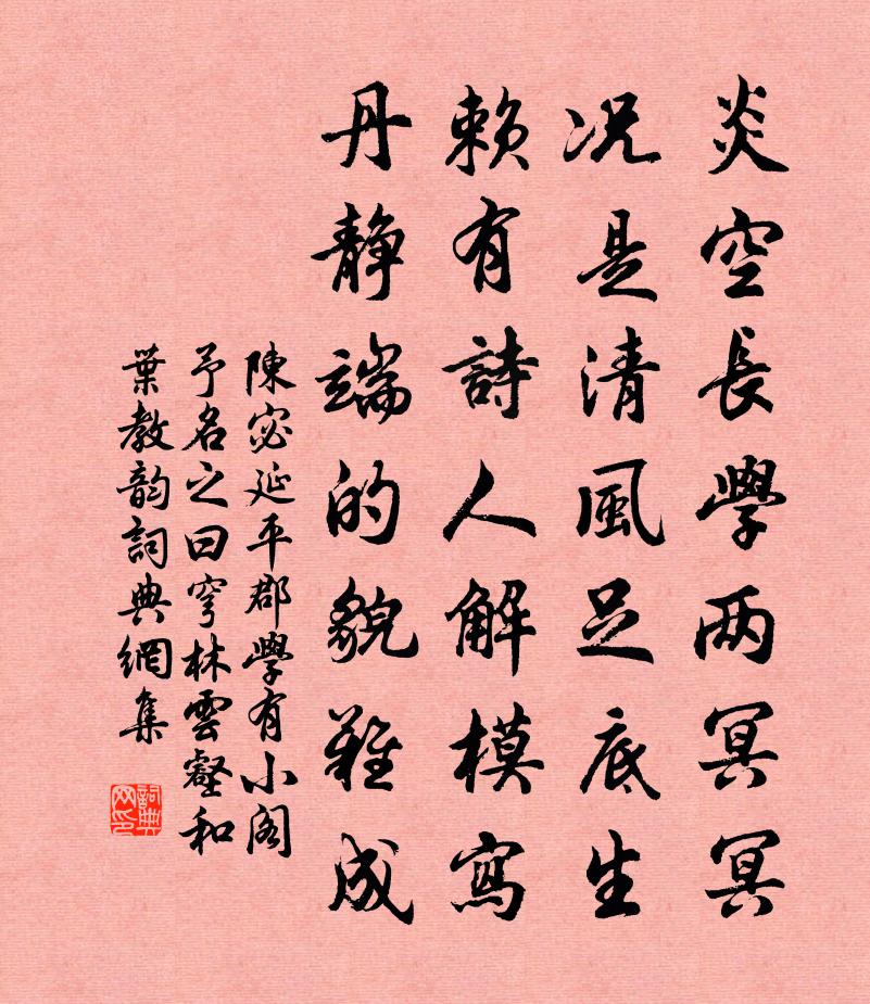 詩詞名句歷史字典書法欣賞書法字典國語詞典說文解字康熙字典古漢語字典標 題 作 者 詩 句 延平郡學有小閣予名之曰穹林雲壑和葉教韻作者:陳宓 朝代:宋代原文炎空長學兩冥冥,況是清風足底生。賴有詩人解模寫,丹靜端的貌難成。詩詞問答問:《延平郡學有小閣予名之曰穹林雲壑和葉教韻》的作者是誰?答:陳宓問:該詩寫於哪個朝代?答:宋代書法欣賞延平郡學有小閣予名之曰穹林雲壑和葉教韻書法作品詩詞推薦送五時亨舍人帥蜀詩二首周麟之〔宋代〕煌煌大毛照坤維,忽見文星下紫微。萬里江山渾改觀,九重紳笏更爭輝。占松不假刀形夢,換馬端期鵠趁飛。試問送別魏校書借參預李先生韻程公許〔宋代〕斯文天未椓,世復有斯人。縹帙磨鉛舊,泥封染墨新。詞華班馬富,道術魯鄒醇。滿腹經綸願,逢時氣益振。醉眠夜聞霜風甚緊,起坐達旦二首楊萬里〔宋代〕雪花旋落旋成融,橫作清霜陣陣風。一夜急吹君會否?妒他殘葉戀丹楓。呈胡舍人二首釋寶曇〔宋代〕官閒無事只深禪,齋戒何曾廢客煙。總是老夫貪佛日,未妨天眼識公年。江湖滿意藏詩笥,鷗鳥無心傍客船。參井足虞叟兄句蘇泂〔宋代〕六月還當月盡休,今年節令卻齊頭。蕭蕭不待聽梧葉,一見銀河認得秋。蕭宅二三子贈答詩二十首客謝井盧仝〔唐代〕改邑不改井,此是井卦辭。井公莫怪驚,說我成憨痴。我縱有神力,爭敢將公歸。揚州惡百姓,疑我捲地皮。大劍送別劉右史盧照鄰〔唐代〕金碧禹山遠,關梁蜀道難。相逢屬婉歲,相送動征鞍。地咽綿川冷,雲凝劍閣寒。倘遇忠孝所,為道憶長安。余作生墳何生謙致檜十株答以六言二首劉克莊〔宋代〕高聳心抽筆直,下蟠上銳塔圓。深入蟄龍穴處,肯傍眠牛石邊。再次王宰簿喜雨聊句韻史彌寧〔宋代〕旱魃重為妖,點雨如點血。一念神所矜,蜚廉變騷屑。靈螭卷天河,千里洗袢熱。二妙喜欲顛,鎢豪賡白雪。雲煙題孤山寺山石榴花示諸僧眾白居易〔唐代〕山榴花似結紅巾,容艷新妍占斷春。色相故關行道地,香塵擬觸坐禪人。瞿曇弟子君知否,恐是天魔女化身。絕句六十四首張伯端〔宋代〕金翁本是東家子,送向西鄰寄體生。認得喚來歸舍養,配將奼女作親情。西江月(橘)李之儀〔宋代〕昨夜十分霜重,曉來千里書傳。吳山秀處洞庭邊。不夜星垂初遍。好事寄來禪侶,多情將送琴仙。為憐佳果稱嬋娟歲晏洪咨夔〔宋代〕得路只輪車易上,失時獨幅被難眠。淡黃虀飯茅柴酒,東掩西遮也過年。宿江閣趙汝鐩〔宋代〕閣前眼界如圖畫,山色侵窗竹打檐。雲帶雁聲移別蒲,月將梅影進疏簾。壯懷自笑年年減,華發無情日日添。夜半酬在伯再用書事之韻趙蕃〔宋代〕西行險絕類中巴,東望悲涼底是家。渺渺春風限啼鴃,悠悠落日送歸鴉。室盈幼稚為腰折,腹有詩書宜氣華。兩日和吳子美香林湯韻王之道〔宋代〕泉沸雞籠山下林,潯陽曾記尺余深。濯鮮瀹卵非予事,清暑攘寒蓋我心。物態漫勞私曖曖,靈源當信匪今今。簿書早梅芳/喜遷鶯陳允平〔宋代〕柳初妍,花漸好。可恨行期到。落梅香盡,澹月朦朧微照。風簾銀燭暗,露幕金花小。縱離歌緩唱,殘角又霜曉。游邊感懷二首張喬〔唐代〕貧游繚繞困邊沙,卻被遼陽戰士嗟。不是無家歸不得,有家歸去似無家。兄弟江南身塞北,雁飛猶自半年余。夜來堂堂李賀〔唐代〕堂堂復堂堂,紅脫梅灰香。十年粉蠹生畫梁,飢蟲不食摧碎黃。蕙花已老桃葉長,禁院懸簾隔御光。華清源中礬石乞新茶姚合〔唐代〕嫩綠微黃碧澗春,采時聞道斷葷辛。不將錢買將詩乞,借問山翁有幾人。名句推薦玄都觀里桃千樹,儘是劉郎去後栽。劉禹錫《元和十年自朗州至京戲贈看花諸君子 / 玄都觀桃花》 明朝甑復空,母子相持哭。陸游《十月二十八日風雨大作》 繡帳已闌離別夢,玉爐空裊寂寥香。馮延巳《浣溪沙·春到青門柳色黃》 大哉,時之相生也!達者可與幾矣。王通《中說·卷五·問易篇》 聖人不治已病,治未病;不治已亂,治未亂佚名《黃帝內經·素問·四氣調神大論》 不痴不聾,不作家翁。司馬光《資治通鑑·唐紀四十》 花隱掖垣暮,啾啾棲鳥過。杜甫《春宿左省》 芙蓉老秋霜,團扇羞網塵。李白《中山孺子妾歌》 尚憶先朝多樂事,孝皇曾為兩宮開。王守仁《元夕二首》 才過清明,漸覺傷春暮。李冠《蝶戀花·春暮》