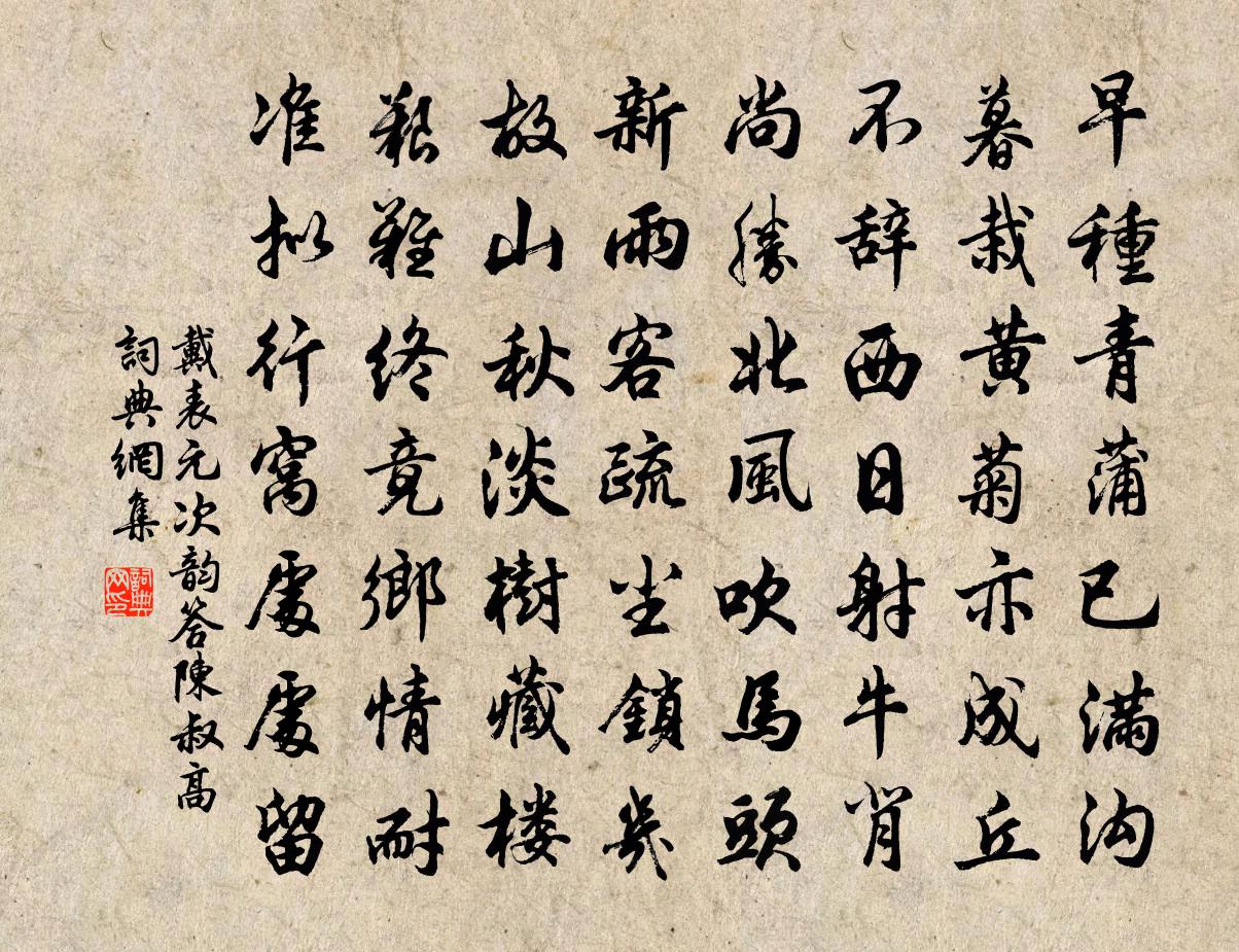 詩詞名句歷史字典書法欣賞書法字典國語詞典說文解字康熙字典古漢語字典標 題 作 者 詩 句 次韻答陳叔高作者:戴表元 朝代:宋代次韻答陳叔高原文早種青蒲已滿溝,暮栽黃1/1菊亦成丘。不辭西日射牛背,尚勝北風吹馬頭。新雨客疏塵鎖幾,故山秋淡樹藏樓。艱難終竟鄉情耐,準擬行窩處處留。詩詞問答問:次韻答陳叔高的作者是誰?答:戴表元問:次韻答陳叔高寫於哪個朝代?答:宋代戴表元次韻答陳叔高書法欣賞次韻答陳叔高書法作品詩詞推薦崇寧壬午臨汝四月始聞鶯二首張耒〔宋代〕好音終在恥爭先,谷外寒多故後遷。已過花時亦何恨,不妨夏木綠參天。贈李傅楊巨源〔唐代〕知因公望掩能文,誓激明誠在致君。曾罷雙旌瞻白日,猶將一劍許黃雲。搖窗竹色留僧語,入院松聲共鶴聞,莫被送僧之京師林逋〔宋代〕皇城十二衢,埃塵滿香裓。何以待歸期,山中桂花色。送桂陽孝廉高適〔唐代〕桂陽年少西入秦,數經甲科猶白身。即今江海一歸客,他日雲霄萬里人。庚午春作釋行海〔宋代〕相逢處處說干戈,又報天驕走渡河。鄉國不知音問少,友朋無奈別離多。楊花漠漠迷春思,芳草萋萋感暮歌。猿鳥歲晚書事十首劉克莊〔宋代〕書生元不信禨祥,老去無端慮事祥。白髮社巫雲日吉,明朝渫井更苫牆。挽沈次卿學正陳傅良〔宋代〕洛學傳當代,家聲屬此翁。一生無世味,萬事與人同。恨不師前鄭,欣賞客阿戎。宜銘千古意,豈在語言工。【雙調】慶東原_西皋亭適興薛昂夫〔元代〕西皋亭適興曉雨登高驟,西風落帽羞,蟹肥時管甚黃花瘦。紅裙謾謳,青樽有酒,白髮無愁。晚節傲清霜,老圃香火合午睡起負暄二首楊萬里〔宋代〕 * 霜枝已懶殘,瑞香紫筍政團欒。盆池影里看題壁,上字還成下字看。謁梅都官墓滕珂〔宋代〕百年詩老臥空山,猶憶當時語帶酸。贏得兒童喚夫子,可憐名位只都官。手編新史唐文備,骨立殘碑漢籀漫。落日華亭風月堂避暑王之道〔宋代〕大哉天休何穹窿,惟王配天居域中。東西南北乃四裔,盛德可使車書同。吾皇中興繼商武,小雅不復歌車攻。年來奉和令公綠野堂種花白居易〔唐代〕綠野堂開占物華,路人指道令公家。令公桃李滿天下,何用堂前更種花。蔬食王炎〔宋代〕瓠白吾何有,人言太瘦生。富兒皆肉食,我輩但藜羹。安得萬錢費,應無五鼎烹。飢腸雷欲吼,一飽亦何營。賀州陶弼〔宋代〕舍轡厲天險,身疑出鳥群。罅開蠻俗合,脊盡瘴江分。小池宋祁〔宋代〕細溜沙渠逗曲池,碧潯餘潤漬蚌衣。風休浪靜如圓鑒,時有文禽照影飛。夜意李商隱〔唐代〕簾垂幕半卷,枕冷被仍香。如何為相憶,魂夢過瀟湘。漫興九首方回〔宋代〕枕上半醒中酒病,樓前時過賣花聲。千門萬戶俱更換,惟此依稀舊太平。效王仲至少監詠姚花用其韻四首黃庭堅〔宋代〕映日低風整復斜,綠玉眉心黃袖遮。大梁城裡雖罕見,心知不是牛家花。石洲遇陳季申話舊戴復古〔宋代〕綠樹掛烏帽,清波照白頭。合隨秋燕去,那作賈胡留。紅吐檳榔唾,香薰茉莉球。樽前話疇昔,一笑不能休。鷓鴣天(禁菸)韓淲〔宋代〕煙禁荒荒雨濕雲。近郊爭出滿城人。兒童藉草幾成市,杯酒沾花不覺村。身又老,眼增明。回頭一任是紅塵。山中名句推薦國無九年之蓄曰不足,無六年之蓄曰急,無三年之蓄曰國非其國也。戴聖《禮記·王制》 嶺外音書斷,經冬復歷春。宋之問《渡漢江》 今年對花最匆匆,相逢似有恨,依依愁悴。周邦彥《花犯·小石梅花》 南去北來徒自老,故人稀。賀鑄《釣船歸·綠淨春深好染衣》 要問相思,天涯猶自短。晏幾道《清商怨·庭花香信尚淺》 同聲相應,同氣相求。佚名《易傳·乾文言》 自見之謂明。韓非及後人《韓非子·喻老》 霸業成空,遺恨無窮。查德卿《蟾宮曲·懷古》 和戎詔下十五年,將軍不戰空臨邊。陸游《關山月》 蓼岸荻花中,隱映竹籬茅舍。張昪《離亭燕·一帶江山如畫》