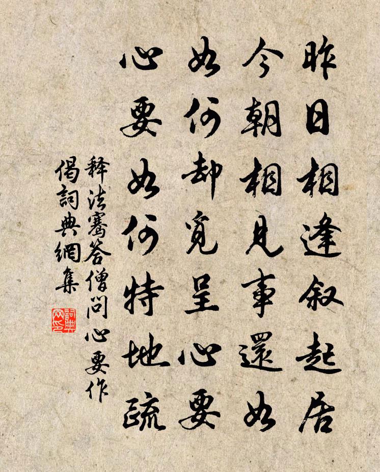 詩詞名句歷史字典書法欣賞書法字典國語詞典說文解字康熙字典古漢語字典標 題 作 者 詩 句 答僧問心要作偈作者:釋法騫 朝代:宋代答僧問心要作偈原文昨日相逢敘起居,今朝相見事還如。如何卻覓呈心要,心要如何特地疏。詩詞問答問:答僧問心要作偈的作者是誰?答:釋法騫問:答僧問心要作偈寫於哪個朝代?答:宋代釋法騫答僧問心要作偈書法欣賞答僧問心要作偈書法作品詩詞推薦霜寒陸游〔宋代〕霜重晨檐滴,薪乾夜焙溫。老惟便布褐,病不出柴門。瓶里梅花墮,窗間鵲語喧。閒人信無事,午睡到黃昏。與歐陽詢互嘲(無忌嘲詢)長孫無忌〔唐代〕聳膊成山字,埋肩不出頭。誰家麟角上,畫此一獼猴。滿江紅陳之賢〔宋代〕人物英雄,更獨抱、無雙才氣。年正壯,文章武略,盡曾留意。破膽欲憑胸內甲,清原宴啟舟中誓。笑區區、燕雀題袁州邵錄三老圖王義山〔宋代〕堂前活現老人星,兩個齊眉作壽朋。更有膝邊兒戲彩,此身都及見雲仍。謁金門范成大〔宋代〕塘水碧。仍帶麴塵顏色。泥泥縠紋無氣力。東風如愛惜。恰似越來溪側。也有一雙鸂鶒。只欠柳絲千百尺。繫船春送饒漕高斯得〔宋代〕已催四牡使騑歸,江漢旋歌命召詩。借問儀庭集鸞鳳,何如當道臥熊羆。柳迎士行成陰密,樓得元規發興奇。少待桃花張鎡〔宋代〕園翁能好客,折贈小春桃。卻為開花少,翻成占格高。來年紅爛漫,繞澗碧周遭。莫忘閶門外,曾將進濁醪。偈頌八十五首釋妙倫〔宋代〕自把碌磚空里擲,必端自打自家頭。酌然自痛自難說,自著摩挲歸去休。中秋望夕不見月宋祁〔宋代〕異時涼月好,常爾惜嚴更。此夜浮雲惡,胡然溷太清。心孤王粲牘,案對景山鎗。海蚌猶能滿,城烏更不驚。裴回吳國華暗香亭楊時〔宋代〕漫愁青女妒新妝,已有風傳處處香。試問隱淪溪上客,欲將春色若為藏。謝二吳書見訪王遂〔宋代〕緇衣之後賦無衣,王室安知晉鄭依。淝水八千思偃伯,丹徙十萬盡忘飢。喜看猿鶴從公樂,更覺蓴鱸到處肥。泉楮僻居宋伯仁〔宋代〕居僻恬無事,開軒挹晚晴。雨耽雲腳重,風約燕身輕。有子爭梨栗,無朋問死生。每憂入載酒,剝啄打門聲。老叟奉和枝孫促潛佳作劉衍〔宋代〕重興古廟一新成,推福昭然□□誠。和氣繕調□歲稔,嘉祥通化國風清。共夸□□明時盛,未算堯蓂按月榮。不獨句王度〔宋代〕雅分供餘食,鴿亂著殘棋。滿庭芳 藏頭 折起方字王哲〔元代〕方覓殘,餘蒙庵方,邀便出黃粱。中生秀,唯我最堪當。內沖和九轉,般運、二氣飄蕩。飈動,樓上下,出入呼光巫山一段雲姬翼〔元代〕雲散金風勁,天開玉宇新。亭亭孤月轉冰輪。光彩破黃昏。清坐*然韻勝。縹緲太虛真境。不煩風馭與飈輪。平步閶門外登溪船五首楊萬里〔宋代〕步下新船試水初,打頭攬載適逢予。一椽板屋才經雨,兩面油窗好讀書。剩 * 風木芍藥,亂篸棐兒竹籧篨。清溪朝中措 夜深殘月過山房辛棄疾〔宋代〕夜深殘月過山房。睡覺北窗涼。起繞中庭獨步,一天星鬥文章。朝來客話,山林鍾鼎,那處難忘。君向沙頭細問,送成都卒黎德升赴召崔侍郎薦士召者五人三首程公許〔宋代〕已往嗟奚及,方來當若何。幸無疏藥石,庶可起深疴。讎偽半盧扁,滌腸須華佗。康時付公等,隨分且弦歌。曲江早秋 二年作。白居易〔唐代〕秋波紅蓼水,夕照青蕪岸。獨信馬蹄行,曲江池四畔。早涼晴後至,殘暑暝來散。方喜炎燠銷,復嗟時節換。我年名句推薦語來江色暮,獨自下寒煙。李白《尋雍尊師隱居》 便覺眼前生意滿,東風吹水綠參差。張栻《立春偶成》 詩言志,歌永言,聲依永,律和聲。佚名《尚書·虞書·舜典》 當時輕別意中人,山長水遠知何處。晏殊《踏莎行·碧海無波》 人去空流水,花飛半掩門。秦觀《南歌子·香墨彎彎畫》 高議而不可及,不若卑論之有功也。劉向《說苑·談叢》 娶妻莫恨無良媒,書中自有顏如玉。趙恆《勸學詩》 凡事之本,必先治身呂不韋《呂氏春秋·紀·季春紀》 任力者故勞,任人者故逸。呂不韋《呂氏春秋·論·開春論》 悲歡離合總無情。一任階前、點滴到天明。蔣捷《虞美人·聽雨》