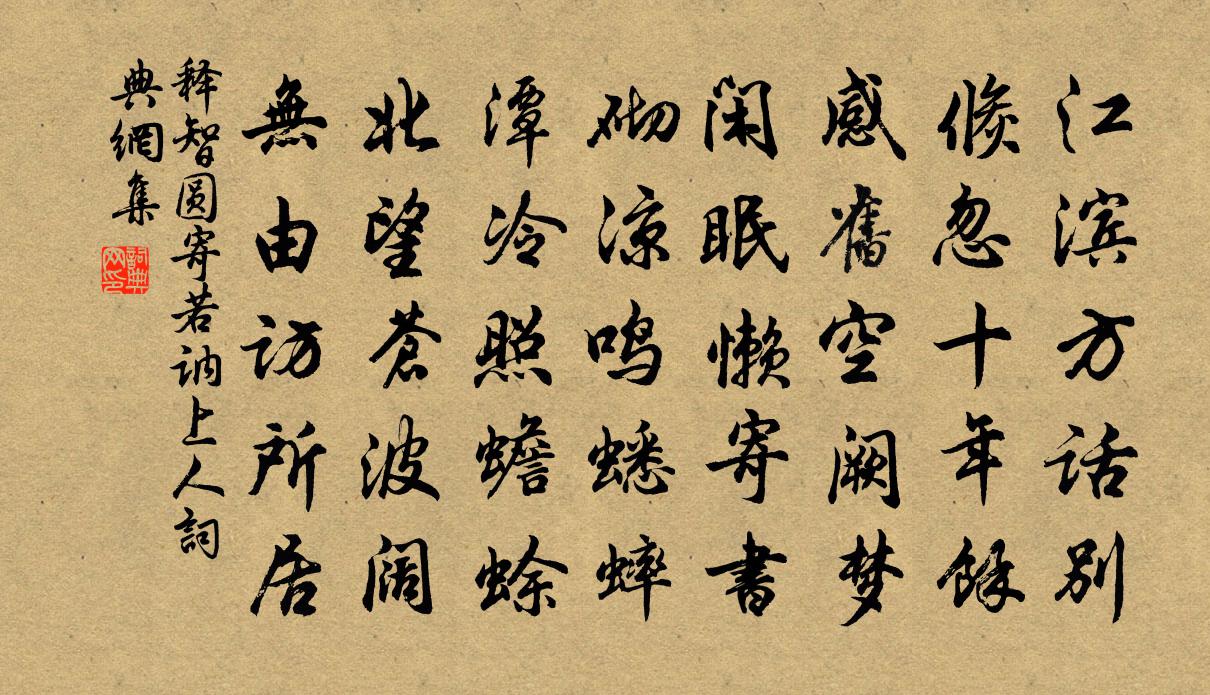 詩詞名句歷史字典書法欣賞書法字典國語詞典說文解字康熙字典古漢語字典標 題 作 者 詩 句 寄若訥上人作者:釋智圓 朝代:宋代寄若訥上人原文江濱方話別,倏忽十年餘。感舊空闕夢,閒眠懶寄書。砌涼鳴蟋蟀,潭冷照蟾蜍。北望蒼波闊,無由訪所居。詩詞問答問:寄若訥上人的作者是誰?答:釋智圓問:寄若訥上人寫於哪個朝代?答:宋代釋智圓寄若訥上人書法欣賞寄若訥上人書法作品詩詞推薦秋日疾中寄諸同志李鹹用〔唐代〕閒居無勝事,公幹臥來心。門靜秋風晚,人稀古巷深。花疏籬菊色,葉減井梧陰。賴有斯文在,時時得強尋。東陽郡齋中詣南山招韋十(一作東陽郡齋書事)錢起〔唐代〕霽來海半山,隱映城上起。中峰落照時,殘雪翠微里。同心久為別,孤興那對此。良會何遲遲,清揚瞻則邇。偈頌七十一首釋了惠〔宋代〕秉太阿劍,立太平基。卷旗青海尾,奏凱亂峰西。弟應兄呼成活業,汝攜鋤去我扶犁。改之下第賦贈李大力〔宋代〕劉郎氣豪酒豪詩更豪,乃肯折節作賦遺恨無纖毫。詩雄賦老不入世俗眼,仰空大叫索酒歌離騷。劉郎新詩今莫敵,口號十首呈程殿撰陳造〔宋代〕歡意長隨夜漏長,隆寬盡貸酒邊狂。東歸只有南窗夢,夜夜掀髯錦瑟傍。石室陳洵直〔宋代〕琅玕蕊笈藏幽谷,唯見白雲三五幅。昔日天師其姓吳,岩前遺下雲中屋。醉宿慈氏院晨起張耒〔宋代〕痛飲淋漓半夜醒,披衣坐得曉窗明。風松一夕清無限,壚火三更暖有情。孤閣鳴鐘天黯慘,寒山戴雪晚崢嶸。年來溪亭林景熙〔宋代〕清秋有餘思,日暮尚溪亭。高樹月初白,微風酒半醒。獨行穿落葉,閒坐數流螢。何處漁歌起?孤燈隔遠汀。琵琶陸游〔宋代〕西蜀琵琶邏逤槽,梨園舊譜郁輪袍。繡筵銀燭燕宮夜,一飲千鍾未足豪。次韻王鬱林蘇軾〔宋代〕晚途流落不堪言,海上春泥手自翻。漢使節空餘皓首,故侯瓜在有頹垣。平生多難非天意,此去殘年盡主恩。誤辱李總乾遺詩十四句師於一句之下加頌七句釋印肅〔宋代〕不如茆蓋頭,裹個大枯髏。鬼窟作活計,閻公未肯休。佛以法為身。不可以相求。一念無心者,法界剎那周。和仲嘉示秀實王洋〔宋代〕去秋九日失歸期,今度花前又過時。喚客便宜傾鑒落,與誰同伴插酴醾。新甘未厭松江鱠,敏捷先酬季父詩。莫道送西京簽判王著作王安石〔宋代〕兒曹曾上洛城頭,尚記清波繞驛流。卻想山川常在夢,可憐顏發已驚秋。辟書今日看君去,著籍長年嘆我留。三十生雲軒姜夔〔宋代〕在山長與雲同齋,出山憶云云不來。千金買得太湖石,數峰相對寒崔嵬。朝來忽覺青苔濕,靉靉如炊石間出。白雲北窗偶書,呈王仲顯、南卿二友范成大〔宋代〕官居故逼仄,北窗誰所開?胡床憩午暑,簾影久徘徊。高槐忽低昂,知有好風來。須臾墮幾席,篆香小飛灰。病翁樵童自入園來獻海棠因賦二章1舒岳祥〔宋代〕深蔓迷歸路,荒蹊未有家。誰知寒雨里,也作小春花。菌紫松間茁,菘黃澗底芽。道人新破戒,窗外種紅茶。苦熱黃公度〔宋代〕玉井晨不冷,茅檐午欲焚。月搖看畫箑,榴吐認紅裙。迥野都如火,奇峰空自雲。衣巾負芒刺,曝背有人耘。懷徐教趙汝鐩〔宋代〕憶昔相逢氣味投,興來無日不追游。靜尋鷗鷺同溪社,醉挈乾坤入釣舟。湖海匆匆三歲別,塵埃汩汩幾時休。一丘花月吟效連珠體十一首 8唐寅〔明代〕有花無月恨茫茫, 有月無花恨轉長; 花美似人臨月鏡, 月明如水照花香。 扶笻月下尋花步, 攜酒花前帶水調歌頭 庚辰六月,游玉華谷,回過少姨廟元好問〔金代〕中語,為之賦仙人詞,今載於此。夢入雲山宮闕幽。鸞同侶鴛鳳流。桂月竟夜光不收。世俗擾擾成囂湫。醉飛星名句推薦志不可不高,志不高,則同流合污,無足有為矣王永彬《圍爐夜話·第三十則》 鵝鴨不知春去盡,爭隨流水趁桃花。晁沖之《春日·陰陰溪曲綠交加》 秋草六朝寒,花雨空壇。朱彝尊《賣花聲·雨花台》 何處營巢夏將半,茅檐煙里語雙雙。杜牧《村舍燕》 敏捷詩千首,飄零酒一杯。杜甫《不見》 在天願作比翼鳥,在地願為連理枝。白居易《長恨歌》 行行無別語,只道早還鄉。袁凱《京師得家書》 居安思危。思則有備,有備無患左丘明《左傳·襄公·襄公十一年》 多謝月相憐,今宵不忍圓。朱淑真《菩薩蠻·山亭水榭秋方半》 兵戈既未息,兒童盡東征。杜甫《羌村三首·其三》