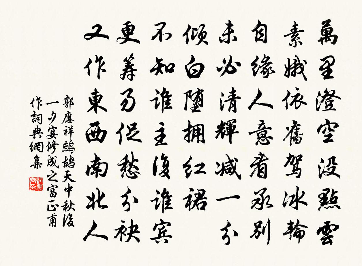 詩詞名句歷史字典書法欣賞書法字典國語詞典說文解字康熙字典古漢語字典標 題 作 者 詩 句 鷓鴣天(中秋後一夕宴修成之、富正甫作)作者:郭應祥 朝代:宋代原文萬里澄空沒點雲。素娥依舊駕冰輪。自緣人意看承別,未必清輝減一分。傾白墮,擁紅裙。不知誰主復誰賓。更籌易促愁分袂,又作東西南北人。詩詞問答問:《鷓鴣天(中秋後一夕宴修成之、富正甫作)》的作者是誰?答:郭應祥問:該詩寫於哪個朝代?答:宋代問:該詩是什麼體裁?答:詞書法欣賞鷓鴣天(中秋後一夕宴修成之、富正甫作)書法作品詩詞推薦靈和殿楊修〔宋代〕得地恩深雨露遍,丹墀左右玉階前。君王屬意君知否,恰似風流美少年。苦雨張耒〔宋代〕重雲冒山椒,大江浸其麓。通為一沮洳,哀此塗泥渥。居寄佛殺山,舉趾厭侷促。余飄污巾幾,積潤繁篁竹。門前高廟災董仲舒推說其意稿未上主父偃候仲舒私袁說友〔宋代〕老學推占後,奸人娼嫉初。懷私真詭計,候見竊成書。猛欲擠賢轍,寧思戒覆車。那知一回首,身已斃誅鋤。採蓮曲四錫〔宋代〕南谿秋水深淪蓮,南村美人來採蓮。蓮花灼灼葉田田,芳桂輕橈蘭作船。采采紅蓮幾成束,蓮枝交袞相撐綠。蓮蕊偈頌四十一首釋慧暉〔宋代〕辜月今朝初一日,正當冬至滿霜月。一陽佳節大家間,字字含玄向白日。效東坡送顧子敦體送趙子功令資陽王灼〔宋代〕子功宗室雋,一柱屹蒼蒼。投身冠蓋窟,所向率披猖。宏論震俚耳,百川吸滿觴。頗笑中壘尉,豈羨熱戟郎。胡為過桃花夫人廟(即息夫人)劉長卿〔唐代〕寂寞應千歲,桃花想一枝。路人看古木,江月向空祠。雲雨飛何處,山川是舊時。獨憐春草色,猶似憶佳期。叔父給事輓詞十首黃庭堅〔宋代〕廊廟從來不在邊,黃扉青瑣慶登賢。除書未試回天筆,何意佳城到馬前。劉百十六兄送梅花大鯽新酒以詩將和其韻四首杜范〔宋代〕新篘盎盎瀉瓊晶,照我襟懷徹底清。多謝白衣相問勞,舉杯無語不勝情。題閻立本十八學士圖鄭昺〔宋代〕閻公十八學士圖,當時妙筆分錙銖。惜哉名姓不題別,但可以意推形模。十二匹馬一匹驢,五士無馬應直廬。五鞍畫梅陳與義〔宋代〕娥眉淡淡自成妝,驛使還家空斷腸。脂粉不施憔悴盡,失身未嫁易元光。遊園葉茵〔宋代〕碧琅玕裹幾亭台,萬朵芙蕖照水開。可醉可吟尤可臥,主人無暇客長來。酬薛員外誼見戲一首皎然〔唐代〕方知正始作,麗掩碧雲詩。文彩盈懷袖,風規發詠思。遺弓逢大敵,摩壘怯偏師。頻有移書讓,多慚系組遲。淺才呈魯功甫華岳〔宋代〕拂面東風二月天,綠楊芳草暗平川。花容著雨斗翻錦,春色惱人催禁菸。燈夜雖然君有約,花時卻恐我無緣。直須留題東屯詩四首李壁〔宋代〕早日臯夔許致身,最憐一飯不忘君。飄零豈意窮山里,目斷長安隔戍雲。脾疼大作陳著〔宋代〕夜來宿痼起心脾,輾轉無眠不自支。水鳥信天那得飽,河魚作祟卻乘飢。苦無藥力課神效,爛煮菜根為善醫。造物偈頌一百四十一首釋師範〔宋代〕來無所從,南高峰,北高峰。去無所至,東澗水,西澗水。幻泡忽滅,證得包龜成白鱉。清風未已,須信高原元不萬年春馬鈺〔元代〕*人人學道總勞勞。個個心高志不高。煙火靡除生怨惡,塵情不斷起貪饕。欲搜玄妙消三業,猛向根芽下一刀。常八月十五看潮五絕蘇軾〔宋代〕吳兒生長狎濤淵,冒利輕生不自憐。東海若知明主意,應教斥鹵變桑田。欣欣亭李大異〔宋代〕雨露汪洋四海春,嶺南嶺北多歸人。朝中賢士罕過此,莫惜青錢呼白鱗。名句推薦梨花院落溶溶月,柳絮池塘淡淡風。晏殊《無題·油壁香車不再逢》 天街曾醉美人畔,涼枝移插烏巾。吳文英《夜飛鵲·蔡司戶席上南花》 去年今日關山路,細雨梅花正斷魂。蘇軾《正月二十日往岐亭郡人潘古郭三人送余於女王城東禪莊院》 秦女含顰向煙月,愁紅帶露空迢迢。溫庭筠《惜春詞》 世態便如翻覆雨,妾身元是分明月。文天祥《滿江紅·和王夫人滿江紅韻以庶幾後山妾薄命之意》 瑕不掩瑜、瑜不掩瑕戴聖《禮記·聘義》 察見淵魚者不詳,智料隱匿者有殃。列子及其弟子《列子·說符》 三杯通大道,一醉解千愁。佚名《增廣賢文·上集》 此情可待成追憶?只是當時已惘然。李商隱《錦瑟》 寒蟬淒切,對長亭晚,驟雨初歇。柳永《雨霖鈴·寒蟬淒切》