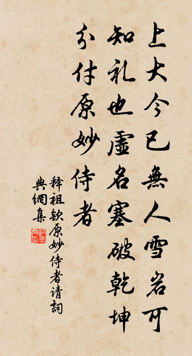 詩詞名句歷史字典書法欣賞書法字典國語詞典說文解字康熙字典古漢語字典標 題 作 者 詩 句 原妙侍者請作者:釋祖欽 朝代:宋代原妙侍者請原文上大今已無人,雪岩可知禮也。虛名塞破乾坤,分付原妙侍者。詩詞問答問:原妙侍者請的作者是誰?答:釋祖欽問:原妙侍者請寫於哪個朝代?答:宋代釋祖欽原妙侍者請書法欣賞原妙侍者請書法作品詩詞推薦巫山廟崔塗〔唐代〕雙黛儼如嚬,應傷故國春。江山非舊主,雲雨是前身。夢覺傳詞客,靈猶福楚人。不知千載後,何處又為神?寄李晦庵趙蕃〔宋代〕昔我曾大父,高父世無倫。晚生不盡得,所知三數人。堂堂贊皇公,實能繼張陳。諫垣磨薦墨,許之以經綸。江陵山中梅花薛嵎〔宋代〕已有梅花未有詩,青山相對動愁眉。山翁只在山中住,花落花開總不知。賜劉能真三首宋高宗〔宋代〕簡易高人道,崇玄性自真。身常居太極,心已遠凡塵。玉階辭榮祿,瑤台役鬼神。辛勤三十載,羨爾道心淳。寄林竹豀釋文珦〔宋代〕四海寥寥孰可宗,唯知豀上有豀翁,乾坤盡入文心裡,今古同歸醉眼中。梅子熟時明祖意,竹君多處振清風。野人草堂吳端〔宋代〕草堂長寂寂,無事且徘徊。幽鳥啼清嶂,閒雲覆綠苔。古琴邀月聽,新酒對花開。俗駕何為者,移文招不來。偶題姚合〔唐代〕年年九陌看春還,舊隱空勞夢寐間。遲日逍遙芸草長,聖朝清淨諫臣閒。偶逢遊客同傾酒,自有前騶恥見山。道侶戲題草樹張說〔唐代〕忽驚石榴樹,遠出渡江來。戲問芭蕉葉,何愁心不開。微霜拂宮桂,淒吹掃庭槐。榮盛更如此,慚君獨見哀。太平吟邵雍〔宋代〕老者得其養,幼者得其仰。勞者得其餉,死者得其葬。和李才甫先輩快閣五首黃庭堅〔宋代〕西南佳氣浮馬祖,東北祥風繞靜居。山邑豐年人少訟,身來訪道得齋魚。和汪正夫梅鄭獬〔宋代〕妖花爛漫敵清才,鄴騎還驚寶玦來。鄭國枉教蘭作佩,定應不識楚江梅。月夜馮時行〔宋代〕秋立雨新霽,氣清雲自消。地空銀海闊,天淨玉丸跳。把硯承明露,扶兒看碧霄。病禁淒冷得,不惜到明朝。次韻趙漕張栻〔宋代〕雨聲歷歷來庭戶,喜色津津到澤虞。擊壤徑思同野老,名亭詎敢學坡蘇。呈陸嚴州二首趙蕃〔宋代〕一代詩盟孰主張,試探源委見深長。家聲甫里歸嚴瀨,句法茶山出豫章。千里寸心長炯炯,十年兩鬢漫蒼蒼。扁舟送崔伯易歸高郵王令〔宋代〕山頭喬木長山高,山下泉深沒榜篙。春牛畢耕已閒瑕,春馬還有人游遨。田中青旗署沽酒,道上雙孫扶白毛。子有以詩問谹父病五首王洋〔宋代〕滿目溪山醉復醒,虛懷長羨少經營。相如病起忘消渴,一任沱江過錦城。秋日送別駱賓王〔唐代〕寂寥心事晚,搖落歲時秋。共此傷年發,相看惜去留。當歌應破涕,哀命返窮愁。別後能相憶,東陵有故侯。悼室人詩江淹〔南北朝〕二妃麗瀟湘。一有乍一無。佳人承雲氣。無下此幽都。當追帝女跡。出入泛靈輿。掩映金淵側。游豫碧山隅。曖然贈周善長省親熊禾〔宋代〕客路三千親七十,行道無情亦沾臆。阿娘七十更加四,阿翁七十更加八。人生至樂那有是,君獨胡為此役役。五鼎送鄭丞之羅浮中習業楊衡〔唐代〕百年泛飄忽,萬事系衰榮。高鴻脫矰繳,達士去簪纓。始從天目游,復作羅浮行。雲臥石林密,月窺花洞明。全形名句推薦空山新雨後,天氣晚來秋。王維《山居秋暝》 閣雪雲低,卷沙風急,驚雁失序。吳文英《永遇樂·探梅次時齋韻》 月黑雁飛高,單于夜遁逃。盧綸《和張僕射塞下曲·其三》 足國之道:節用裕民,而善臧其餘。荀子《荀子·富國》 夜寒微透薄羅裳,無限思量。秦觀《畫堂春·春情》 風無纖埃,雨無微津。左思《三都賦》 吾嘗跂而望矣,不如登高之博見也。荀子《荀子·勸學》 探其懷,奪之威。主上用之,若電若雷。韓非及後人《韓非子·揚權》 自見者不明;自是者不彰老子《老子·道經·第二十四章》 不患位之不尊,而患德之不崇范曄《後漢書·列傳·張衡列傳》