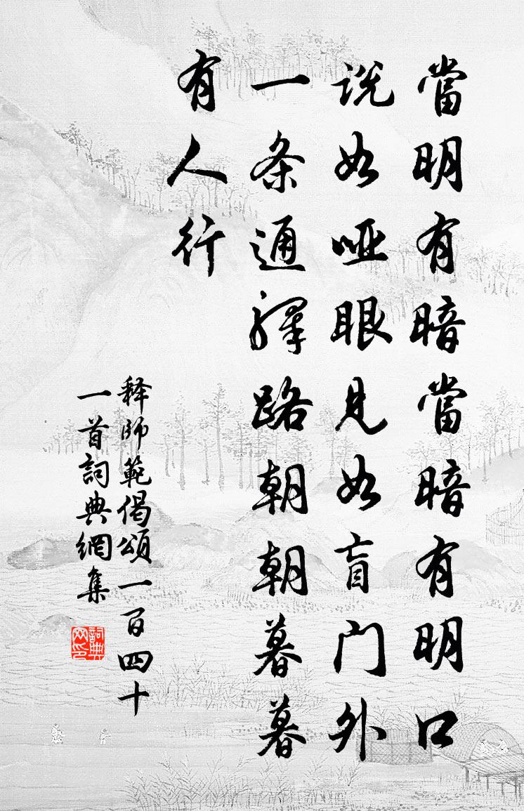詩詞名句歷史字典書法欣賞書法字典國語詞典說文解字康熙字典古漢語字典標 題 作 者 詩 句 偈頌一百四十一首作者:釋師範 朝代:宋代偈頌一百四十一首原文當明有暗,當暗有明。口說如啞,眼見如盲。門外一條通驛路,朝朝暮暮有人行。詩詞問答問:偈頌一百四十一首的作者是誰?答:釋師範問:偈頌一百四十一首寫於哪個朝代?答:宋代釋師範偈頌一百四十一首書法欣賞偈頌一百四十一首書法作品詩詞推薦唁陳頤剛頤大二兄廖行之〔宋代〕陳子吾為友,別來今甫春。孔庭歌壞木,竇樹失靈椿。誰謂有餘慶,幾成無告民。天涯一攜手,涕出為悲辛。柳含煙·河橋柳毛文錫〔唐代〕河橋柳,占芳春,映水含煙拂路。幾回攀折贈行人,暗傷神。樂府吹為橫笛曲,能使離腸斷續。不如移植在金門,瑞鷓鴣趙希蓬〔宋代〕把定離觴不肯斟。聞君未醉盡衷情。丁香空結千般恨,柳線難縈一片心。只把文章酧素願,莫貪歌舞阻歸程。憑君題周文矩合樂士女圖宋孝宗〔宋代〕今夜調琴忽有情,欲彈惆悵憶崔卿。何人解愛中徽上,秋思頭邊 * 聲。晨步西澗張鎡〔宋代〕日炙芹泥積漸融,一灣新漲小橋通。不因野鴨飛來喜,忘卻生涯書卷中。次韻洛陽秦慶父贄見陳著〔宋代〕洛中人物好,磊磊實過名。和氣春浮動,新詩玉琢成。相逢交義重,一笑世情輕。問到牡丹外,悽然百感生。春興吳龍翰〔宋代〕聞說春醪熟,提壺喚客嘗。乾坤一釀甕,花氣百和香。送碧香酒與趙明叔教授蘇軾〔宋代〕聞君有婦賢且廉,勸君慎勿為楚相。不羨紫駝分御食,自遣赤腳沽村釀。嗟君老狂不知愧,更吟醜婦惡嘲謗。諸生偈頌十四首釋印肅〔宋代〕老盧得法非僧相,龐老通明豈離家。大事未成俱業網,除非了本是生涯。阮郎歸(舟中作)劉將孫〔宋代〕斜陽江路柳青青。傳杯那放停。上船不記送人行。南風吹酒醒。江曲曲,路縈縈。月明潮水生。送將殘夢作浮萍。送新蓬州程倅吳泳〔宋代〕宛宛黃柳絲,錐錐雜花垂。柳解織別愁,花能送春歸。思君遠行邁,遊子心依依。有弦不解揮,有鏡不復治。豈是東峰亭臧詵〔宋代〕水西庭榭枕東峰,終日秋陰一徑松。月到灘心來白鷺,雲浮潭面起蒼龍。最宜翠斂前山雨,長是聲聞近寺鐘。報捷湖上方岳〔宋代〕老藤支我步湖漘,借與晴光一欠伸。楊柳得春青眼舊,山巒留雪白頭新。鐵琅璫語尋齋缽,銀鱍刺肥收釣緡。有兩送游考功將漕夔門七絕洪咨夔〔宋代〕古來刀鋸鼎鑊具,用待誹謗妖言人。{左扌右長}觸不怒予節去,惟天為大知堯仁。予頃從穰下移涖河陽洎出中書復領分陝惟茲二寇準〔宋代〕岸闊檣稀浪渺茫,獨憑危檻思何長。蕭蕭遠樹疏林外,一半秋山帶夕陽。奉和御製讀後魏書夏竦〔宋代〕真君昭密命,紀號表興隆。瑞著洪河外,文成翠石中。帝名傳祖禰,歷數感王公。三五方興運,明符事亦同。寶泰寺讀曾鴻父侍郎留題有感次韻作侍郎輓歌曹彥約〔宋代〕斯人千古必音塵,絕妙肝腸好受宰。四帙升覺懸日月,百年修短誤君親。天邊尚記絲綸手,地上今無磊砢人。對此生查子呂本中〔宋代〕殘春霧雨餘,小院黃昏後。說道覓新詞,把酒來相就。酴醿插髻雲,歲歲長如舊。不是做詞遲,卻怕添伊瘦。寄題劉仲更澤州家園韓維〔宋代〕聞君有佳尚,買勝不論錢。逕鑿蒼林蘚,亭開翠壁煙。從花窮洛譜,得石記唐年。數卷書勇萬,言章木以千。晨昏李氏園詩吳則禮〔宋代〕池面輕風卷碧羅,殘英寂寂委微波。暗香又逐落英去,奈此疏雲淡月何。名句推薦唯君子為能通天下之志。佚名《易傳·彖傳上·同人》 平生不下淚,於此泣無窮。李白《江夏別宋之悌》 日長唯鳥雀,春遠獨柴荊。杜甫《春遠 / 春運》 以國為國,以天下為天下。劉向 編《六親五法》 竹樹帶飛嵐,荇藻俱明麗。劉道著《湘江秋曉》 一月可曾閒幾日,百年難得閏中秋。慧霖《閏中秋玩月》 三日柴門擁不開,階平庭滿白皚皚。柳宗元《酬王二十舍人雪中見寄》 天下有道則見,無道則隱。孔子弟子《論語·泰伯篇》 國無常強,無常弱。奉法者強,則國強;奉法者弱,則國弱。韓非及後人《韓非子·有度》 杜漸防萌,慎之在始。房玄齡《晉書·列傳·第六十八章》