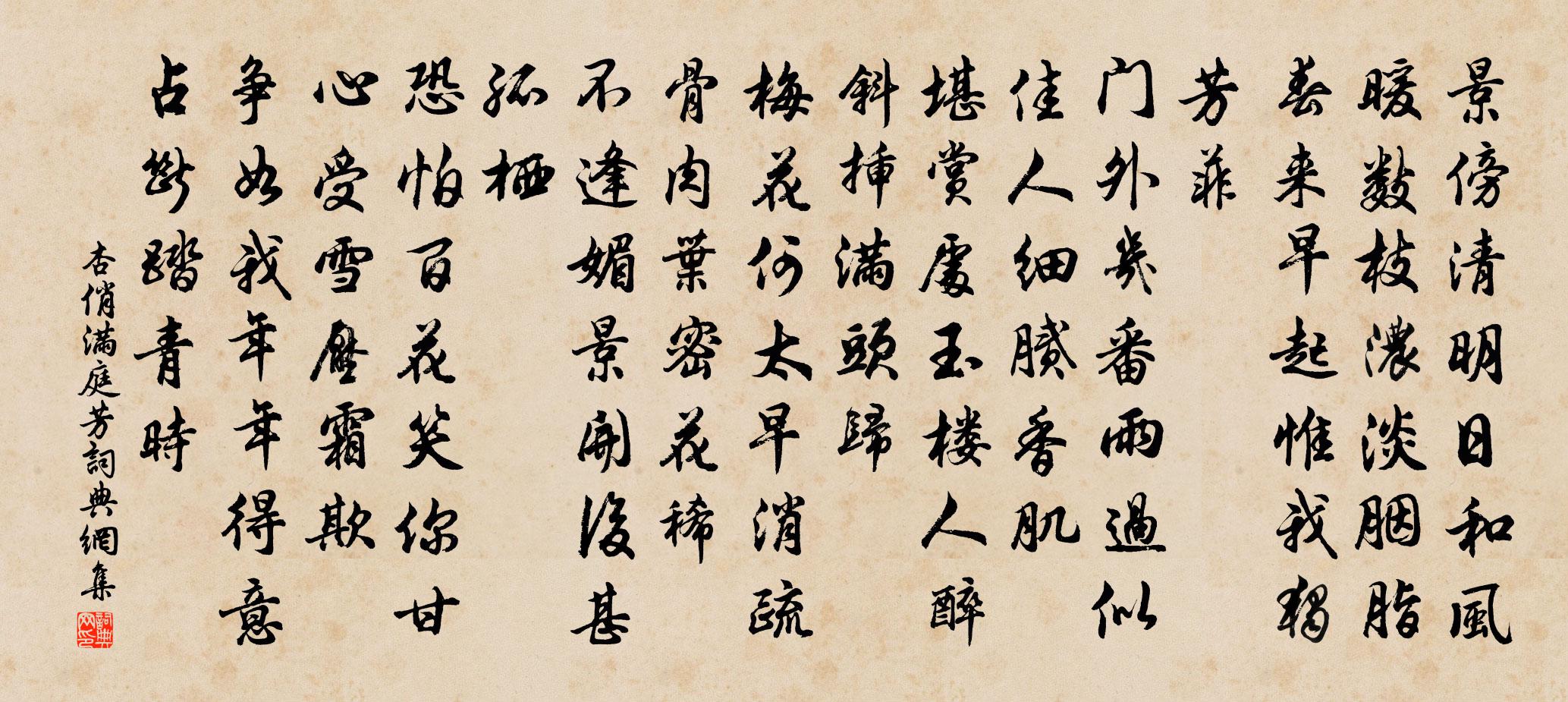 詩詞名句歷史字典書法欣賞書法字典國語詞典說文解字康熙字典古漢語字典標 題 作 者 詩 句 滿庭芳作者:杏俏 朝代:宋代滿庭芳原文景傍清明,日和風暖,數枝濃淡胭脂。春來早起,惟我獨芳菲。門外幾番雨過,似佳人、細膩香肌。堪賞處,玉樓人醉,斜插滿頭歸。梅花何太早,消疏骨肉,葉密花稀。不逢媚景,開後甚孤棲。恐怕百花笑你,甘心受、雪壓霜欺。爭如我,年年得意,占斷踏青時。詩詞問答問:滿庭芳的作者是誰?答:杏俏問:滿庭芳寫於哪個朝代?答:宋代問:滿庭芳是什麼體裁?答:詞杏俏滿庭芳書法欣賞滿庭芳書法作品詩詞推薦過冷泉張鎡〔宋代〕未喜亭陰坐,先貪樹畔行。豀渾因雨瀑,岩近得風清。一飯幽人福,三杯太古情。尚須冰月掛,來放雪濤傾。與福州滿禪人釋正覺〔宋代〕而今別後記丁寧,曹洞家風句未形。月滿鳳林寒不夢,年深龜殼灼猶靈。沈沈莫觸蛇頭毒,的的須明犀角星。便與蘿衣洞何澹〔宋代〕蘿衣晴帶護煙蓑,楚國狂夫尚作歌。石影到溪千丈勁,藤痕入目八分少。泉分小白山中雨,衣取雲門寺頂荷。洞口糖多令侯善淵〔元代〕休恁苦爭儸。人生得幾何。奈百年、有似南柯。富貴功名俱遂意,難免死生磨。也*。隨分養天和。陽生滿鼎多。浯溪趙善嗑〔宋代〕兩載真成漫浪遊,豐碑重拂倍含羞。空憐民力疲芻粟,濫廁時賢動冕旒。病骨詎堪勝重寄,歸舟喜不負清流。家山陳伯順夫婦輓詞林亦之〔宋代〕晴春相見未多時,忽嘆霜蕪雪屋非。僵瑟樓前方悼往, * 台下竟同歸。讀書歷歷向秋樹,織錦悠悠空曉機。須信浰陽早發蘇軾〔宋代〕富貴本先定,世人自榮枯。囂囂好名心,嗟我豈獨無。不能便退縮,但使進少徐。我行念西國,已分田園蕪。南來飲馬和城窟趙汝鐩〔宋代〕烏騅馬,紫游韁,戍夫一鞭天一方。揆程想過長城下,思古築役摧人腸。白骨如雪浸水窟,骨上猶帶秦時血。雨打自嘆文天祥〔宋代〕綠槐雲影弄黃昏,月照牢愁半掩門。一片心如千片碎,十分須有二分存。沙邊黃鵠長回首,江上杜鵑空斷魂。豎子送虞秀才擢第歸長沙獨孤及〔唐代〕充賦名今遂,安親事不違。甲科文比玉,歸路錦為衣。海運同鵾化,風帆若鳥飛。知君到三徑,松菊有光輝。寄曾公卷吳則禮〔宋代〕作業定相似,懷君徒忱傷。解包真有處,展缽且隨方。月出淮天白,梅繁水國香。垂垂老工部,獨少贊公房。劉友鶴以詩贈別次韻送之高斯得〔宋代〕昔披朝霞尋洞天,五峰矗漢高巑屼。靈君營魄蘿空鎖寒。古心未死不忍去,搖搖風纛空中懸。五年失腳墮時網,夢送人之任邛州許渾〔唐代〕綠髮監州丹府歸,還家樂事我先知。群童竹馬交迎日,二老蘭觴初見時。黃卷新書芸委積,青山舊路菊離披。亨衢頌證道歌證道歌釋印肅〔宋代〕是以禪門了知心,心心心外別無心。如今只是舊時底,不換源機放曠吟。高枕陸游〔宋代〕高枕閒看古篆香,世間萬事本茫茫。偶亡塞馬寧非福?太察淵魚恐不祥。每與諸兒論今古,常思百世業耕桑。危機醉吟二首白居易〔唐代〕空王百法學未得,奼女丹砂燒即飛。事事無成身老也,醉鄉不去欲何歸。兩鬢千莖新似雪,十分一醆欲如泥。酒狂句胡仔〔宋代〕為官兩部喧朝夢,在野千機促婦功。偈頌七十八首釋正覺〔宋代〕同聲相應,同氣相求。同風千里,不隔絲頭。脫盡情塵訊息在,蘆花江上月明秋。閒居自遣樂雷發〔宋代〕許由溪上小屠蘇,紅樹蒼山對一臞。白髮功名惟劍在,青燈活計並錐無。誰言荊楚名奇士,卻笑乾坤一腐儒。桐帽秋日病中張祜〔唐代〕析析檐前竹,秋聲拂簟涼。病加陰已久,愁覺夜初長。坐拾車前子,行看肘後方。無端憂食忌,開鏡倍萎黃。名句推薦音塵遠,楚天危樓獨倚。陸游《月上海棠·斜陽廢苑朱門閉》 莫愁前路無知己,天下誰人不識君。高適《別董大二首》 今古長如白練飛,一條界破青山色。徐凝《廬山瀑布》 不必於世事件件皆能,惟求與古人心心相印。王永彬《圍爐夜話·第一五三則》 一日不思量,也攢眉千度。柳永《晝夜樂·洞房記得初相遇》 佳期大堤下,淚向南雲滿李白《大堤曲》 畫圖恰似歸家夢,千里河山寸許長。辛棄疾《鷓鴣天·送元濟之歸豫章》 惟有南來無數雁,和明月、宿蘆花。鄧剡《唐多令·雨過水明霞》 自憐人憐,自棄人棄。心無滯礙,害不侵矣。來俊臣《羅織經·保身卷第七》 山頭堆白雪,風裡卷黃沙。楊守禮《三月巡邊曉發夏城》