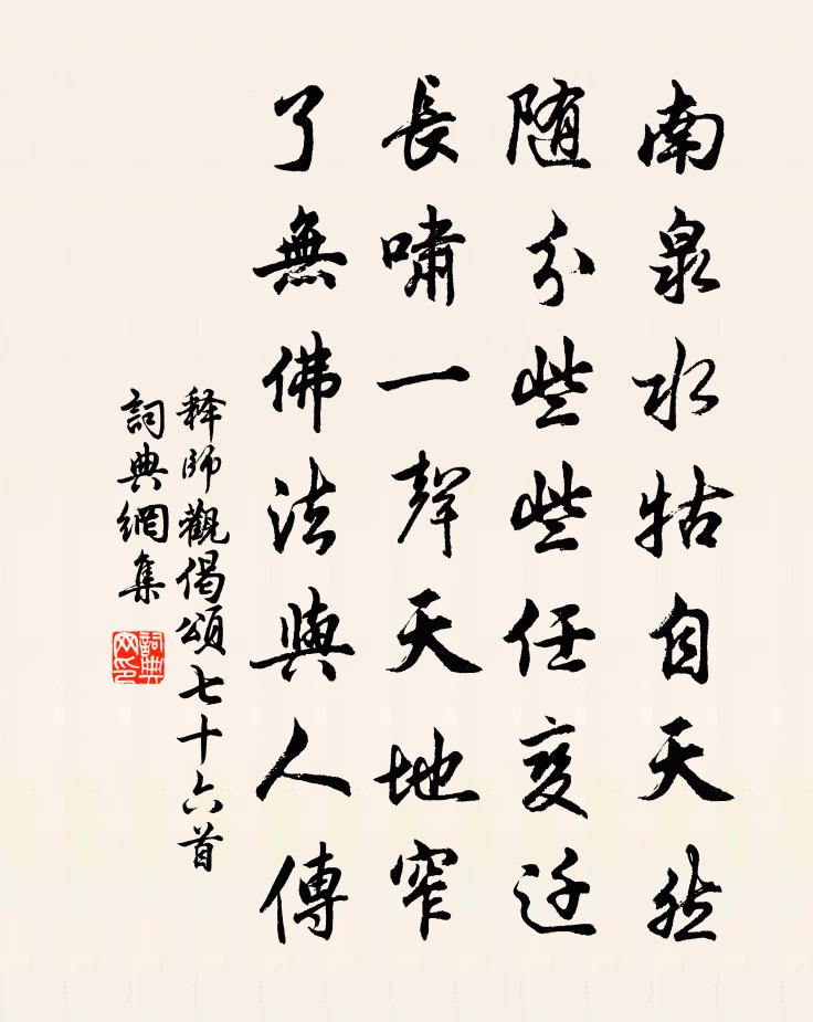 詩詞名句歷史字典書法欣賞書法字典國語詞典說文解字康熙字典古漢語字典標 題 作 者 詩 句 偈頌七十六首作者:釋師觀 朝代:宋代偈頌七十六首原文南泉水牯自天然,隨分些些任變遷。長嘯一聲天地窄,了無佛法與人傳。詩詞問答問:偈頌七十六首的作者是誰?答:釋師觀問:偈頌七十六首寫於哪個朝代?答:宋代釋師觀偈頌七十六首書法欣賞偈頌七十六首書法作品詩詞推薦孔君亮郎中新葺闕里西園棄官而歸蘇轍〔宋代〕宦情牢落苦思歸,君惻無人留子思。手種松筠須灌溉,親修寢廟憶烝祠。定應此去添桃李,還使舊塋無棘茨。他日定風波管鑒〔宋代〕秋入華堂一味清。四山環碧眼雙明。欲送主人天上去。無緒。一尊已帶別離情。洞府桃花常許見。□□。為誰特地薛端公寄示嘉川道中作次韻和酬魏野〔宋代〕繡衣不間薜蘿衣,春暮嘉川入詠思。憶我茅廬欹枕處,當君驄馬著鞭時。展眉喜近龍頭境,回首傷遙鶴髮期。從此南樓陸游〔宋代〕十年不把武昌酒,此日闌邊感慨深。舟楫紛紛南復北,山川莽莽古猶今。登臨壯士興懷地,忠義孤臣許國心。倚杖題新雁(一作羅鄴詩)杜荀鶴〔唐代〕暮天新雁起汀洲,紅蓼花疏水國秋。想得故園今夜月,幾人相憶在江樓。題花十絕句程公許〔宋代〕飢腸可忍麥登場,寒索衣裘蠶飫桑。莫為花殘恨風雨,深恩何以答東皇。登清音堂喻良能〔宋代〕洲以檀槽舊得名,風來草木自成聲。青衫司馬令人恨,只作潯陽送客行。送滕邁郎中赴睦州趙嘏〔唐代〕郡齊秋盡一江橫,頻命郎官地更清。星月去隨新詔動,旌旗遙映故山明。詩尋片石依依晚,帆掛孤雲杳杳輕。想到病起獨步洪咨夔〔宋代〕病將春到眼慵開,只為梅花猛一來。何處琵琶推卻手,舉頭啄木起林隈。偈頌一百五十首釋心月〔宋代〕風前敲落珊瑚枝,白玉鞭頭直下垂。要識香林家住處,水晶宮殿草離離。道院書壁沈長卿〔宋代〕約客探名勝,停輈得所欣。山寒多做雨,洞古不收雲。夜宿聽鳴麂,晨炊摘野芹。黃冠尤喜事,添炷石爐熏。春日雲林齋居倪瓚〔元代〕池泉春漲深,徑苔夕陰滿。諷詠《紫霞篇》,馳情華陽館。晴嵐拂書幌,飛花浮茗碗。階下松粉黃,窗間雲氣暖。擁爐不出輒終日自嘲陸游〔宋代〕柴門木落葉成堆,十日元無一再開。書坐藏多為飽祟,詩緣吟苦作窮媒。兒言山圃當收栗,僧約溪橋共探梅。堪笑與蘇訓直約游招隱寺韓元吉〔宋代〕鼙鼓初歸塞上師,京江酒美勝年時。春來逆旅真無事,身到名山合有詩。石底於菟窮作穴,泉間科斗鬧成池。荒寒道無情尹志平〔元代〕不避春風迢遞。來往默通真意。那個是吾家。信天涯。本性玄通無托。到處一身安樂。了了沒西東。住雲峰。九張機佚名〔宋代〕七張機。春蠶吐盡一生絲。莫教容易裁羅綺。無端翦破,仙鸞彩鳳,分作兩般衣。狀江南。仲秋沈仲昌〔唐代〕江南仲秋天,驔鼻大如船。雷是樟亭浪,苔為界石錢。憶齊安郡杜牧〔唐代〕平生睡足處,雲夢澤南州。一夜風欺竹,連江雨送秋。格卑常汩汩,力學強悠悠。終掉塵中手,瀟湘釣漫流。朝中措(艮翁生日)劉克莊〔宋代〕受持鼻祖五千言。留得穀神存。伴我賦詩茅屋,饒渠待詔金門。此翁歲晚,有書充棟,有酒盈樽。君看多花早落,喜遷鶯蔣捷〔宋代〕晴天廖廓。被孤雲畫出,離愁消索。玉局彈棋,金釵翦燭,芳思可勝搖落。鏡妝為慵遲晚,笙曲緣愁差錯。倒纖指名句推薦靡不有初,鮮克有終。佚名《盪》 兩岸人家微雨後,收紅豆,樹底纖纖抬素手。歐陽炯《南鄉子·路入南中》 朝來嗔寂寞,不肯試新衣。馮夢龍《喻世明言·卷一》 誠者自成也,而道自道也。子思《中庸·第二十五章》 夜雨滴空階,孤館夢回,情緒蕭索。柳永《尾犯·夜雨滴空階》 可憐繡戶侯門女,獨臥青燈古佛旁。曹雪芹《紅樓夢·第五回》 新豐美酒斗十千,鹹陽遊俠多少年。王維《少年行四首》 國無三年之食者,國非其國也墨子《墨子·05章 七患》 溪上桃花無數,花上有黃鸝。黃庭堅《水調歌頭·遊覽》 律回歲晚冰霜少,春到人間草木知。張栻《立春偶成》