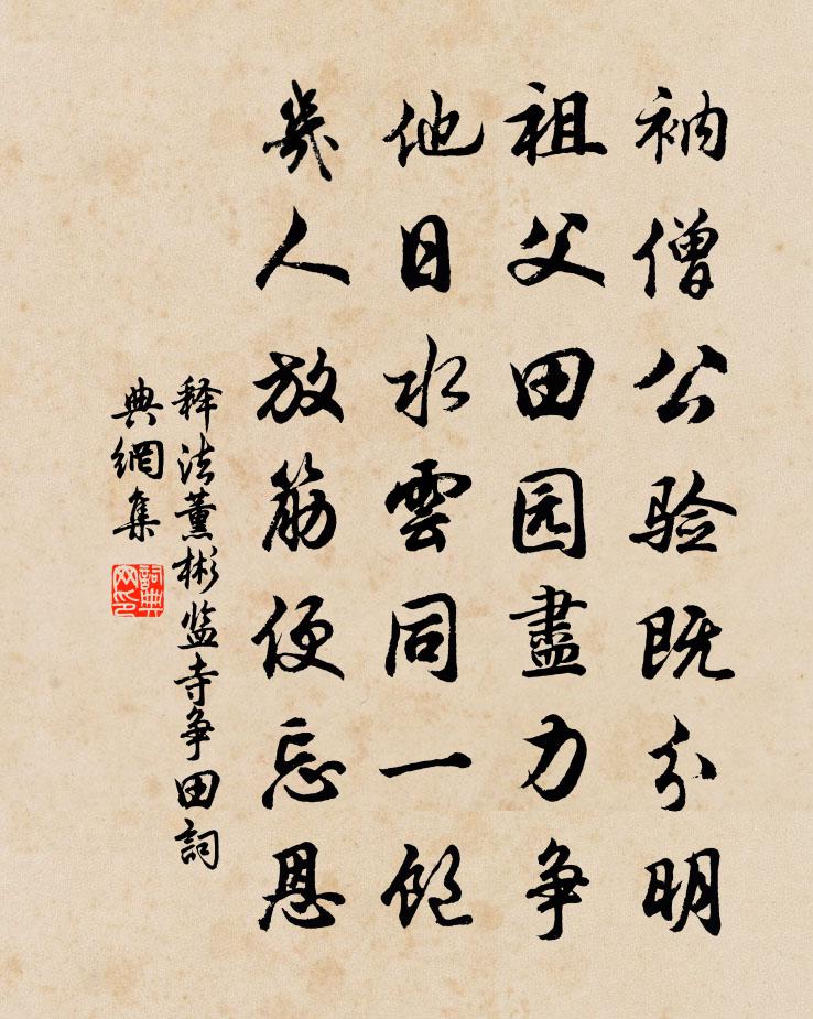 詩詞名句歷史字典書法欣賞書法字典國語詞典說文解字康熙字典古漢語字典標 題 作 者 詩 句 彬監寺爭田作者:釋法薰 朝代:宋代彬監寺爭田原文衲僧公驗既分明,祖父田園盡力爭。他日水雲同一飽,幾人放筋便忘恩。詩詞問答問:彬監寺爭田的作者是誰?答:釋法薰問:彬監寺爭田寫於哪個朝代?答:宋代釋法薰彬監寺爭田書法欣賞彬監寺爭田書法作品詩詞推薦煎茶曾幾〔宋代〕貧中有佳設,石鼎事煎烹。顧渚草芽白,惠山泉水清。酌多風可御,董歇霧猶橫。飲罷妻孥笑,枯腸百轉鳴。記丘宗卿語紹興府學前景楊萬里〔宋代〕鏡湖泮宮轉街曲,才隔清溪便無俗。竹橋斜度透竹門,牆根一竿半竿竹。恰思是間宣看梅,忽然一枝橫出來。霜余早行王鎡〔宋代〕客程因太早,卻費一更眠。落月已歸海,殘星猶在天。櫓聲荷葉浦,螢火豆花田。隔岸誰家起,青燈遠樹邊。處州水南庵二首秦觀〔宋代〕此身分付一 * ,靜對蕭蕭玉數竿。偶為老僧煎茗粥,自攜修綆汲清寬。偈頌一百零一首釋慧性〔宋代〕新梅雪裹依稀拆,愛日窗前迤邐長。漏泄東君好訊息,分明遍界不能藏。但得到家田地穩,天無佛法可商量。送任浙東廉使董天吉〔宋代〕畫戟凝香禮數殊,敢勤屣履下庸愚。有時小隊尋花柳,也枉前茅到竹梧。對客每曾蒙齒錄,問年直恐混泥塗。使君偈頌六十八首釋法薰〔宋代〕目前無法,意在目前。從上若佛若祖,天下老和尚罪過彌天。天,天,昨夜山僧針線囊中,打失一文古老錢。蝶戀花(醉宿鄭氏閣)朱松〔宋代〕清曉方塘開一鏡。落絮飛花,肯向春風定。點破翠奩人未醒。餘寒猶倚芭蕉勁。擬托行雲醫酒病。簾卷閒愁,空占題澤翁小巷王柏〔宋代〕縹緲雲煙外,迢迢江水明。數家藏密樹,一塔峭孤城。蝶戀花(聽周生鼓琵琶)毛滂〔宋代〕聞說君家傳窈窕。秀色天真,更奪丹青妙。細意端相都總好。春愁春媚生顰笑。瓊玉胸前金鳳小。那得殷勤,細托淯月下鼓琴用淳韻樓鑰〔宋代〕老穉團欒鯉在庭,言姬為鼓玉琴聲。起來同作悲風曲,倍覺先秋月影清。族侄孫子榮之子神童顏老不幸短命而死哭之不戴復古〔宋代〕亘古英靈在,顏回有後身。年才十三歲,才過萬千人。學到由天悟,文高見理真。再生仍再夭,無路問鴻鈞。初夏雜詠陸游〔宋代〕屐路緣虛壁,棋軒枕小灘。玄言不媿籍,熟睡卻輸摶。咄咄書常嬾,便便腹本寬。山園時節好,杏子已微丹。金字經馬致遠〔元代〕絮飛飄白雪,鮓[1]香荷葉風。且向江頭作釣翁。窮,男兒未濟中。風波夢,一場幻化中。和吳龍圖韻五首二色芙蓉文同〔宋代〕蜀國芙蓉名二色,重陽前後始盈枝。畫調粉筆分妝處,繡引紅針間刺時。落晚自憐窺露沼,忍寒誰念倚霜籬。主人題刁光胤畫冊葵石圖宋孝宗〔宋代〕中央正色殊堪重,況復丹心向太陽。可信化工深意在,只教此本染宮黃。晚晴黎廷瑞〔宋代〕欹枕聽殘雨,開門看東風。春光無尋處,天地綠氣中。初旭散平野,快酒瀉怒洪。關關枝上禽,舒舒葦間蟲。東郊野老釋文珦〔宋代〕野老一身輕,於今野趣成。交遊木上座,疏闊楮先生。溪甑炊菰米,山卮咀菊英。林園道子好,時復到柴荊。毛詩柏舟陳普〔宋代〕身似柏舟無倚著,心非席石可推移。威儀不被憂心亂,始信生民有秉彝。九日閒居讀陶詩有懷吳泳〔宋代〕閒意不在遠,吾廬自成趣。竹陰混午醉,菜甲疏曉露。庭草更不除,樹禽日相語。每繙架上帙,旋讀輒忘去。佳友名句推薦報君黃金台上意,提攜玉龍為君死!李賀《雁門太守行》 寧可枝頭抱香死,何曾吹落北風中。鄭思肖《畫菊》 孤燈不明思欲絕,卷帷望月空長嘆。李白《長相思·其一》 柏台霜威寒逼人,熱海炎氣為之薄。岑參《熱海行送崔侍御還京》 名花傾國兩相歡,常得君王帶笑看。李白《清平調·名花傾國兩相歡》 燕子不知人去也,飛認闌乾。韓疁《浪淘沙·莫上玉樓看》 開花必早落,桃李不如松。李白《箜篌謠》 萬里雲間戍,立馬劍門關。崔與之《水調歌頭·題劍閣》 誰家秋院無風入?何處秋窗無雨聲?曹雪芹《代別離·秋窗風雨夕》 目斷秋霄落雁,醉來時響空弦。辛棄疾《木蘭花慢·滁州送范倅》