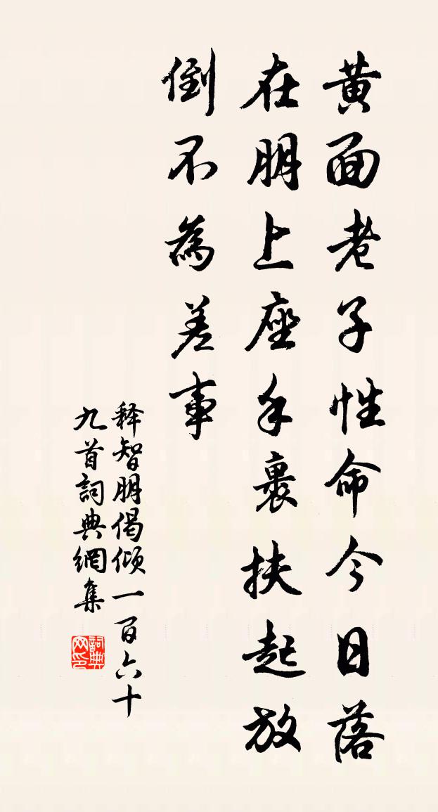 詩詞名句歷史字典書法欣賞書法字典國語詞典說文解字康熙字典古漢語字典標 題 作 者 詩 句 偈傾一百六十九首作者:釋智朋 朝代:宋代偈傾一百六十九首原文黃面老子性命,今日落在朋上座手裹。扶起放倒,不為差事。詩詞問答問:偈傾一百六十九首的作者是誰?答:釋智朋問:偈傾一百六十九首寫於哪個朝代?答:宋代釋智朋偈傾一百六十九首書法欣賞偈傾一百六十九首書法作品詩詞推薦春首陳叔達〔唐代〕雪花聯玉樹,冰彩散瑤池。翔禽遙出沒,積翠遠參差。高郵陳直躬處士畫雁二首蘇軾〔宋代〕野雁見人時,未起意先改。君從何處看,得此無人態。無乃槁木形,人禽兩自在。北風振枯葦,微雪落璀璀。慘澹金剛隨機無盡頌莊嚴淨土分第十釋印肅〔宋代〕山雲昨夜雨,檐頭滴滴舉。寒山拾得知,雙雙為伴侶。秦女休行李白〔唐代〕西門秦氏女,秀色如瓊花。手揮白楊刀,清晝殺仇家。羅袖灑赤血,英氣凌紫霞。直上西山去,關吏相邀遮。婿為黃嗣深尚書自仰山來惠茶及竹薰爐曾幾〔宋代〕茗椀中超舌界,薰爐上悟香塵。坐我集雲峰頂,對公小釋迦身。峴山韋不伐〔宋代〕羊公民愛深,原叔復善政。緝祠流聲詩,才德交輝映。水龍吟 已未春三月,同柔克濟河,中流風雨王惲〔元代〕賦此花詞,且以花經事之後花,重有所花惜雲春流兩岸桃花,驚濤極目吞天去。孤舟纜解,棹歌聲沸,漁*掀舞。掛金索佚名〔宋代〕三更里,陽生子母朝金闕。海底靈龜,吸盡金鳥烏血。一*綿綿,三關都透徹。萬道霞光,捧出西江月。望靈石李處權〔宋代〕杖藜出望江郎峰,清輝秀氣在眼中。當年何人運神斧,劖削碧玉成芙蓉。平地崛起五千仞,浮雲落日當秋空。東西早夏胡宿〔唐代〕井轄投多思不禁,密垂珠箔晝沈沈。睡驚燕語頻移枕,病起蛛絲半在琴。雨徑亂花埋宿艷,月軒修竹轉涼陰。一春偈頌十二首釋如淨〔宋代〕打破黑漆桶,十方空豁豁。爆雷一喝變通,掣電千機頓發。便可以東行撐架門庭,西班怒罵佛祖。收放絕來由,縱淇上別業高適〔唐代〕依依西山下,別業桑林邊。庭鴨喜多雨,鄰雞知暮天。野人種秋菜,古老開原田。且向世情遠,吾今聊自然。善慧大士贊釋智遇〔宋代〕萬派同源,三教一舌。咄者尊慈,弄巧成拙。秋夜高翥〔宋代〕小屏相對兩眉攢,長夜迢迢不肯殘。鼠向鐙前窺坐臥,人從夢裹說悲歡。故山無計行秋晚,客路從誰守歲寒。留得送蔡伯畛往潮州四首陳藻〔宋代〕迎侍雖然勝左遷,戀鄉畢竟怕離筵。讀書不合能譏佛,罰向潮州住幾年。樂庵初成二首李衡〔宋代〕老子平生百不足,庵成那管食無肉。終朝閉戶唯讀書,四面開宅都見竹。六言詩十首 其十嵇康〔兩漢〕嗟古賢原憲。棄背膏粱朱顏。樂此屢空饑寒。形陋體逸心寬。得志一世無患。送仲秉赴廷試五首李呂〔宋代〕一元誰破碎,河洛漏微分。星斗昭乾緯,葩華粲地文。班揚渾細事,伊傅有殊勛。補履非神劍,相期敬所聞。病起四詩四論報陳造〔宋代〕我本扶犂手,為儒父史意。全家飽官廩,髮膚盡君賜。一念三稽首,報答迄未議。向來挹前修,謂可跬步至。即今偈六首釋法智〔宋代〕動時常寂寂,靜處活鱍鱍。動靜兩俱忘,佛祖何處著。驀地夢回頭,長天飛一鶚。春風有時好,春風有時惡。不得名句推薦玉輪碾平芳草,半面惱紅妝。陳子龍《訴衷情·春遊》 碧海年年,試問取、冰輪為誰圓缺?納蘭性德《琵琶仙·中秋》 老吾老,以及人之老;幼吾幼,以及人之幼。孟子《孟子·梁惠王章句上·第八節》 富潤屋,德潤身,心廣體胖曾子《禮記·大學》 里仁為美,擇不處仁,焉得知?孔子弟子《論語·里仁篇》 棘枝風哭酸,桐葉霜顏高。孟郊《秋懷十五首》 樓兒忒小不藏愁。幾度和雲飛去、覓歸舟蔣捷《虞美人·梳樓》 橫笛和愁聽,斜枝倚病看。崔道融《梅花》 與人不求備,檢身若不及佚名《尚書·商書·伊訓》 月下飛天鏡,雲生結海樓。李白《渡荊門送別》