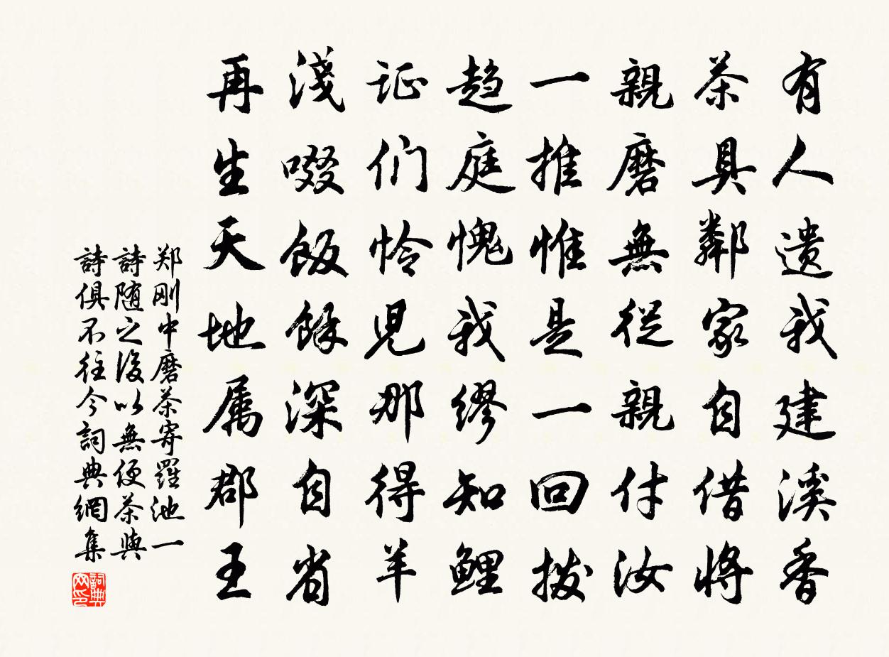 詩詞名句歷史字典書法欣賞書法字典國語詞典說文解字康熙字典古漢語字典標 題 作 者 詩 句 磨茶寄羅池一詩隨之後以無便茶與詩俱不往今作者:鄭剛中 朝代:宋代原文有人遺我建溪香,茶具鄰家自借將。親磨無從親付汝,一推惟是一回撥。趨庭愧我繆知鯉,證們憐兒那得羊。淺啜飯餘深自省,再生天地屬郡王。詩詞問答問:《磨茶寄羅池一詩隨之後以無便茶與詩俱不往今》的作者是誰?答:鄭剛中問:該詩寫於哪個朝代?答:宋代書法欣賞磨茶寄羅池一詩隨之後以無便茶與詩俱不往今書法作品詩文賞析【原題】:磨茶寄羅池一詩隨之後以無便茶與詩俱不往今謾錄於此過便焚切勿留詩詞推薦秋懷十首韓元吉〔宋代〕閉戶跏趺意已清,爐香燒盡一燈明。空庭葉落知多少,一任西風百種聲。老人及兒輩皆和再用前韻陳文蔚〔宋代〕不而繁桃俗杏栽,詩懷端為此花開。自緣祗結冰坷侶,花底渾無欲駕來。潯陽三題。東林寺白蓮白居易〔唐代〕東林北塘水,湛湛見底清。中生白芙蓉,菡萏三百莖。白日發光彩,清飆散芳馨。泄香銀囊破,瀉露玉盤傾。我慚燕趙多佳人佚名〔兩漢〕燕趙多佳人,美者顏如玉。被服羅裳衣,當戶理清曲。音響一何悲!弦急知柱促。馳情整巾帶,沉吟聊躑躅。思為羅浮梅方蒙仲〔宋代〕坡翁短衫情,此語差足據。為愛松風亭,朝雲已仙去。偈頌七十六首釋子益〔宋代〕一槌便就,顢顢頇頇。不假一槌,無端無端。忙裡工夫閒處覓,鬧中訊息靜中觀。僧慧僧利同往南山陳師道〔宋代〕驥騄同群鴻雁行,登臨端為作重陽。南台二謝風流絕,準擬歸來古錦囊。嘉禾百詠邦藥王龕張堯同〔宋代〕父老懷遺愛,誰傳肘後方。藥囊同日葬,空憶紫元香。與真上人一二禪師題玢寺主院朱慶餘〔唐代〕杖屨相隨任處便,不唯空寄上方眠。歸時亦取湖邊路,晚映楓林共上船。登樓有感黃文雷〔宋代〕顧陸風流幾夕陽,桑疇麥隴自淒涼。山從地盡雲垂海,水共天浮日射洋。門卒何年隱吳市,嗇夫當日愛桐鄉。蟻封鄉中每以寒食立夏之間省墳客夔適逢此時悽然陸游〔宋代〕手持綠酒酹蒼苔,今歲何由疋馬來。清淚不隨春雨斷,孤吟欲和暮猿哀。皂貂破弊歸心切,白髮淒涼老境催。誓墓點絳唇(和訪梅)劉辰翁〔宋代〕一雪蹉跎,蹇驢不載吟鞭去。夜聽春雨。踏雪差無苦。待得花晴,總是遊人處。梅應許。小橋延佇。蜂蝶先成路。君子有所恨晁說之〔宋代〕君子有所恨,擊指血不躁。相望已千古,欲語安得到。荊卿無劍術,商君棄霸道。二子苟不然,功烈回穹昊。嗟哉蒼寒堂張鎡〔宋代〕短橋斜路入松林,何止能銷利慾心。眼悟一真清淨色,耳通千古泰和音。尺量梢影邀僧記,竹護根莖恐鶴侵。莫訝秋懷三十六首邵雍〔宋代〕池荷日取敗,籬菊日就榮。其於品彙間,自與節氣爭。盛衰不同時,賢愚難並行。安得松桂心,四時長青青。同武平一員外游湖五首時武貶金壇令儲光羲〔唐代〕紅荷碧筱夜相鮮,皂蓋蘭橈浮翠筵。舟中對舞邯鄲曲,月下雙彈盧女弦。青林碧嶼暗相期,緩楫揮觥欲賦詩。借問贈戴石玉王炎午〔宋代〕琢之磨之,玉汝於成。孰為玉工,師友父兄。仙山之石,今則在我。彼璞之棄,我責之隋。為瑚為璉,如珪如璋。鷓鴣天晏幾道〔宋代〕綠橘梢頭幾點春,似留香蕊送行人。明朝紫鳳朝天路,十二重城五碧雲。歌漸咽,酒初醺,盡將紅淚濕湘裙。贛江立春郭印〔宋代〕頗恨東風巧入簾,不論朱戶與茅檐。青春處處為誰好,白髮年年空自嫌。市酒豈能供燕笑,官娃無復問穠纖。強隨自次前韻酬馬奧諸丈見和舒岳祥〔宋代〕得肉鳶歸樹,無魚鶴下田。此中藏世界,他處少人煙。可怪衣偏裻,何妨屐下穿。亂離多少事,史筆若為傳。名句推薦已是懸崖百丈冰,猶有花枝俏。 * 《卜運算元·詠梅》 利人乎即為,不利人乎即止。墨子《墨子·32章 非樂(上)》 南朝千古傷心事,猶唱後庭花。吳激《人月圓·南朝千古傷心事》 揚子江頭楊柳春,楊花愁殺渡江人。鄭谷《淮上與友人別》 無言獨上西樓,月如鉤。李煜《相見歡·無言獨上西樓》 既生瑜,何生亮!羅貫中《三國演義·第五十七回》 八年十二月,五日雪紛紛。白居易《村居苦寒》 清明天氣。永日愁如醉。杜安世《鶴沖天·清明天氣》 名花傾國兩相歡,常得君王帶笑看。李白《清平調·名花傾國兩相歡》 六出飛花入戶時,坐看青竹變瓊枝。高駢《對雪》
