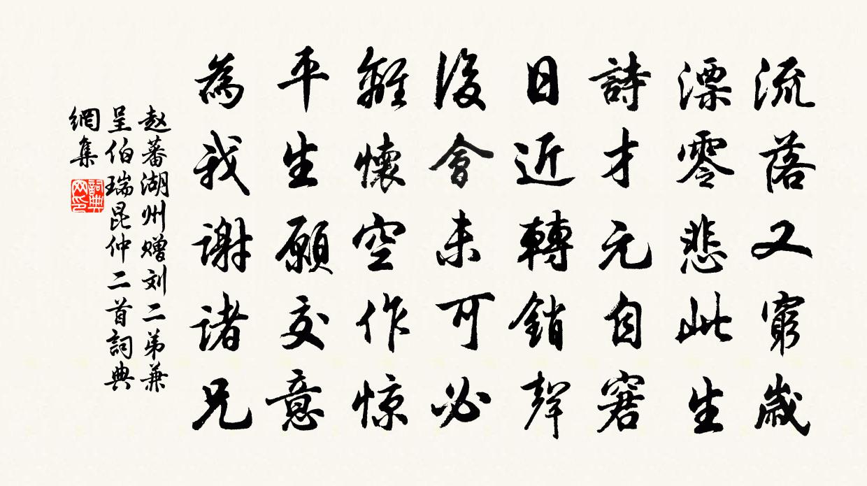 詩詞名句歷史字典書法欣賞書法字典國語詞典說文解字康熙字典古漢語字典標 題 作 者 詩 句 湖州贈劉二弟兼呈伯瑞昆仲二首作者:趙蕃 朝代:宋代原文流落又窮歲,漂零悲此生。詩才元自窘,日近轉銷聲。後會未可必,離懷空作驚。平生願交意,為我謝諸兄。詩詞問答問:《湖州贈劉二弟兼呈伯瑞昆仲二首》的作者是誰?答:趙蕃問:該詩寫於哪個朝代?答:宋代書法欣賞湖州贈劉二弟兼呈伯瑞昆仲二首書法作品詩詞推薦詰燕戴復古〔宋代〕去年汝來巢我屋,梁間污泥高一尺。啄腥拋穢不汝厭,生長群雛我護惜。家貧惠愛不及人,自謂於汝獨有力。不望奉和夏日晚景應詔楊師道〔唐代〕輦路夾垂楊,離宮通建章。日落橫峰影,雲歸起夕涼。雕軒動流吹,羽蓋息回塘。剃草生還綠,殘花落尚香。青岩潤州韓維〔宋代〕雄風搖碧綠,畫角吊黃昏。一帶分江記,雙峰點海門。朝陽穿破衲贊釋慧開〔宋代〕冷時急用之物,趁暖著些針線。忽然臘月到來,免致腳忙手亂。阻風鍾家村觀岸傍物花二首楊萬里〔宋代〕水蟲才出綠波來,細看爬沙上石崖。化作蜻蜓忽飛去,幾時飛去卻飛回。久不得張喬訊息(一本題下有有寄二字)鄭谷〔唐代〕天末去程孤,沿淮復向吳。亂離何處甚,安穩到家無。樹盡雲垂野,檣稀月滿湖。傷心繞村落,應少舊耕夫。送饒州周沃秀才免解蘇轍〔宋代〕少年工作賦,中歲復窮經。驥老終知道,劍埋新發硎。束裝鄰里助,答策友朋聽。還似臨淄貢,隨風起北溟。雪中登淨遠亭四首楊萬里〔宋代〕忍卻清寒得得來,不堪騎吏苦相催。鴈穿銀 * 中去,人到水晶宮裡回。鶴李中〔唐代〕九皋羽翼下晴空,萬里心難駐玉籠。清露滴時翹蘚徑,白雲開處唳松風。歸當華表千年後,怨在瑤琴別操中。好共同官醵呈林簽判曾豐〔宋代〕廣南一路逢春早,幕下諸公醵飲遲。莊蝶舞風忙似我,杜鵑啼月怨歸誰。梅兄樊弟風流態,魏後姚王富貴姿。過去次韻虛谷和長兒奉別陳著〔宋代〕有便勤相問,何時得近依。詩搜腸藿瘦,字為眼花肥。雲遠心猶遠,春歸人未歸。羨君牢閉戶,珍重白山衣。元夕偶成蘇籀〔宋代〕里唱塗謳鐃吹轟,軟塵梁苑記前生。寶珠穿蟻嬉遊肆,蓮蕊然犀 * 。透碗燈繁人晝繡,隔羅光醖酒澠清。春娃紀事文天祥〔宋代〕慷慨輕身墮蒺藜,羝羊生乳是歸期。豈無從史私袁盎,恨我從前少侍兒。薄媚 西子詞董穎〔宋代〕自笑平生,英氣凌雲,凜然萬里宣威。那知此際。熊虎塗窮,來伴麋鹿卑棲。既甘臣妾,猶不許,何為計。爭若都酒泉子 月波秋霽(在縣西城堞上下嵌金)吳鎮〔元代〕粉堞危樓,闌下波光搖月色,金魚池畔草蒙茸。荒圃瞰樓東。亭亭遙峙梁朝檜。屈曲槎*接蒼翠。獨憐天際欠青山西江月 四寶王哲〔元代〕堪嘆筆硯紙墨,結繩制度規模。尋常寫染永成書。偏稱文房註疏。獨我搖頭不管,教大記錄元初。靈光一點便開舒念奴嬌 憶仲良劉因〔元代〕中原形勢,壯東南、夢裡譙城秋色。萬水千山收拾就,一片空梁落月。煙雨松楸,風塵淚眼,滴盡青青血。平生不與蘇州守十詩以兵衛森畫戟燕寢凝清香為韻周麟之〔宋代〕吳山濯濯煙鬟青,湖水練練光繞城。城中主人目如電,爽氣坐納山水清。千門鳴弦夜月靜,四野垂穎秋雲平。試占游廬山慧遠〔魏晉〕崇岩吐氣清,幽岫棲神跡。希聲奏群籟,響出山溜滴。有客獨冥游,逕然忘所適。揮手撫雲門,靈關安足辟?流心題梅無名〔元代〕北風獵獵吹人倒,千卉千葩盡枯槁。誰分清氣到寒梅,獨放銀花照晴昊。名句推薦門外垂楊岸側,畫橋誰系蘭舟。万俟詠《木蘭花慢·恨鶯花漸老》 江南無所有,聊贈一枝春。陸凱《贈范曄詩》 酒闌更喜團茶苦,夢斷偏宜瑞腦香。李清照《鷓鴣天·寒日蕭蕭上瑣窗》 相思謾然自苦,算雲煙、過眼總成空。戴復古《木蘭花慢·鶯啼啼不盡》 狎興生疏,酒徒蕭索,不似少年時。柳永《少年游·長安古道馬遲遲》 一條藤徑綠,萬點雪峰晴。李白《冬日歸舊山》 還怕掩、深院梨花,又作故人清淚。吳文英《無悶·催雪》 待到山花爛漫時,她在叢中笑。 * 《卜運算元·詠梅》 楚王好細腰,宮中多餓死。佚名《無題》 思爾為雛日,高飛背母時。白居易《燕詩示劉叟》