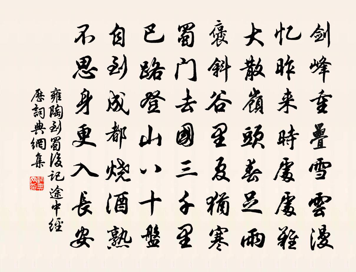 詩詞名句歷史字典書法欣賞書法字典國語詞典說文解字康熙字典古漢語字典標 題 作 者 詩 句 到蜀後記途中經歷作者:雍陶 朝代:唐代到蜀後記途中經歷原文劍峰重疊雪雲漫,憶昨來時處處難。大散嶺頭春足雨,褒斜谷里夏猶寒。蜀門去國三千里,巴路登山八十盤。自到成都燒酒熟,不思身更入長安。詩詞問答問:到蜀後記途中經歷的作者是誰?答:雍陶問:到蜀後記途中經歷寫於哪個朝代?答:唐代問:到蜀後記途中經歷是什麼體裁?答:七律雍陶到蜀後記途中經曆書法欣賞到蜀後記途中經曆書法作品注釋全唐詩:卷518-22詩詞推薦寄李縵仲淵石介〔宋代〕喑吁嘻!屈原放,賈誼投,晦之流,子望囚。古人今人皆不免,才能累身才反仇。吾友仲淵少學古,胸中疏落羅孔揚州選蒙相公賞判雪後呈上崔峒〔唐代〕自得山公許,休耕海上田。慚看長史傳,欲棄釣魚船。窮巷殷憂日,蕪城雨雪天。此時瞻相府,心事比旌懸。感皇恩(解秀州郡印,次王倅·韻)毛滂〔宋代〕兩歲撫邦人,曾無恩意。別後何人更相記。題輿玉樹,愧與蒹葭相倚。殷勤猶念我,同吟醉。畫舸相追,孤城已閉再和十首蘇轍〔宋代〕江上孤城面面山,居人也自不曾閒。蜂游蟻聚知何事,日夜長橋南北間。正月十日作宋庠〔宋代〕萬里春暉盪曉空,芳心何處不融融。惟餘兩鬢無情雪,最耐人間解凍風。李季允作吞雲樓索詩和總漕韻答之魏了翁〔宋代〕柵新飛觀走狐嗥,樓鶴洲鸚賀此遭。整暇旌旗登巀頁,奔波舟楫笑嗷嘈。宅中平後規摹拓,燭理明時運量高。須信金盞子王吉昌〔元代〕翠嵐時,疑晴之誤綠波清。光浮草屋松窗靜。*旋著,膝琴橫。閒唱詠,愜真情。貧自樂,勝公卿。寵無榮。辱無九疊劉克莊〔宋代〕貴家選色斛量珠,洗盡鉛華絕代無。老子效顰聊復爾,名崑崙婢作瓊奴。同餘汝霖游西湖觀天竺觀音永懷林和靖三絕胡寅〔宋代〕岩前晴日蔭樹,林下微風來蘭。臨水更無塵想。望雲時有遐觀。次韻元厚之少保留題朱伯原秘校園亭三首程師孟〔宋代〕君家幽寂似山家,聞者其誰不見嗟。閉戶幾多閒日月,掃園有限舊煙花。書窗燕坐琴橫石,吟徑徐行杖卓沙。壁有句崔子方〔宋代〕白日行空闊,青燈耿夜闌。偈頌一百二十三首釋普度〔宋代〕春風卷春雨,春樹生春煙。作家相見不談禪。天寒燒榾柮,雲外煮清泉。更有一般風味在,從來附子出西川。章氏郡君輓詞蘇轍〔宋代〕馮唐垂老郎潛後,李白風流罷直余。解組同歸榮故國,剖符仍得奉安輿。家聲未替三公舊,葬客應傾數郡車。德映清暉亭葉茵〔宋代〕半點囂塵不敢留,清光野色自浮游。一泉走石夜多雨,萬竹圍松風似秋。剩喜有詩堪獻佛,從教無骨可封侯。上人次韻謝夏自然見寄四首方回〔宋代〕與子俱逢掖,寒瓢共碧流。歙今全似魯,睦亦盛於鄒。竹屋南溪外,風帆古渡頭。相尋欠相遇,遄復墮音郵。彼農二章陸龜蒙〔唐代〕世路澆險,淳風盪除。彼農家流,猶存厥初。藁焉而席,茨焉而居。首亂如葆,形枯若腒。大耋既鮐,童子未□。相見歡朱敦儒〔宋代〕吟蛩作盡秋聲。月西沈。淒斷餘香殘夢、下層城。人不見。屏空掩。數殘更。還自搴帷獨坐、看青燈。商婦詞十首劉克莊〔宋代〕圖南倭舶透,敗北榷場開。妾貌不長好,君行何日回。將拆舊屋權住西廊蘇轍〔宋代〕平生未有三間屋,今歲初成百步廊。欲趁閒年就新宅,不辭暑月臥斜陽。修篁已謝前人種,甘井何妨眾口嘗。奔走壯別梁啓超〔清代〕極目鑒八荒,淋漓幾戰場。虎皮蒙鬼蜮,龍血混玄黃。世紀開新幕,風潮集遠洋。欲閒閒未 , 橫槊數興亡。名句推薦害人之心不可有,防人之心不可無!佚名《增廣賢文·下集》 此去與師誰共到,一船明月一帆風。韋莊《送日本國僧敬龍歸》 與朋友論學,須委曲謙下,寬以居之。王陽明《傳習錄·卷下·門人陳九川錄》 跨馬出郊時極目,不堪人事日蕭條杜甫《野望》 猿啼客散暮江頭,人自傷心水自流。劉長卿《重送裴郎中貶吉州》 雁行緣石徑,魚貫度飛梁。鮑照《代出自薊北門行》 深村時節好,應為去年豐。范成大《寒食郊行書事》 媼引濃妝女,兒扶爛醉翁。范成大《寒食郊行書事》 向露冷風清,無人處,耿耿寒漏咽。周邦彥《浪淘沙慢·曉陰重》 借問漢宮誰得似,可憐飛燕倚新妝。李白《清平調·其二》