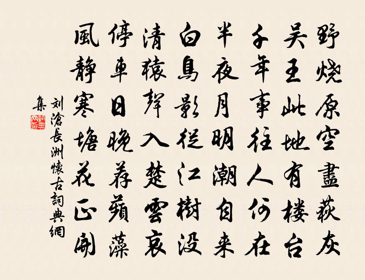 詩詞名句歷史字典書法欣賞書法字典國語詞典說文解字康熙字典古漢語字典標 題 作 者 詩 句 長洲懷古作者:劉滄 朝代:唐代長洲懷古原文野燒原空盡荻灰,吳王此地有樓台。千年事往人何在,半夜月明潮自來。白鳥影從江樹沒,清猿聲入楚雲哀。停車日晚薦蘋藻,風靜寒塘花正開。詩詞問答問:長洲懷古的作者是誰?答:劉滄問:長洲懷古寫於哪個朝代?答:唐代問:長洲懷古是什麼體裁?答:七律劉滄長洲懷古書法欣賞長洲懷古書法作品注釋全唐詩:卷586-1詩詞推薦閻立本職貢圖蘇軾〔宋代〕貞觀之德來萬邦,浩如滄海吞河江,音容傖獰服奇龐。橫絕嶺海逾濤瀧,珍禽瑰產爭牽扛,名王解辮卻蓋幢。粉本宣州東峰亭各賦一物得古壁苔劉太真〔唐代〕苒苒溫寒泉,綿綿古危壁。光含孤翠動,色與暮雲寂。深淺松月間,幽人自登歷。偈頌五十一首釋大觀〔宋代〕行不到處行一步,甜瓜徹蒂甜。說不到處說一句,苦瓠連根苦。掃盡從前閒佛祖,發機須是千鈞穹。偈頌二十四首釋智遇〔宋代〕日出而作,日入而息。熙熙然如登春台,且道承誰恩力。寓言劉克莊〔宋代〕夢裡依稀若在傍,安知覺後忽他鄉。裁成出戌衣封去,挑就回紋錦寄將。多謝舊官留破鏡,半為盪子守空房。偶逢別洞庭維諒上人皎然〔唐代〕白雲關我不關他,此物留君情最多。情著春風生橘樹,歸心不怕洞庭波。題五松驛李涉〔唐代〕雲木蒼蒼數萬株,此中言命的應無。人生不得如松樹,卻遇秦封作大夫。虎跑泉廖顒〔宋代〕真馭遺蹤古,寒泉瀉石清。養源人莫測,流潤濟蒼生。書懷戴栩〔宋代〕隨牒滄海隅,兩見初月吐。緬懷故山友,飄散等風雨。低頭繙簿書,仄足隨步武。荒哉舊時學,千古壓一縷。涇渭觀山四首陳造〔宋代〕山如豪俊{上四下各}方隅,傲睨驕蹇未受拘。為著孤亭凌縹渺,至今端委正衙趨。鞏采若府推母錢夫人挽章二首呂祖謙〔宋代〕內助功推冠,名成父子間。中原遺俗盡,舊族素風還。石窌天開邑,宮門日綴班。光華竟何許,夕照在西山。風流子(聞桂花懷西湖)翁元龍〔宋代〕天闊玉屏空。輕陰弄、淡墨畫秋容。正涼掛半蟾,酒醒窗下,露催新雁,人在山中。又一片,好秋花占了,香換卻對鏡白居易〔唐代〕三分鬢髮二分絲,曉鏡秋容相對時。去作忙官應太老,退為閒叟未全遲。靜中得味何須道,穩處安身更莫疑。若使平旦釋文珦〔宋代〕平旦氣偏清,境界復深窔。初日上東溟,高峰最先照。會意髮長吟,何似蘇門嘯。不必諧宮商,自是山中調。王處士輓詩魏了翁〔宋代〕權籬山下屋,桐帽水邊村。遺子方寸地,傳家廿四言。芳蓀生夕秀,衰柳帶秋昏。千古堂堂恨,青雲落淚痕。附:軒詩王軒〔唐代〕佳人去千載,溪山久寂寞。野水浮白煙,岩花自開落。猿鳥舊清音,風月閒樓閣。無語立斜陽,幽情入天幕。敬思堂四言周文璞〔宋代〕有亭央央,高丘之傍。父兮母兮,堅深埋藏。廈屋淒涼,宰木成行。春秋蒸嘗,酒漿牛羊。身體俯傴,雖勞弗彰。寓興七首魏野〔宋代〕天地勞覆載,日月勞往還。此尚不能息,何況在其間。鳥獸飲食外,悠悠無食慳。如何人異此,晝夜機相關。顧我祝英台近·除夜立春吳文英〔宋代〕翦紅情,裁綠意,花信上釵股。殘日東風,不放歲華去。有人添燭西窗,不眠侵曉,笑聲轉、新年鶯語。舊尊俎。己亥歲感事崔塗〔唐代〕正聞青犢起葭萌,又報黃巾犯漢營。豈是將皆無上略,直疑天自棄蒼生。瓜沙舊戍猶傳檄,吳楚新春已廢耕。見說名句推薦他鄉共酌金花酒,萬里同悲鴻雁天。盧照鄰《九月九日玄武山旅眺》 蘭舟斜纜垂揚下,只宜輔枕簟向涼亭披襟散發。白樸《得勝樂·夏》 賢達哀樂,不在窮通禍福之間。脫脫《遼史·列傳·卷三十四》 夕陽西下,斷腸人在天涯。馬致遠《天淨沙·秋思》 王侯將相寧有種乎?司馬遷《史記·陳涉世家》 志意修則驕富貴,道義重則輕王公。荀子《荀子·修身》 辜負我,悔憐君,告天天不聞。牛嶠《更漏子·春夜闌》 一樹春風千萬枝,嫩於金色軟於絲。白居易《楊柳枝詞》 晚風庭院落梅初。淡雲來往月疏疏。李清照《浣溪沙·髻子傷春慵更梳》 盡道隋亡為此河,至今千里賴通波。皮日休《汴河懷古二首》