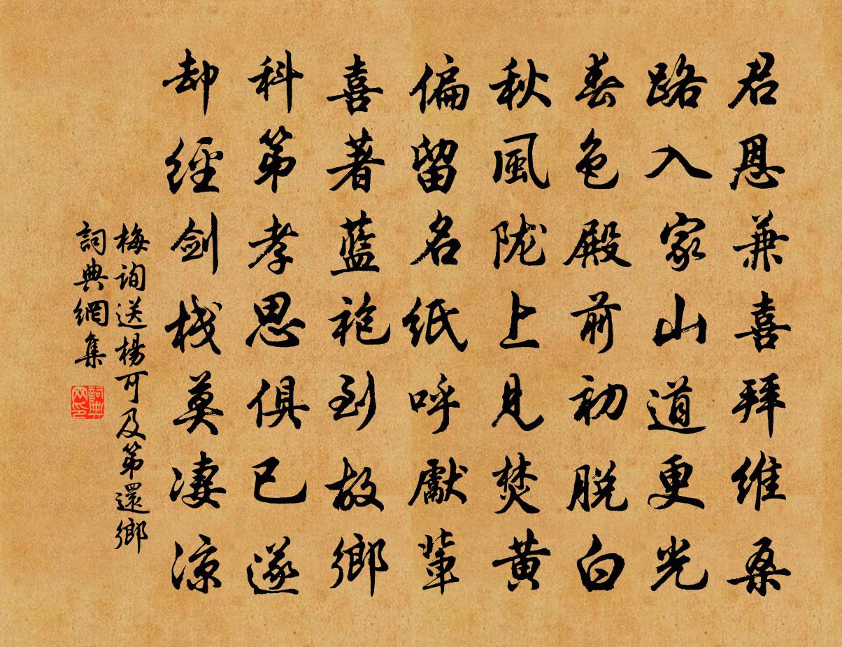 詩詞名句歷史字典書法欣賞書法字典國語詞典說文解字康熙字典古漢語字典標 題 作 者 詩 句 送楊可及第還鄉作者:梅詢 朝代:宋代送楊可及第還鄉原文君恩兼喜拜維桑,路入家山道更光。春色殿前初脫白,秋風隴上見焚黃。偏留名紙呼先輩,喜著藍袍到故鄉。科第孝思俱已遂,卻經劍棧莫淒涼。詩詞問答問:送楊可及第還鄉的作者是誰?答:梅詢問:送楊可及第還鄉寫於哪個朝代?答:宋代梅詢送楊可及第還鄉書法欣賞送楊可及第還鄉書法作品詩詞推薦仙壇蜀僧〔宋代〕萬疊峰巒聳太清, * 曾此會方平。一從宴罷歸何處,寶殿瑤台空月明。答微之見寄(時在郡樓對雪)白居易〔唐代〕可憐風景浙東西,先數餘杭次會稽。禹廟未勝天竺寺,錢湖不羨若耶溪。擺塵野鶴春毛暖,拍水沙鷗濕翅低。更對偶成曹彥約〔宋代〕莫鈄愛敬復雕鐫,一片真純得自全。待得將心去鉤索,旋栽荊棘向芝田。武夷歌白玉蟾〔宋代〕天下武夷兮第一山溪,升真有洞兮大王天柱交相齊。不知何年中秋兮玉帝賜宴會曾孫,幔亭結雲霞兮彩橋跨虹霓。巫山一段雲馬鈺〔元代〕玉女開金殿,金公鎖玉關。真清真淨養胎仙。雲透坎離間。貪看靈光上下。忘了之乎也者。神珠吐出九般霞。跨鶴老饞姜特立〔宋代〕八十血氣衰,交累身口故。喜讀奉親書,竅誦老饕賦。烹飪付家人,甘旨輒復具。爛軟既適宜,調芼亦合度。兒女答陳珍劉克莊〔宋代〕寂寂少游從,斯人未易逢。清貧今仲子,疏雋小元龍。君謹提詩筆,吾當避箭鋒。勉旃鳴盛世,切勿效寒蛩。辨蟲老嫩賈似道〔宋代〕要知促織與蒼雛,秘訣分明在兩須。貼齒老黃生日久,懸牙如玉離泥初。頭高必定無心鬭,埋首人稱老野狐。有此送張少府錢起〔唐代〕愁雲破斜照,別酌勸行子。蓬驚馬首風,雁拂天邊水。寸晷如三歲,離心在萬里。題龍眠畫騎射拖毬戲樓鑰〔宋代〕綠楊幾枝插平沙,柔梢裊裊隨風斜。紅綃去地不及尺,錦袍壯士斫鬃射。橫磨箭鋒滿分靶,一箭正截紅綃下。前騎立春前二日雪王禹偁〔宋代〕一夕滿淮海,莎階曉欲平。氣寒知臘在,勢猛共春爭。飄泊殘梅妬,龍鍾老檜擎。隨風無定態,入竹有繁聲。倚檻送厲校書從事鳳翔許棠〔唐代〕赴辟依丞相,超榮事豈同。城池當隴右,山水是關中。日有來巴使,秋高出塞鴻。旬休隨大旆,應到九成宮。移合浦郭功甫見寄蘇軾〔宋代〕君恩浩蕩似陽春,合浦何如在海濱。莫趁明珠弄明月,夜深無數採珠人。秋日憶家張耒〔宋代〕汩汩流光長遠客,年年秋至是離家。孤城入夜寒更迥,霜月滿天歸夢賒。摵摵老桐風后葉,娟娟疏菊雨殘花。茅檐水調歌頭祖吳〔宋代〕佳麗東陽境,瑞氣曉籠晴。中元逾了十日,上相喜重生。四海文章宗匠,百裡弦歌德化,官與水雙清。懇切勸分意秋夕杜牧〔唐代〕紅燭秋光冷畫屏,輕羅小扇撲流螢。天階夜色涼如水,坐看牽牛織女星。閒居白居易〔唐代〕風雨蕭條秋少客,門庭冷靜晝多關。金羈駱馬近賣卻,羅袖柳枝尋放還。書卷略尋聊取睡,酒杯淺把粗開顏。眼昏山中春懷齊己〔唐代〕心魂役役不曾歸,萬象相牽向極微。所得或憂逢郢刃,凡言皆欲奪天機。游深晚谷香充鼻,坐苦春松粉滿衣。何物壬辰日蝕陳普〔宋代〕憶昔度宗皇帝時,十年十三日食之。似道屓贔湖海曲,天 * 庭耽樂嬉。滿朝翕翕皆婦人,禍來照鏡方畫眉。北軍擬意李商隱〔唐代〕悵望逢張女,遲回送阿侯。空看小垂手,忍問大刀頭。妙選茱萸帳,平居翡翠樓。雲屏不取暖,月扇未遮羞。上掌名句推薦春風對青冢,白日落梁州。張喬《書邊事》 記得去年今夕,釃酒溪亭,淡月雲來去。文徵明《念奴嬌·中秋對月》 黃鶯也愛新涼好,飛過青山影里啼。徐璣《新涼》 池邊釣女日相隨,妝成照影竟來窺孟浩然《高陽池送朱二》 飄飄何所似,天地一沙鷗。杜甫《旅夜書懷》 縱明月相思千里隔。夢咫尺。勤書尺。賀鑄《琴調相思引·送范殿監赴黃崗》 悠悠卷旆旌,飲馬出長城。李世民《飲馬長城窟行》 別離在今晨,見爾當何秋。韋應物《送楊氏女》 不積跬步,無以致千里;不積小流,無以成江海。李昉、李穆、徐鉉《太平御覽·學部·卷一》 念蘭堂紅燭,心長焰短,向人垂淚。晏殊《撼庭秋·別來音信千里》